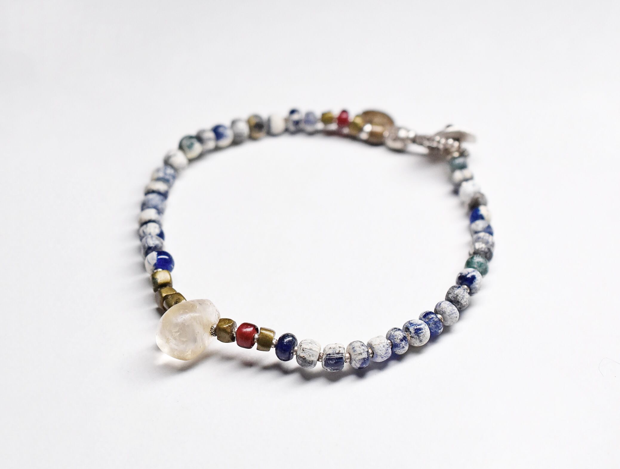 雫型古代水晶と、出土ビーズと金赤ホワイトハーツ、oldオリッサブラスのブレス