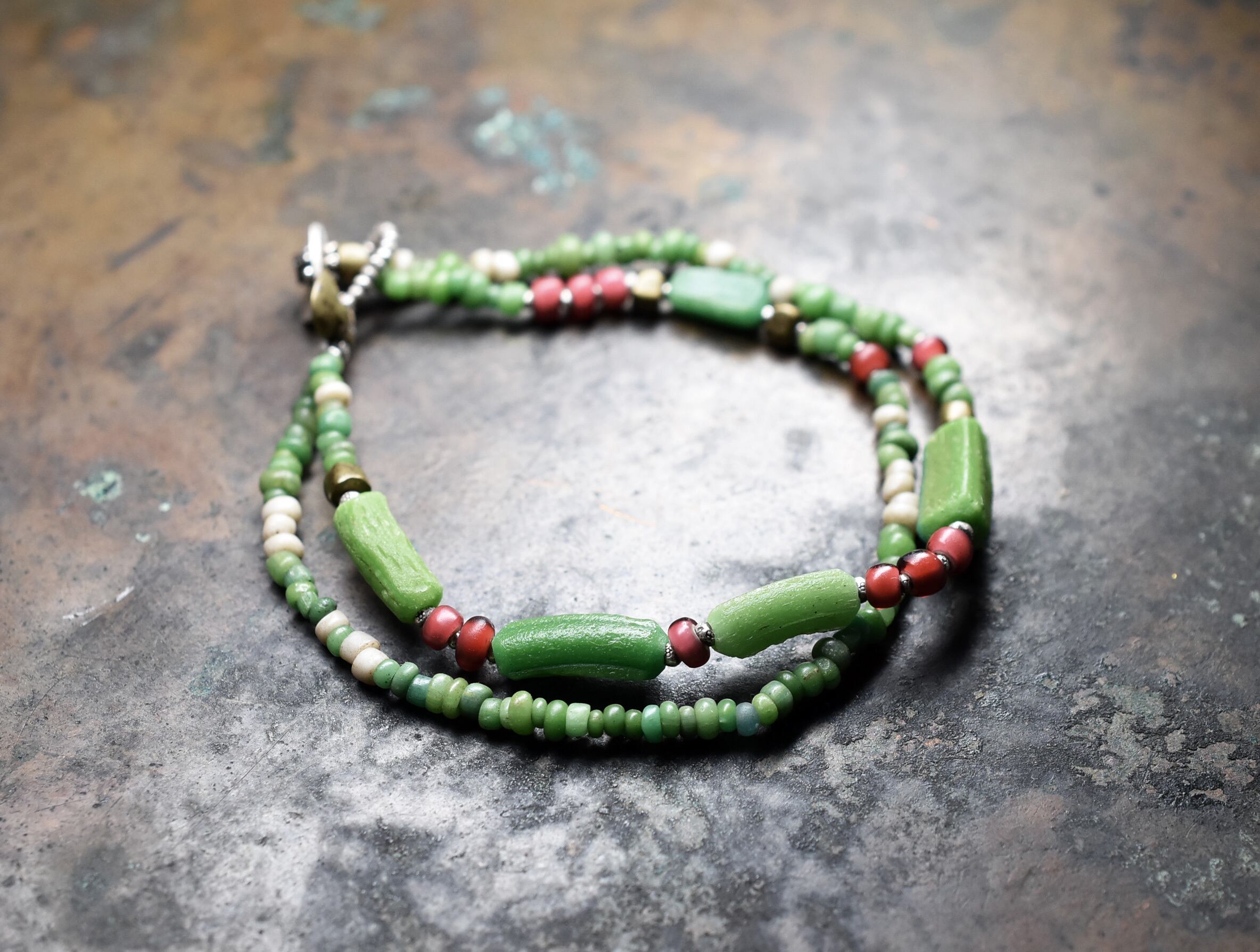 翡翠色アンティークビーズ、ローマングラス、金赤ホワイトハーツの2連ブレス