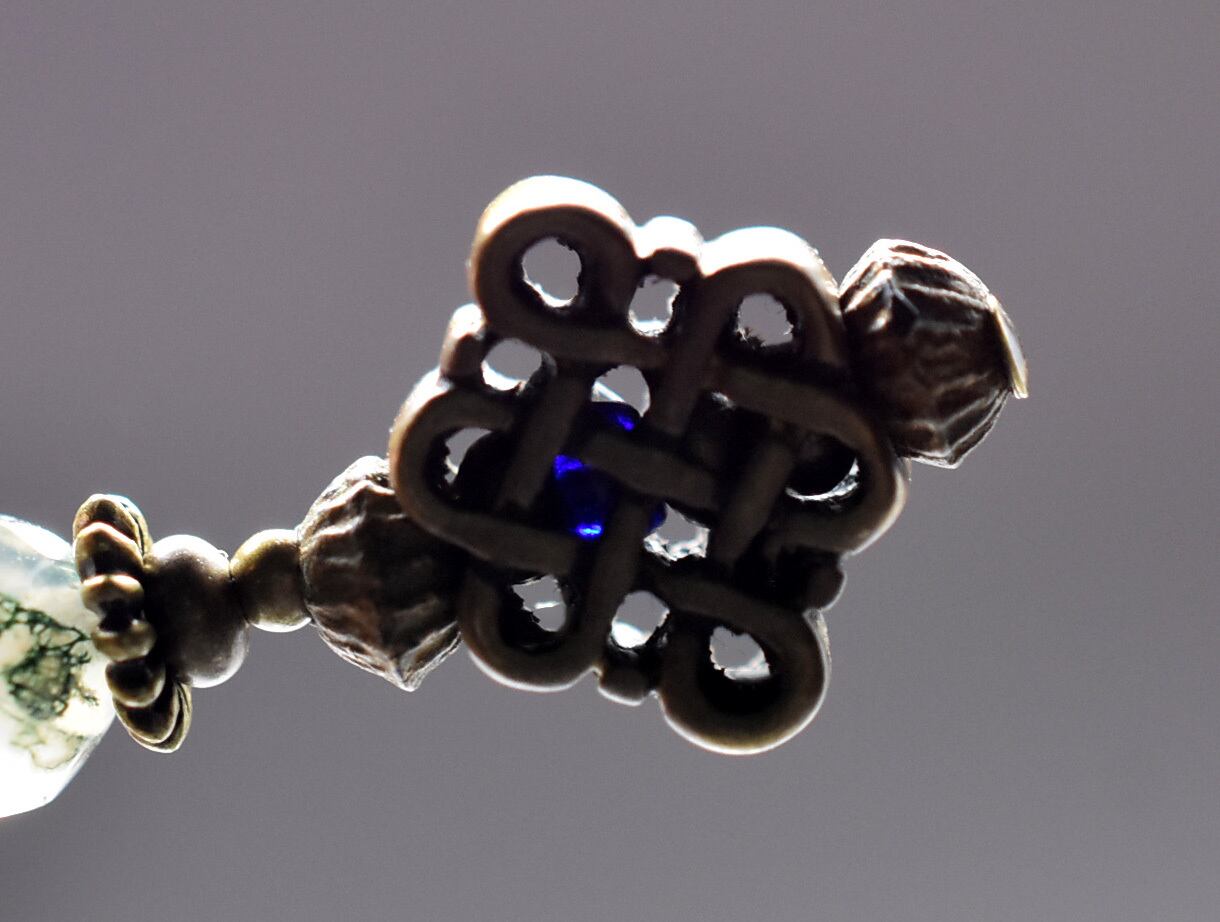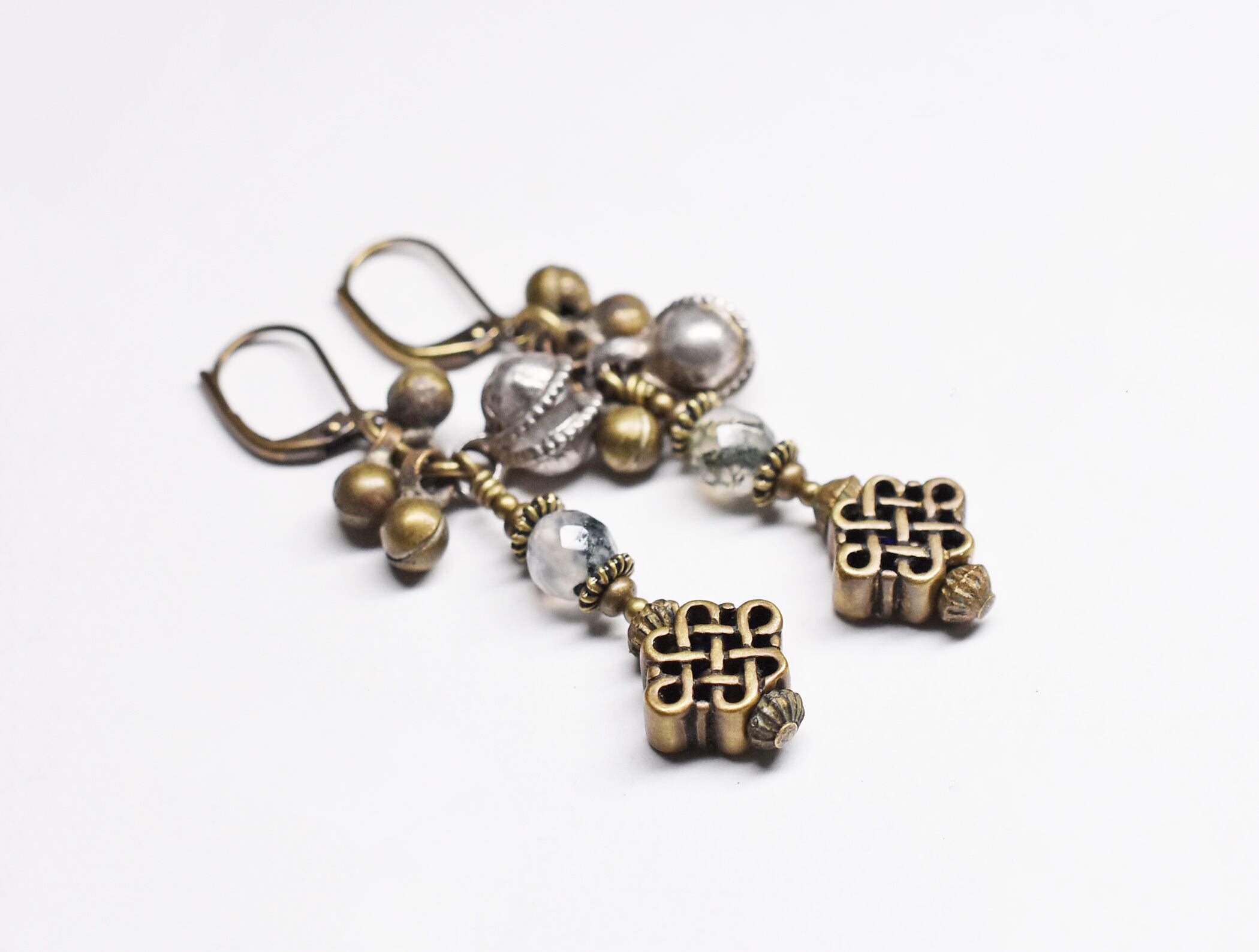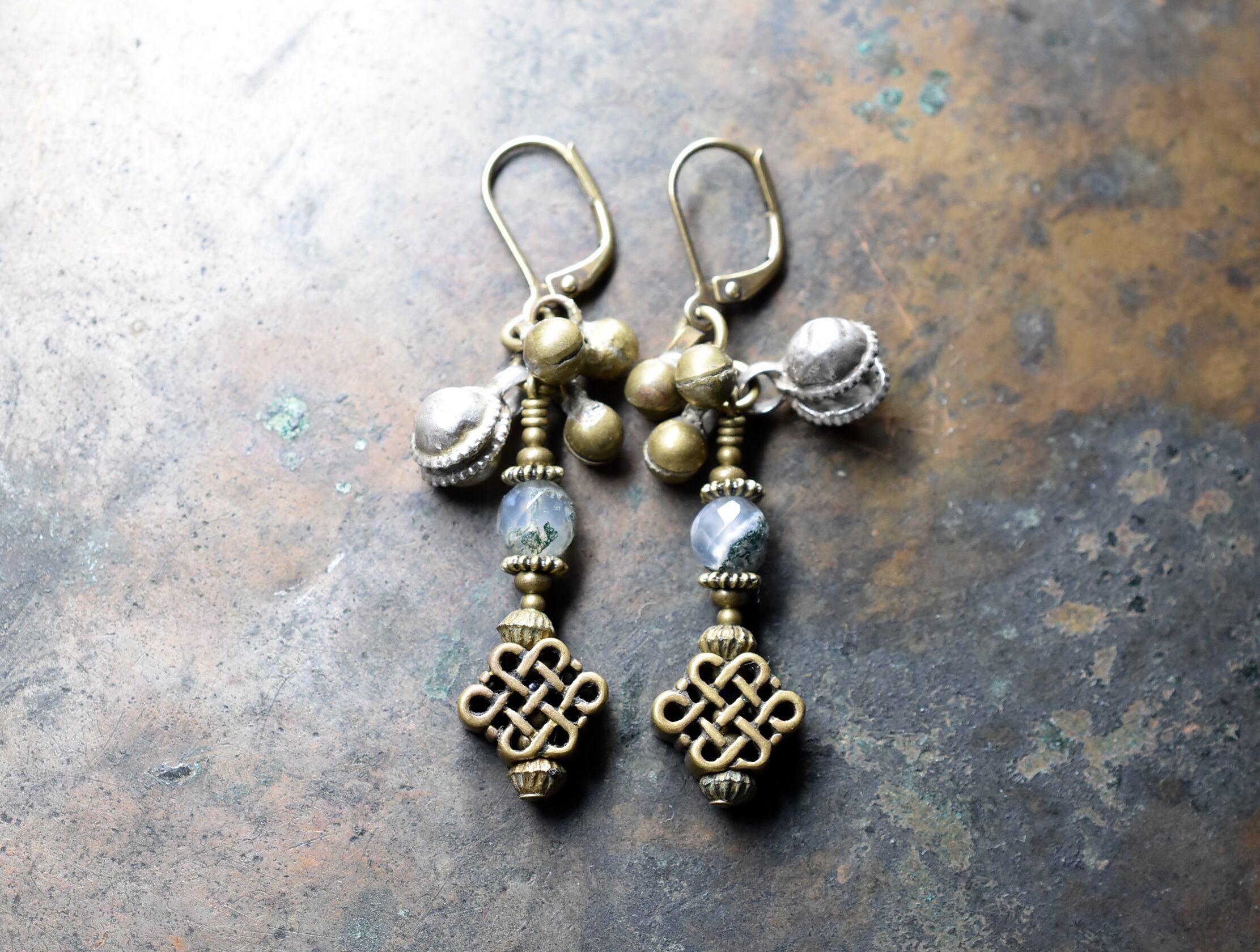 真鍮製のエンドレスノットと、インディアンアゲート、鈴を繋いだピアスです。