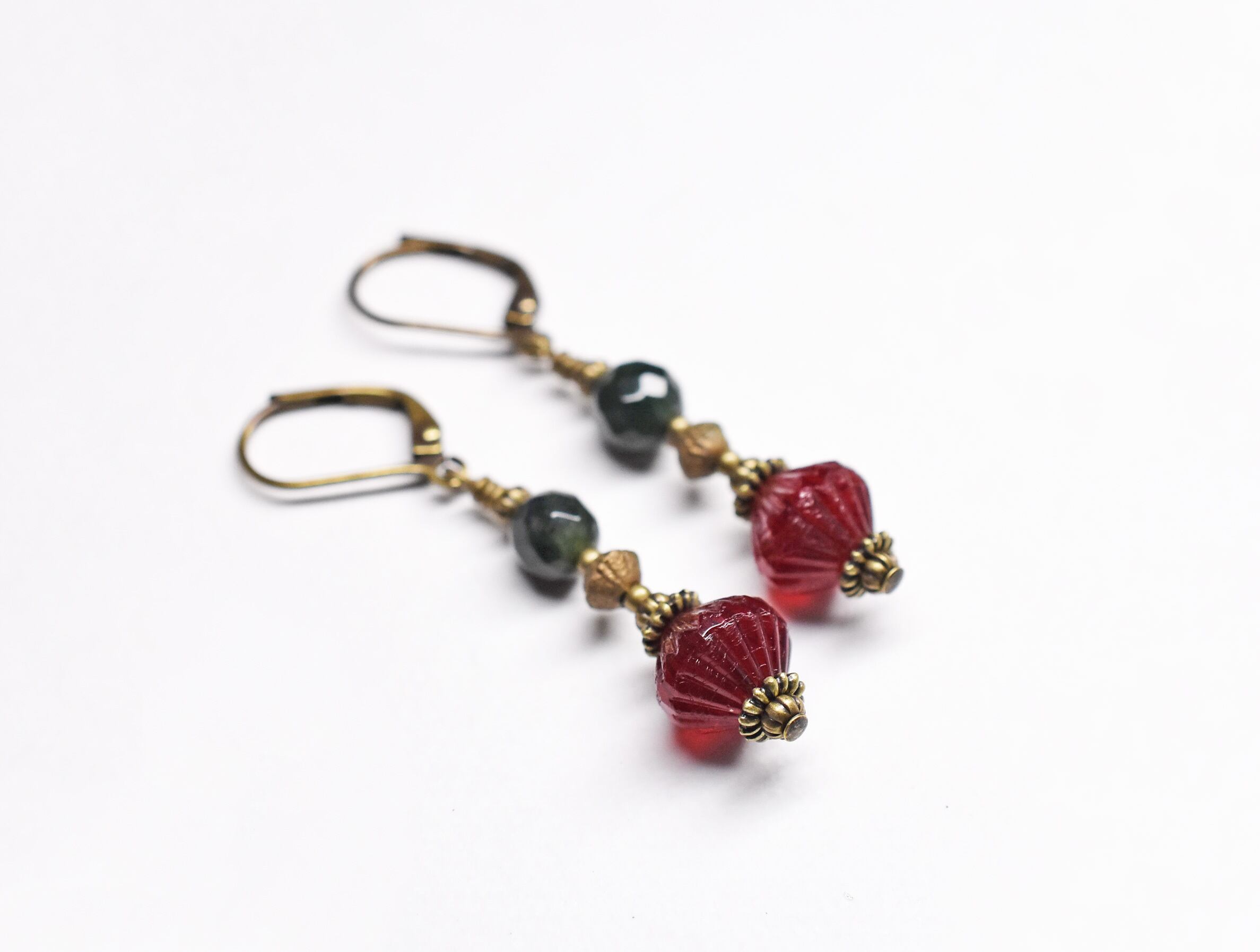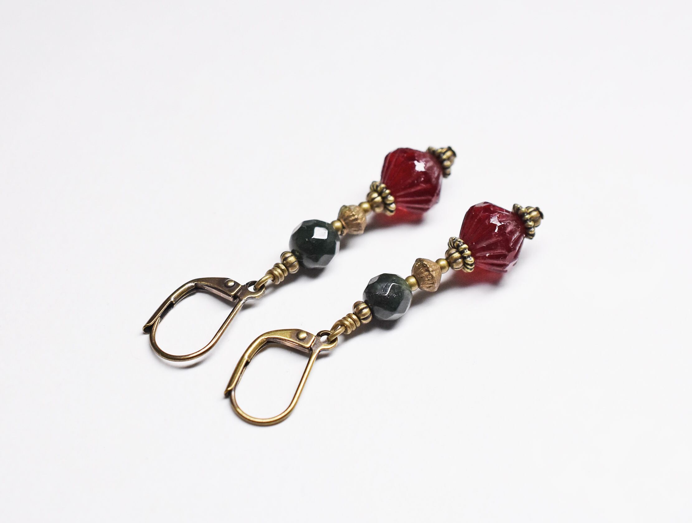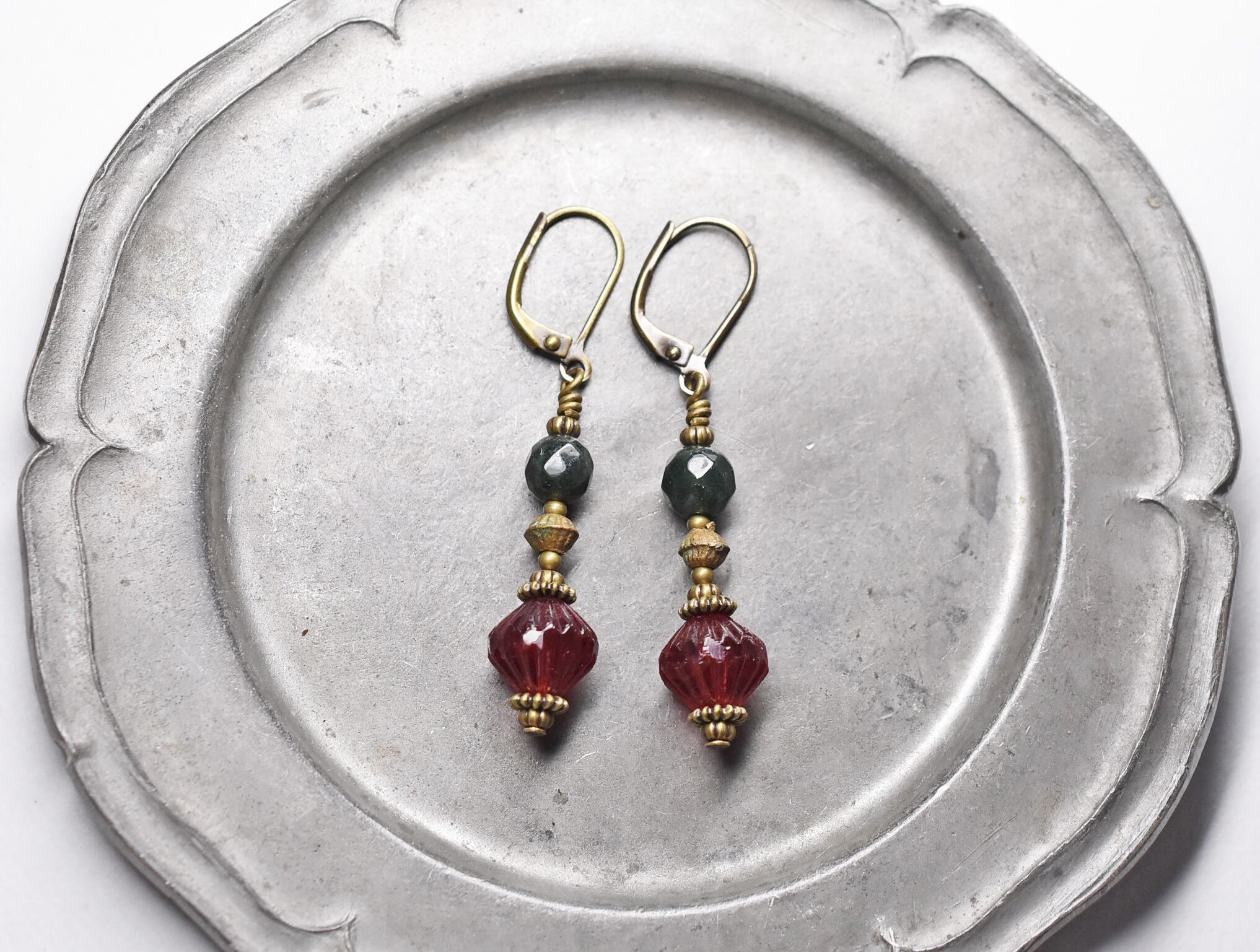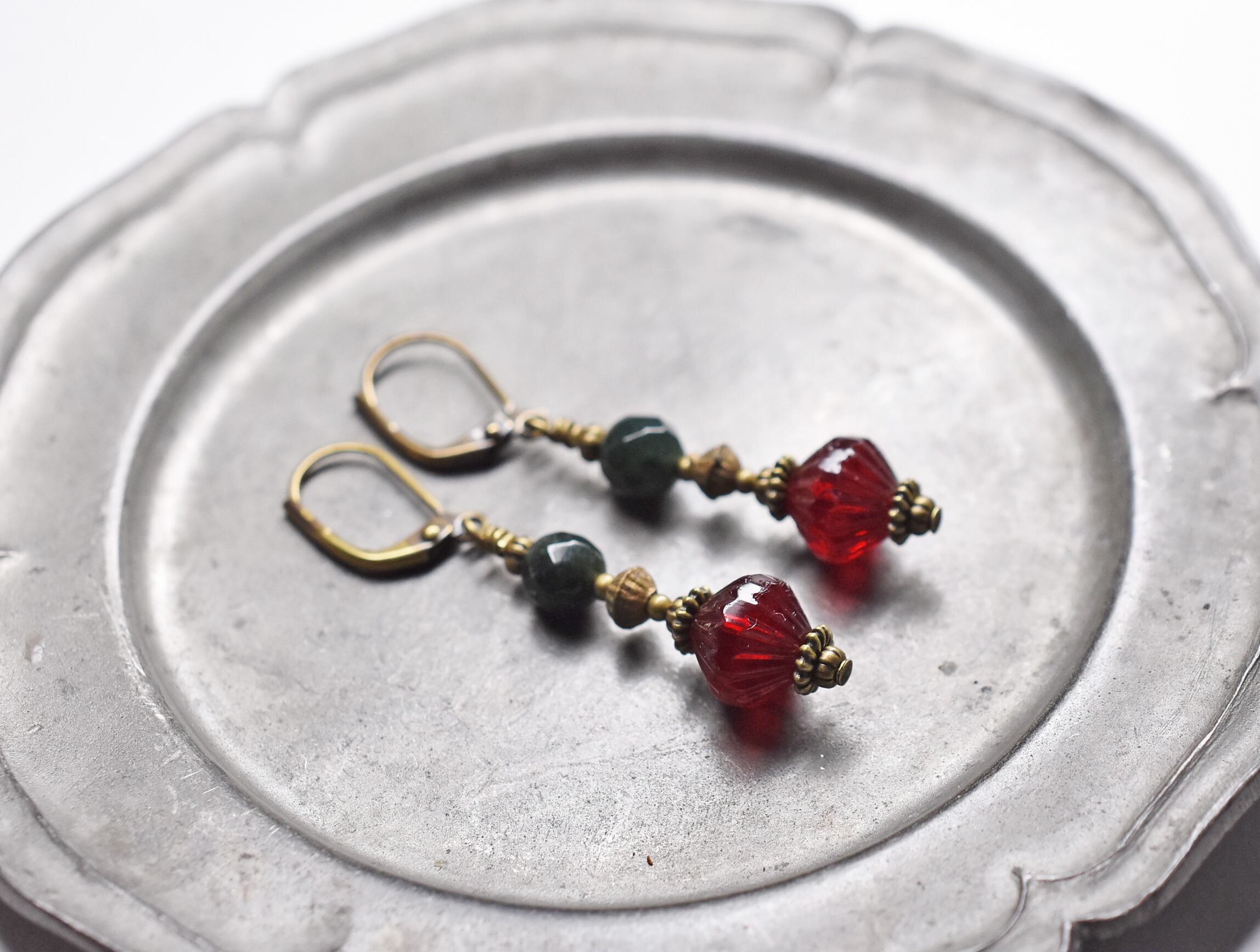 ダークレッドドイツヴィンテージビーズと、インディアンアゲートのピアス