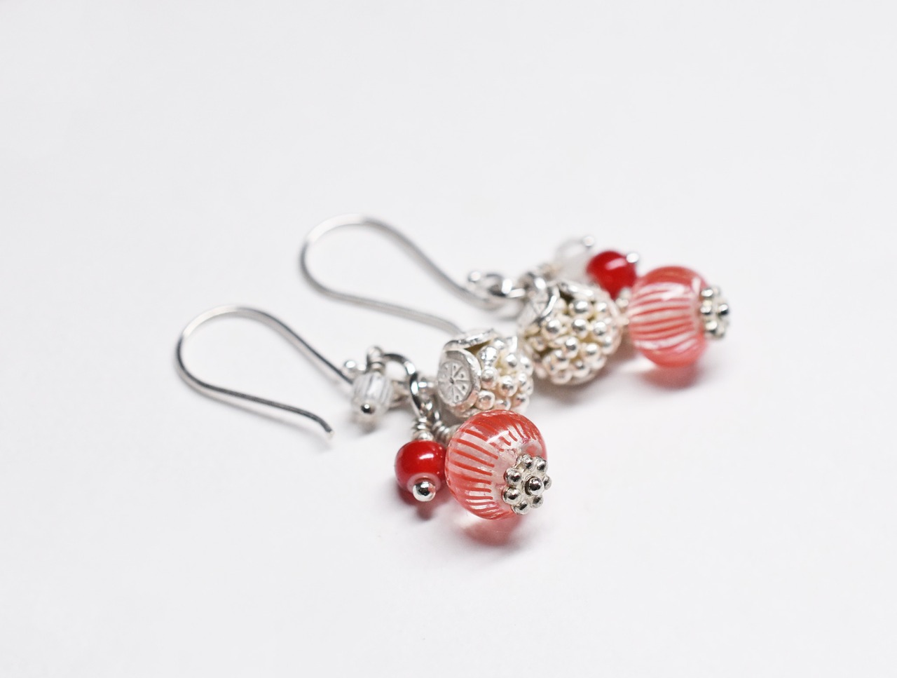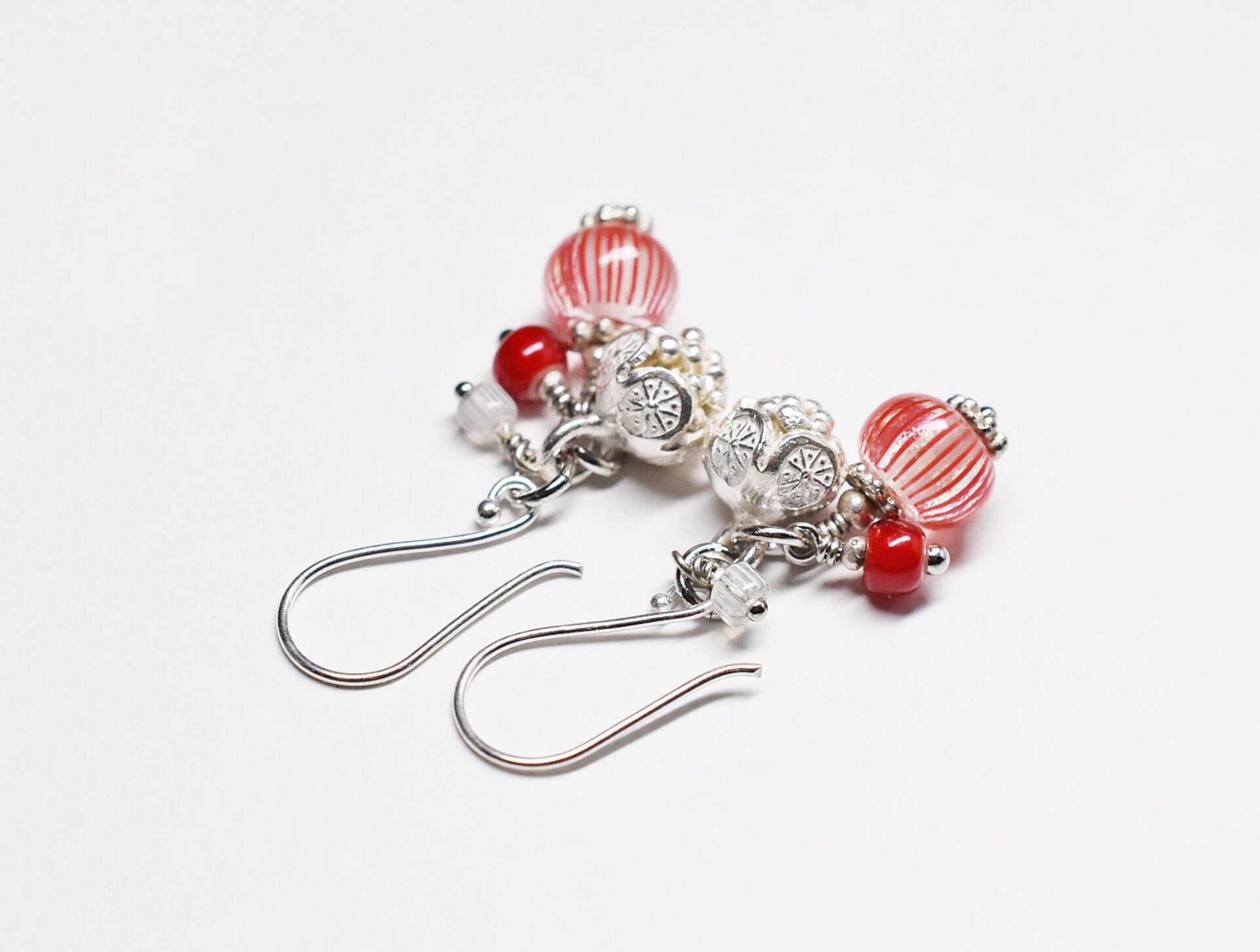 ストライプ模様のアンティークビーズと、木の実のような真っ赤なアンティークビーズ、小さなグーズベリー、カレンシルバーチャームを繋いだピアスです。