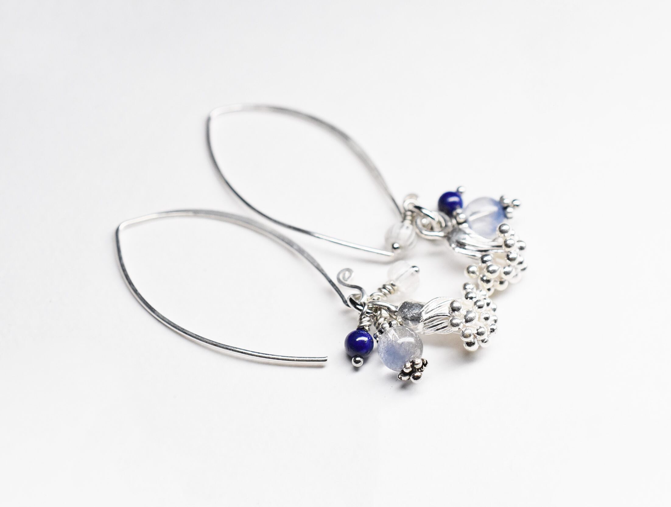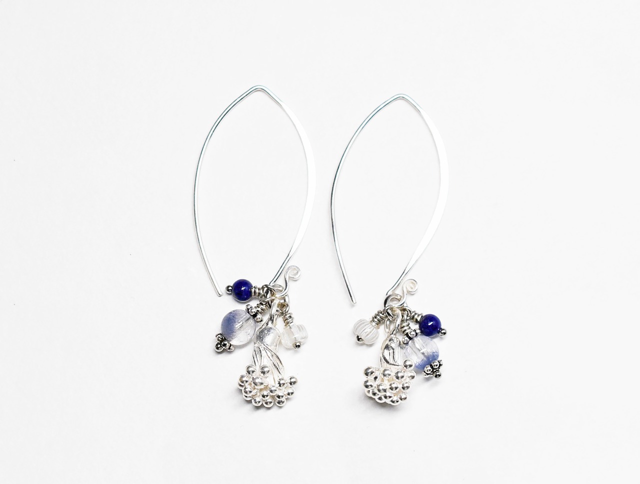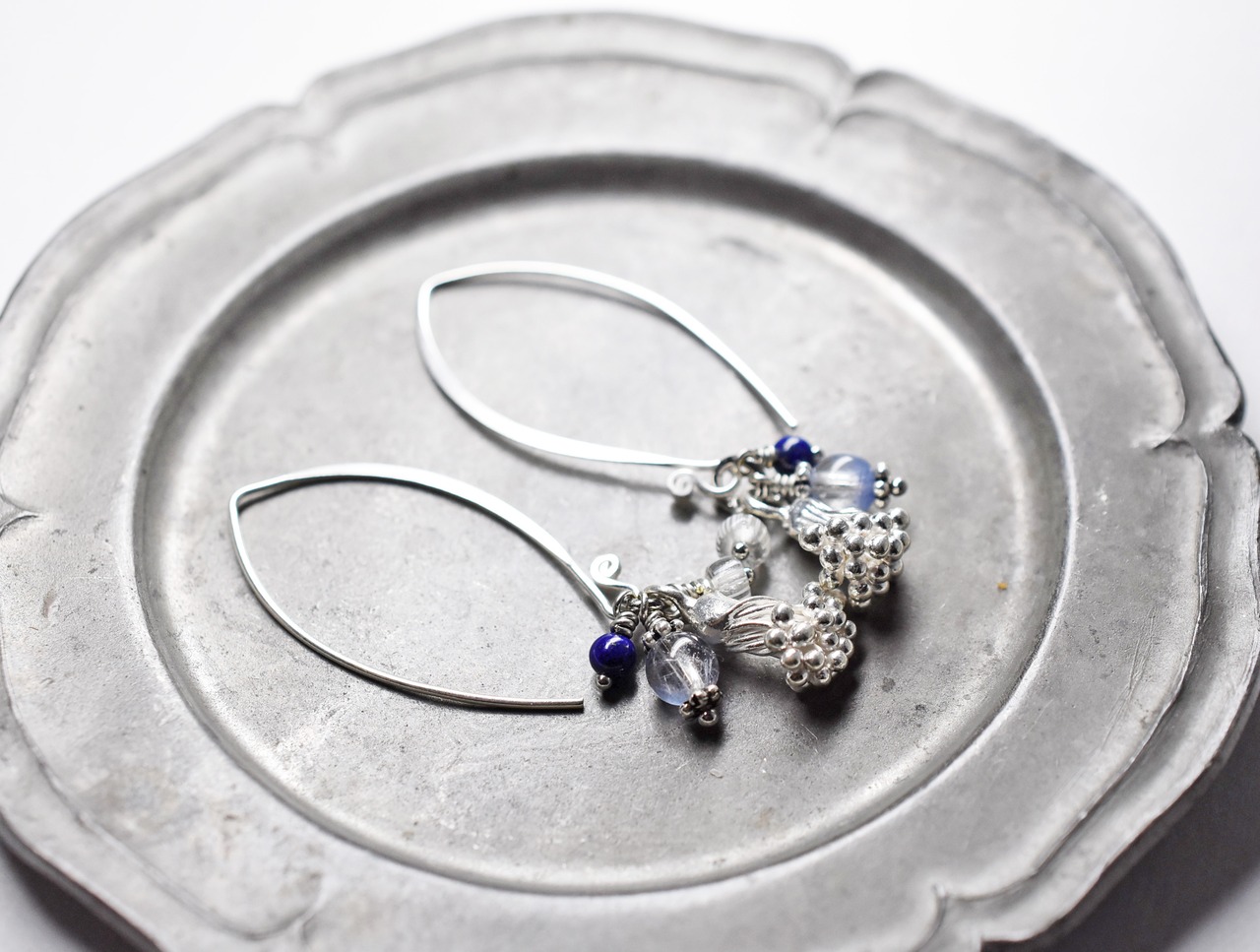 蕾カレンシルバーチャームにデュモルチェライトインクォーツ、ラピス、小さなグーズベリーを繋いだピアスです。
