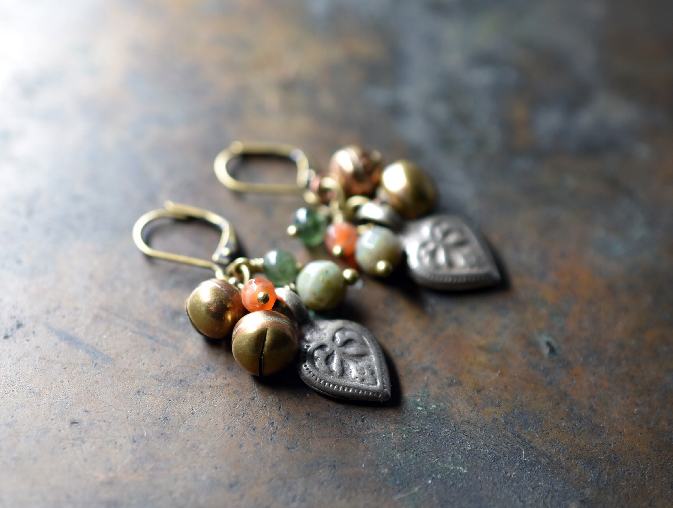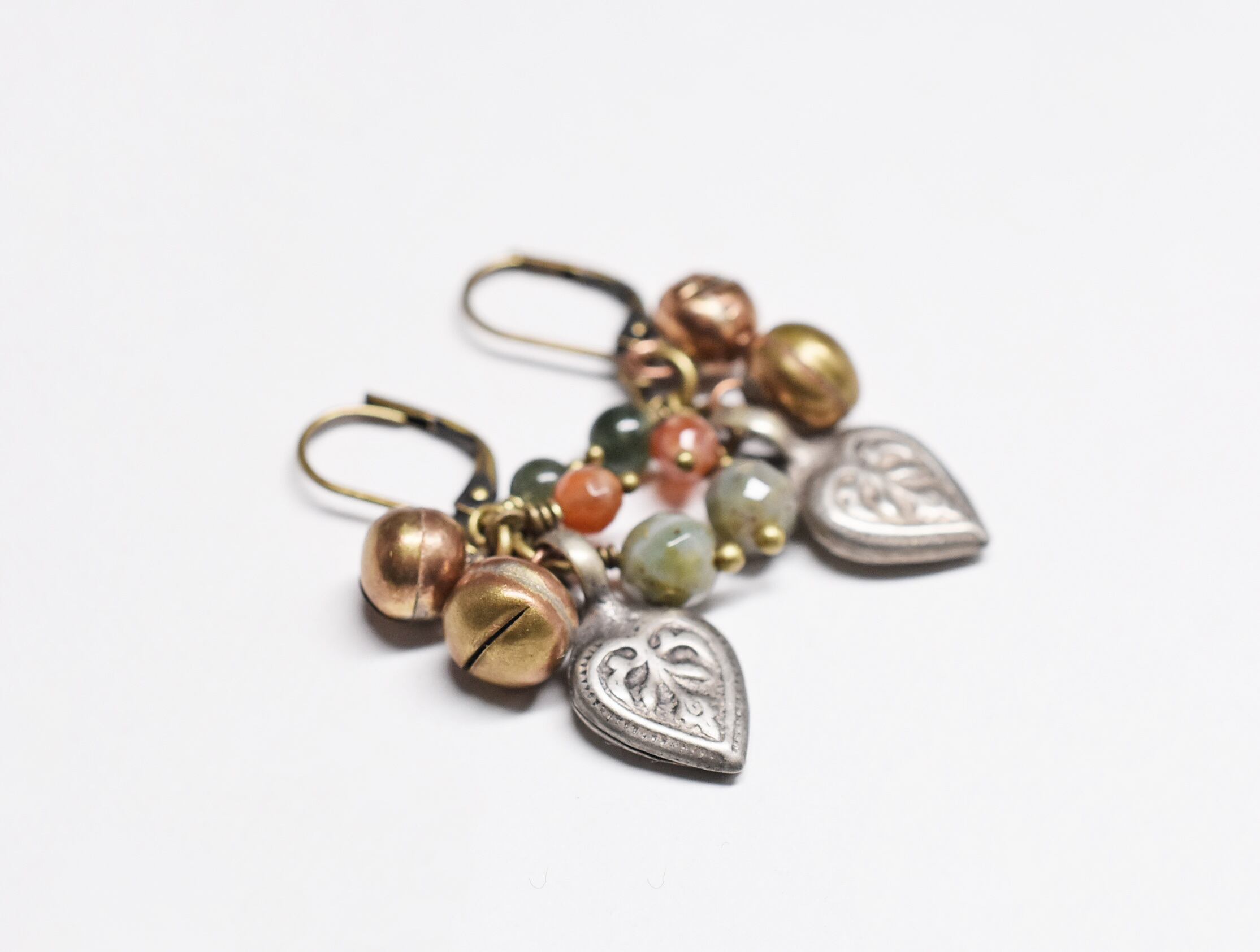 アフガニスタンハートパーツと鈴と、3種類の天然石のピアス