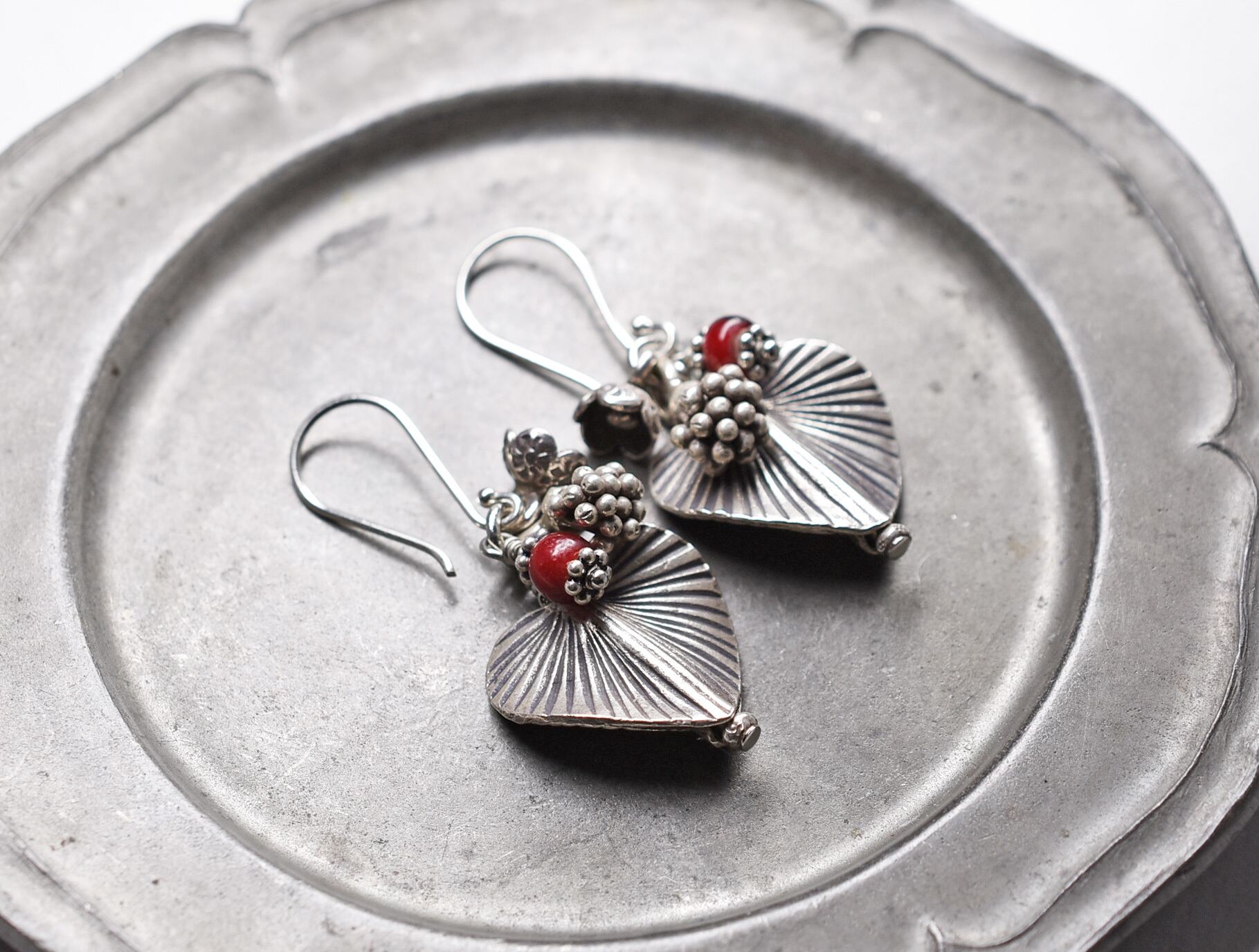 葉っぱと、蕾と小さなお花のカレンシルバーと、赤いアンティークビーズを一粒繋いだピアスです。