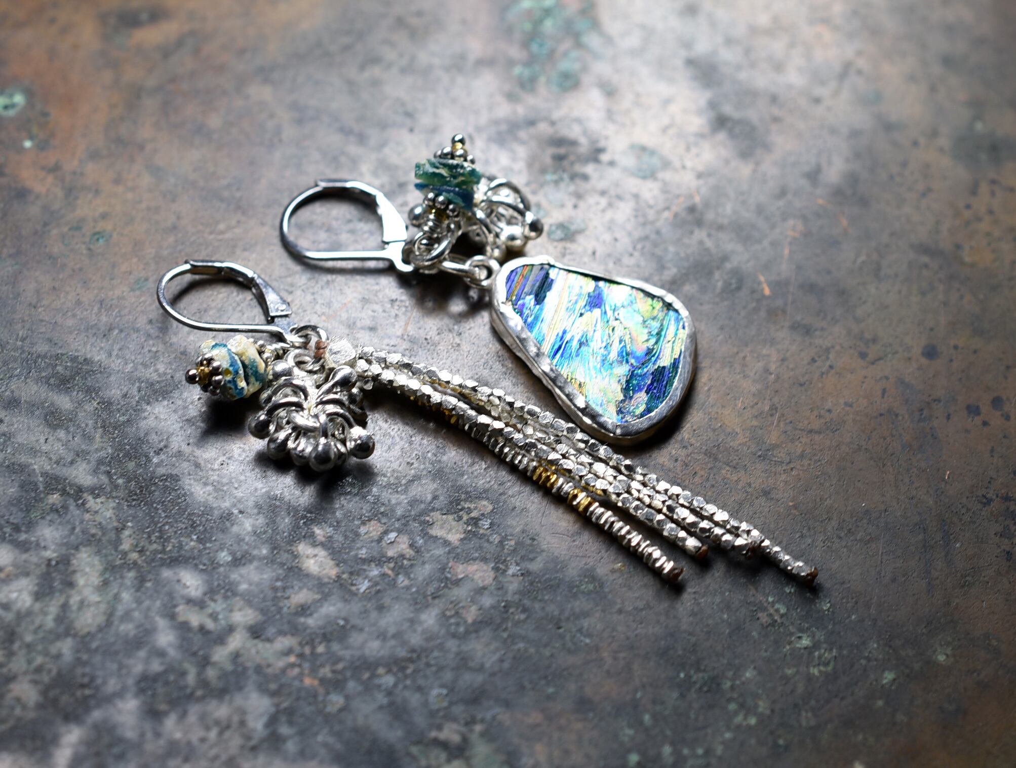 銀化したローマングラスと、カレンシルバーチャーム、さざれの小さなローマングラスを繋いだアンシメトリーのピアスです。
