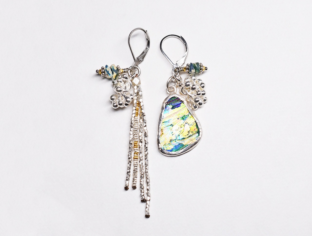 煌めくローマングラスとしゃらりとしたカレンシルバーのアンシメトリーピアス
