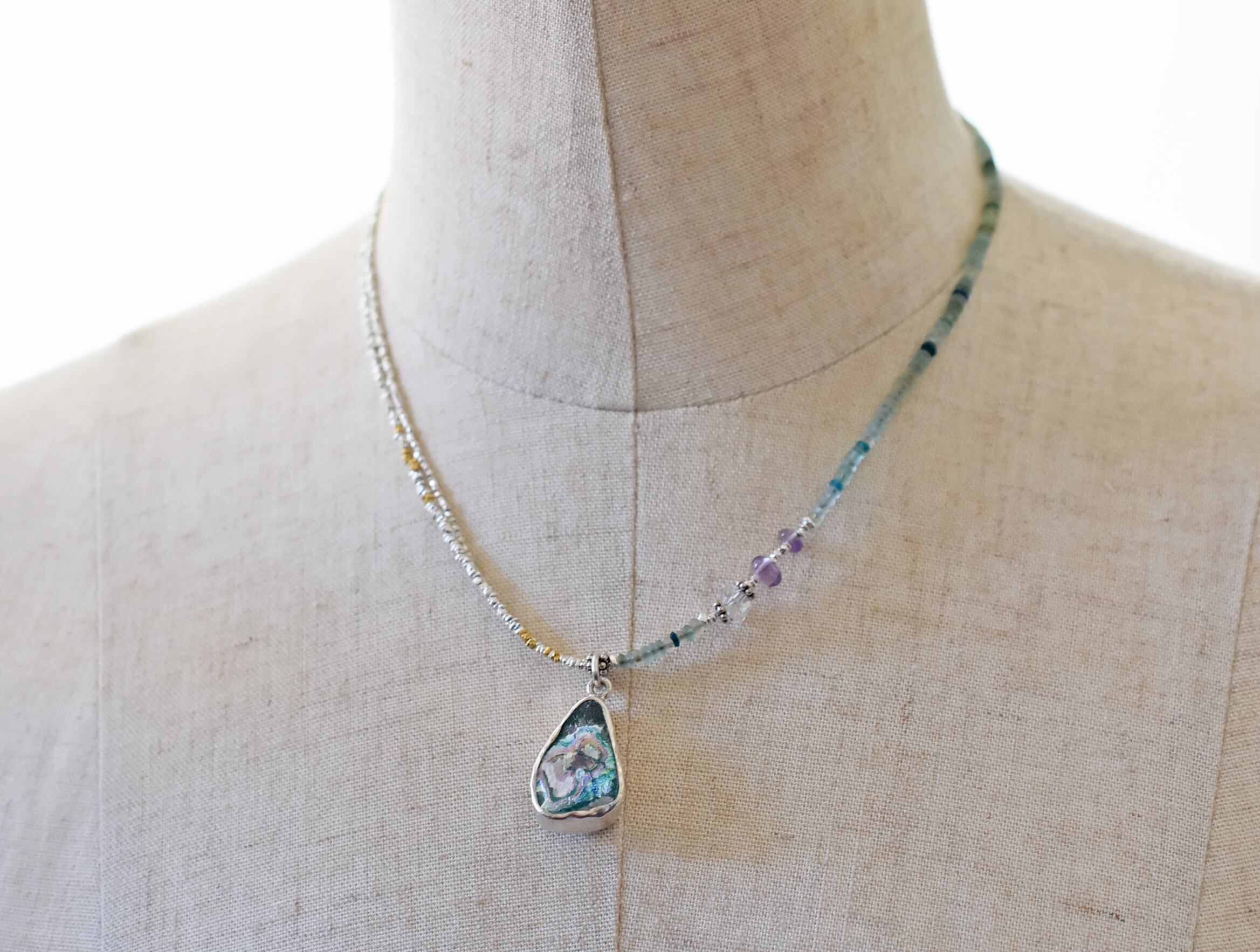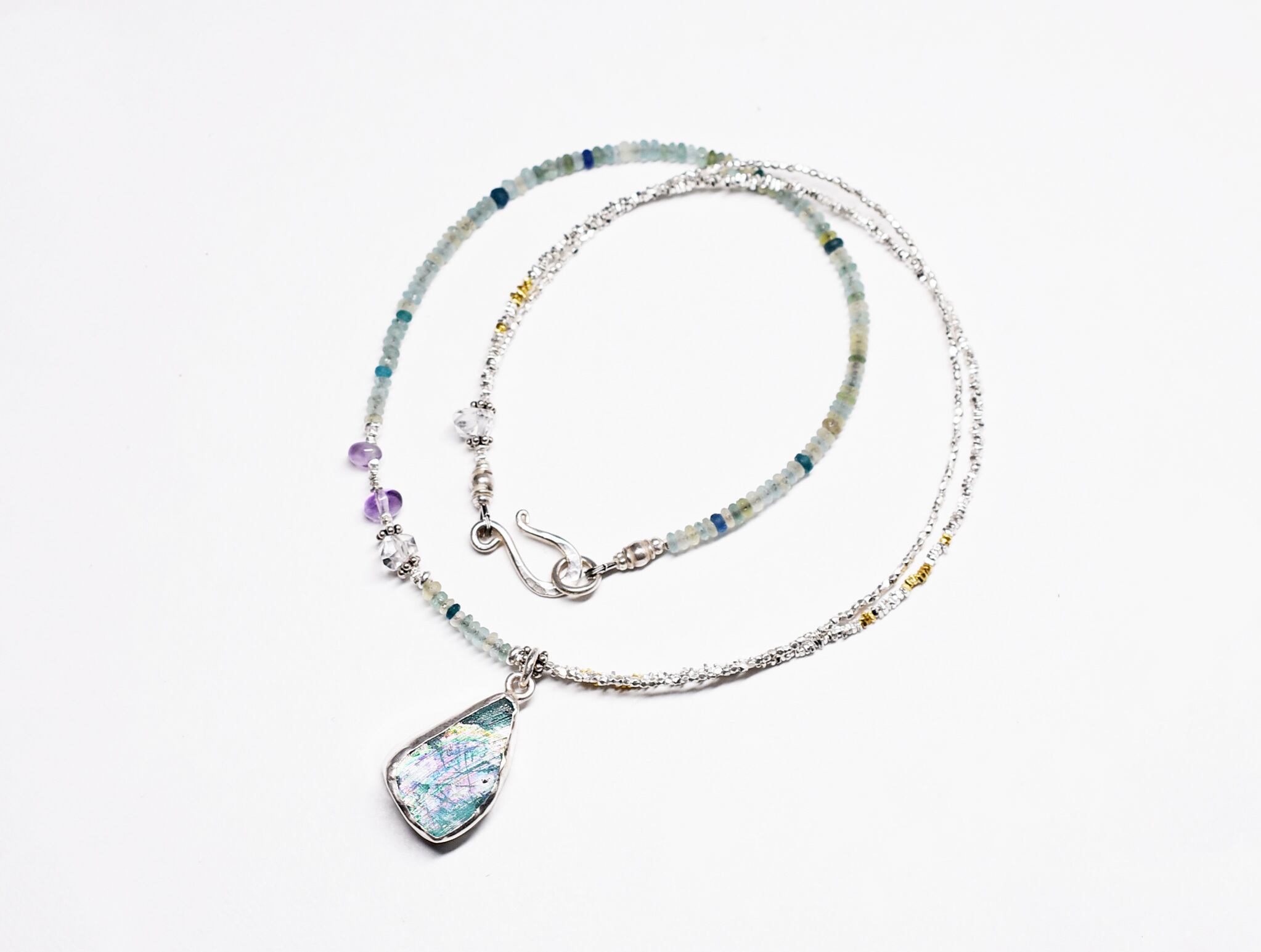 銀化したローマングラスのトップを、煌めくカレンシルバービーズと、丸やさざれ型のローマングラスで繋げたネックレスです。