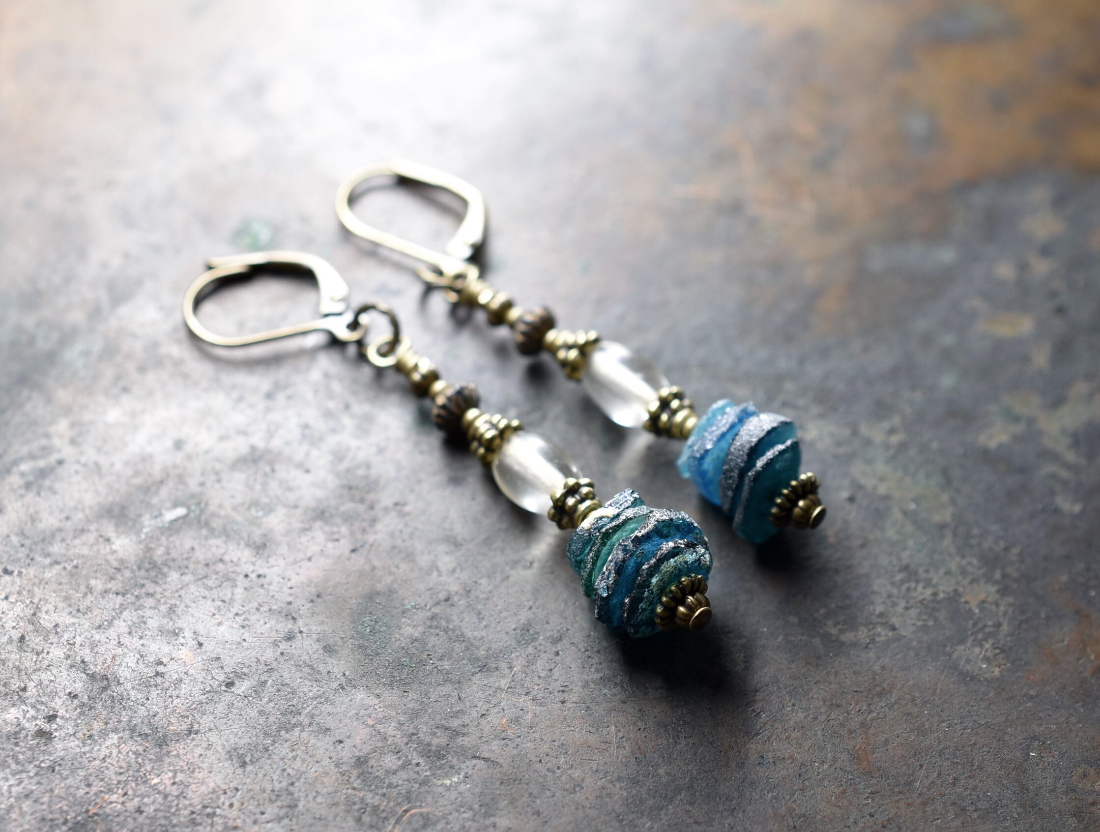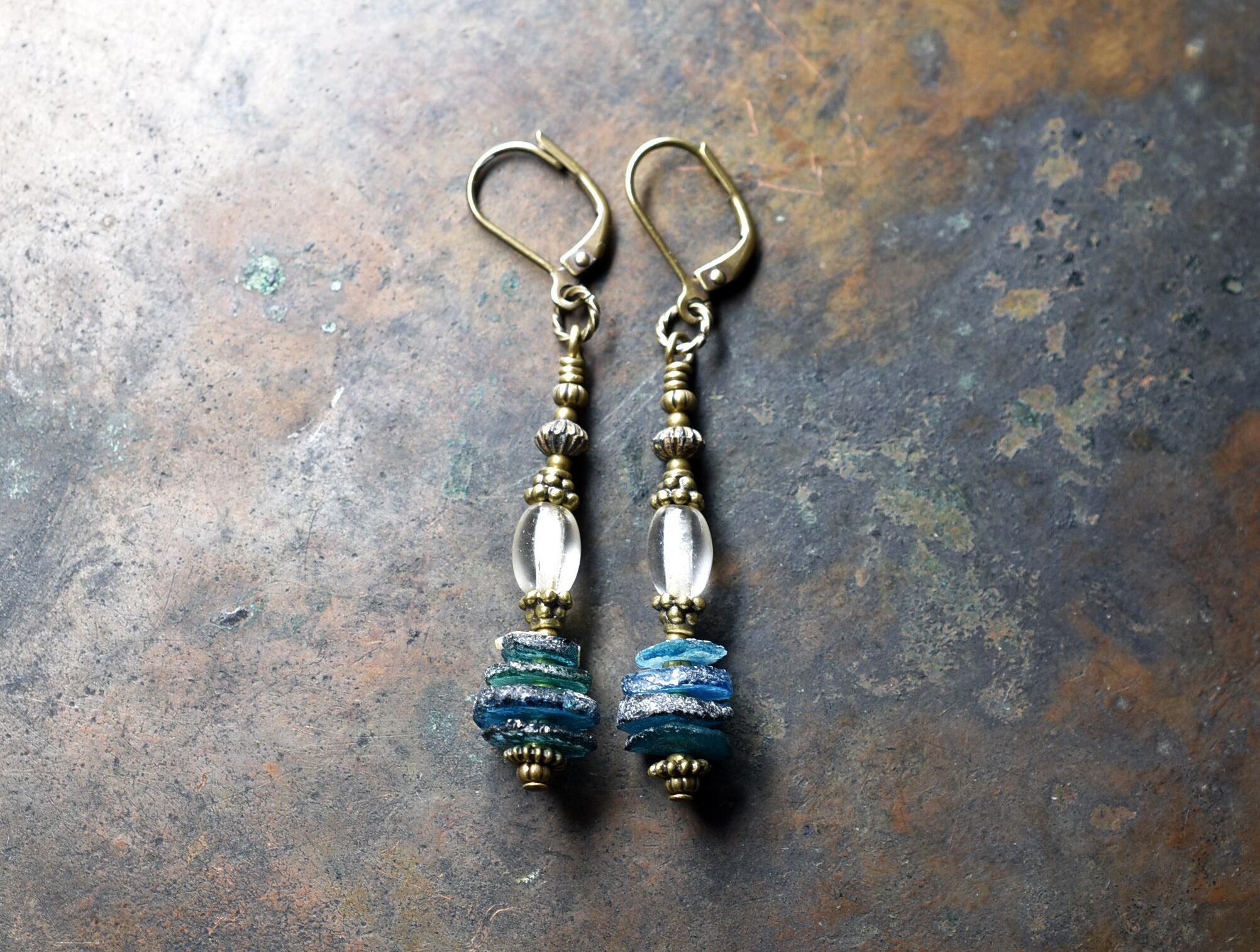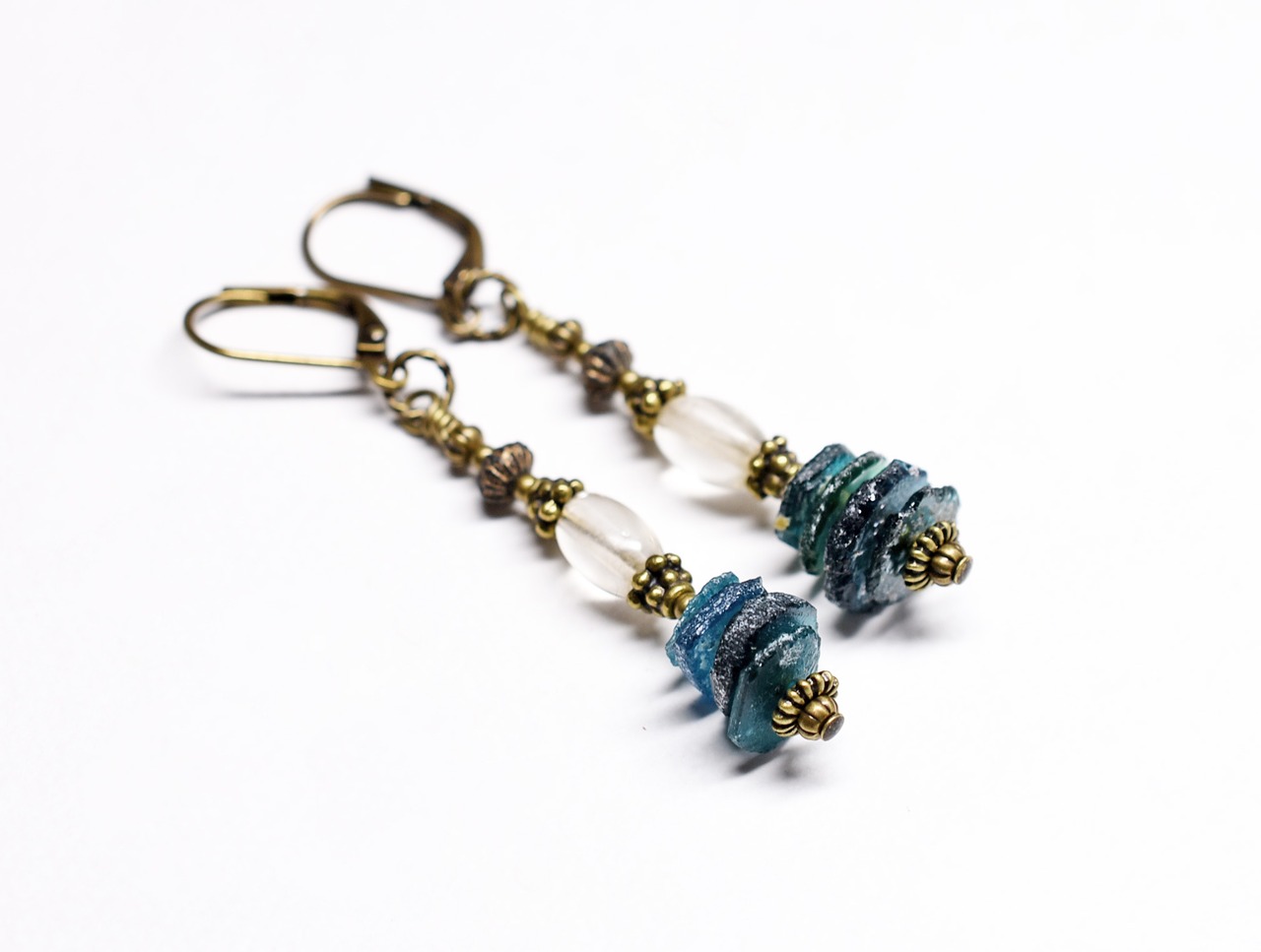円盤状のローマングラスと、アンティークのボヘミアビーズ、ブラスパーツを繋いだピアスです。