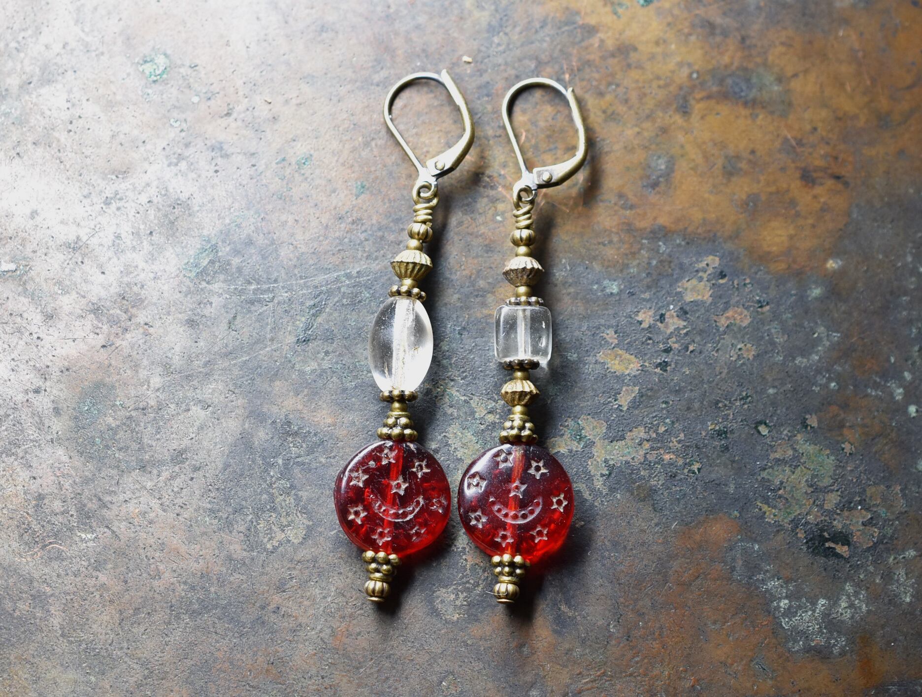 月と星の模様が施された聖者のビーズと、ボヘミアのアンティークビーズを繋いだアンシメトリーなピアスです。