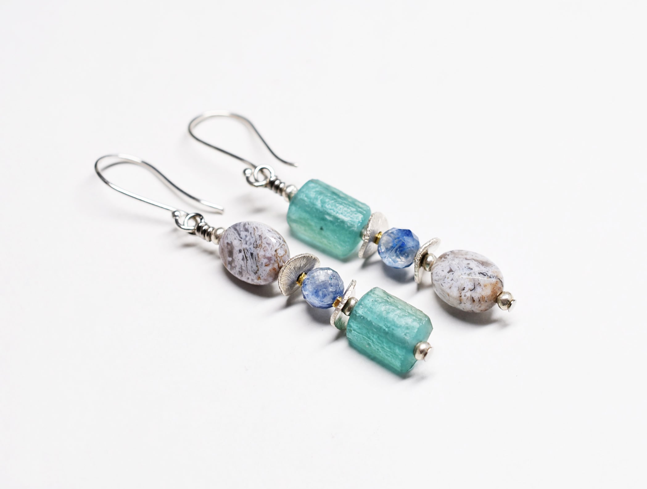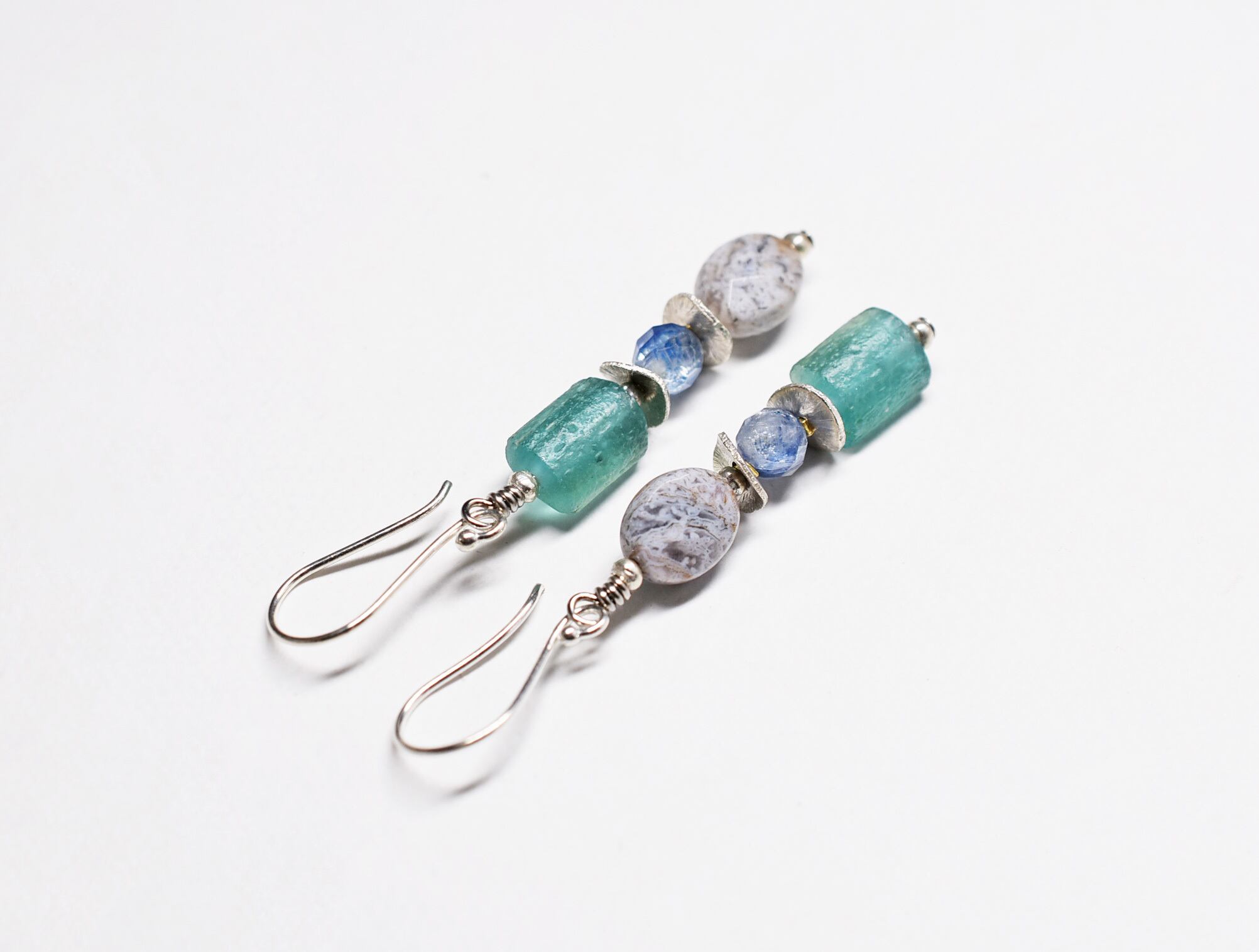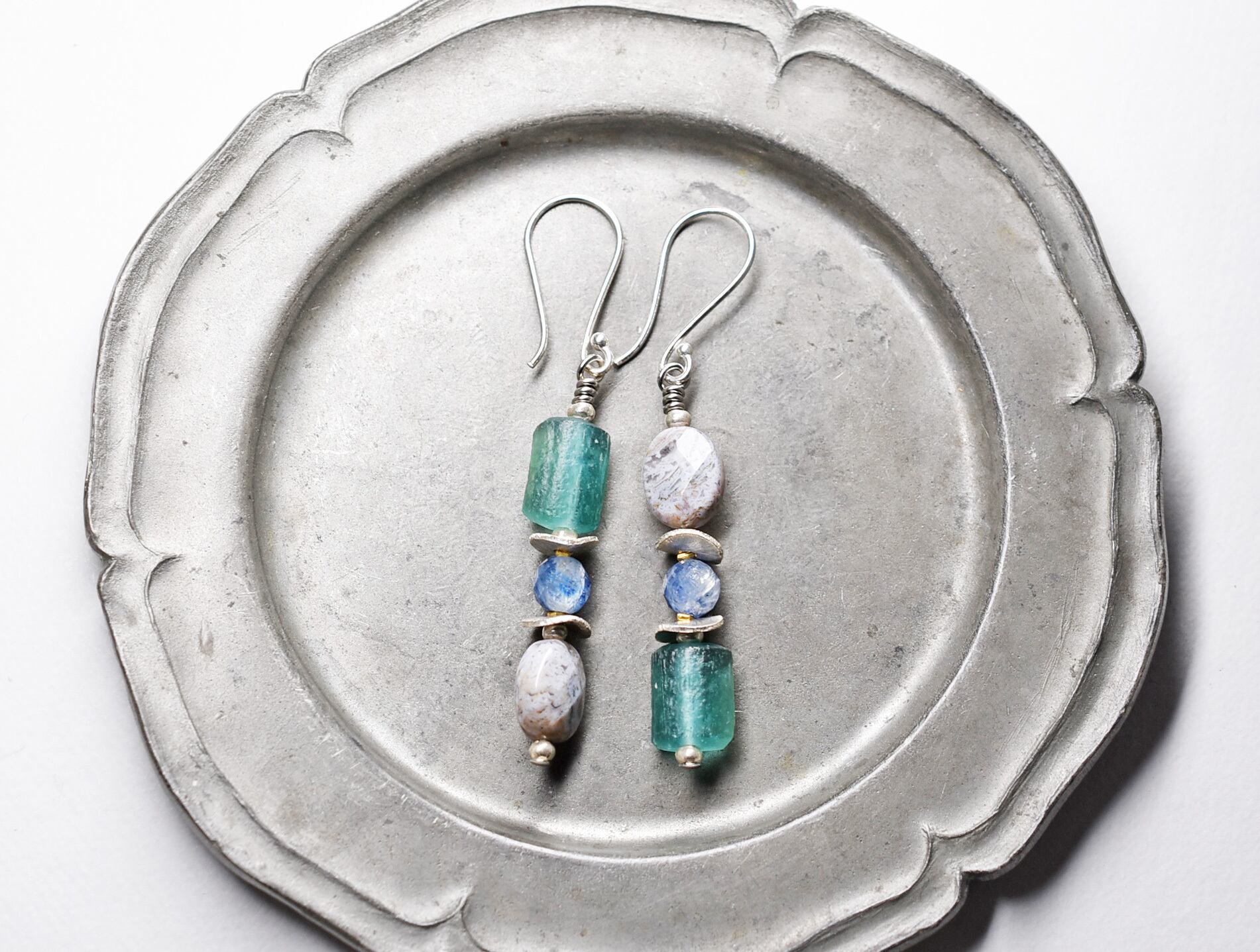 ローマングラスとインディアンアゲート、カイヤナイト、カレンシルバーを繋いだピアスです。