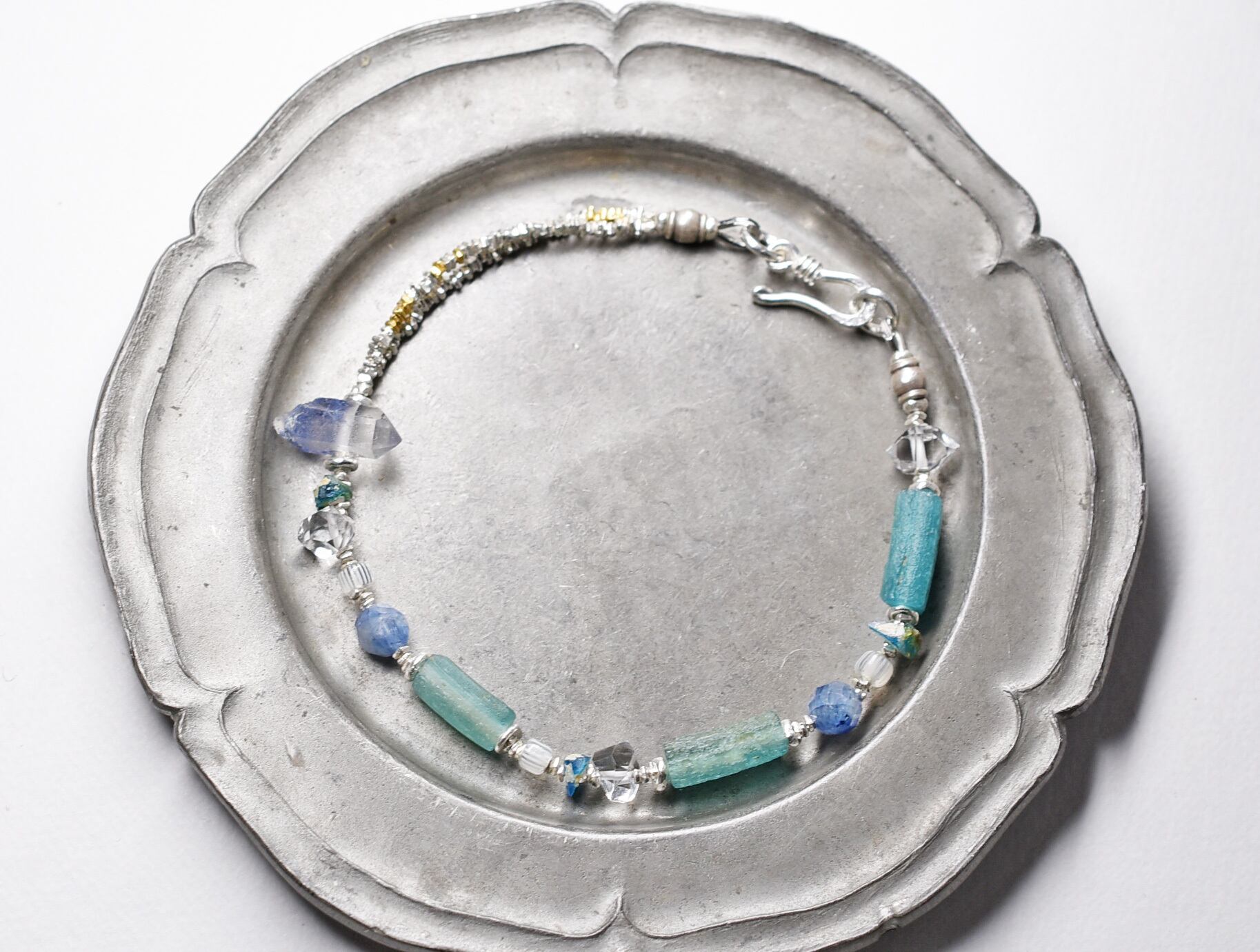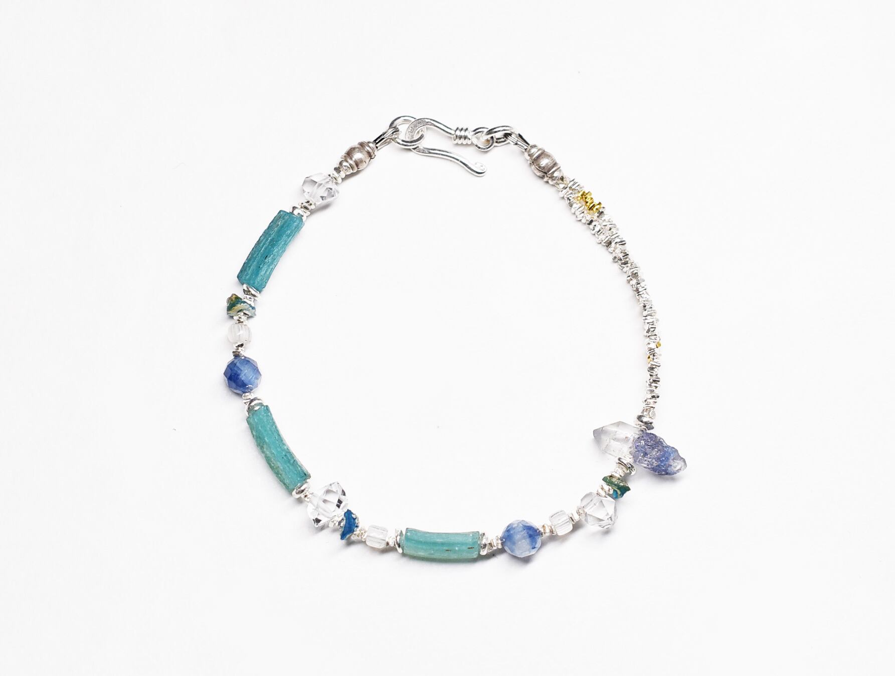 ローマングラスと3種の天然石、カレンシルバーのブレス