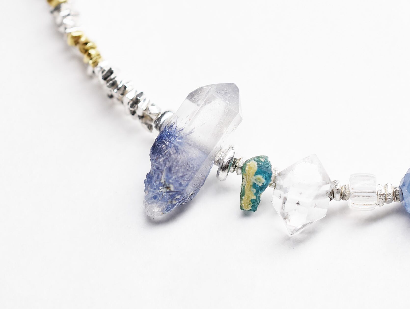 透明な両県のハーキマーダイヤモンドと、ブルーのグラデーションが美しい多面体カットのカイヤナイトを散りばめています。