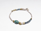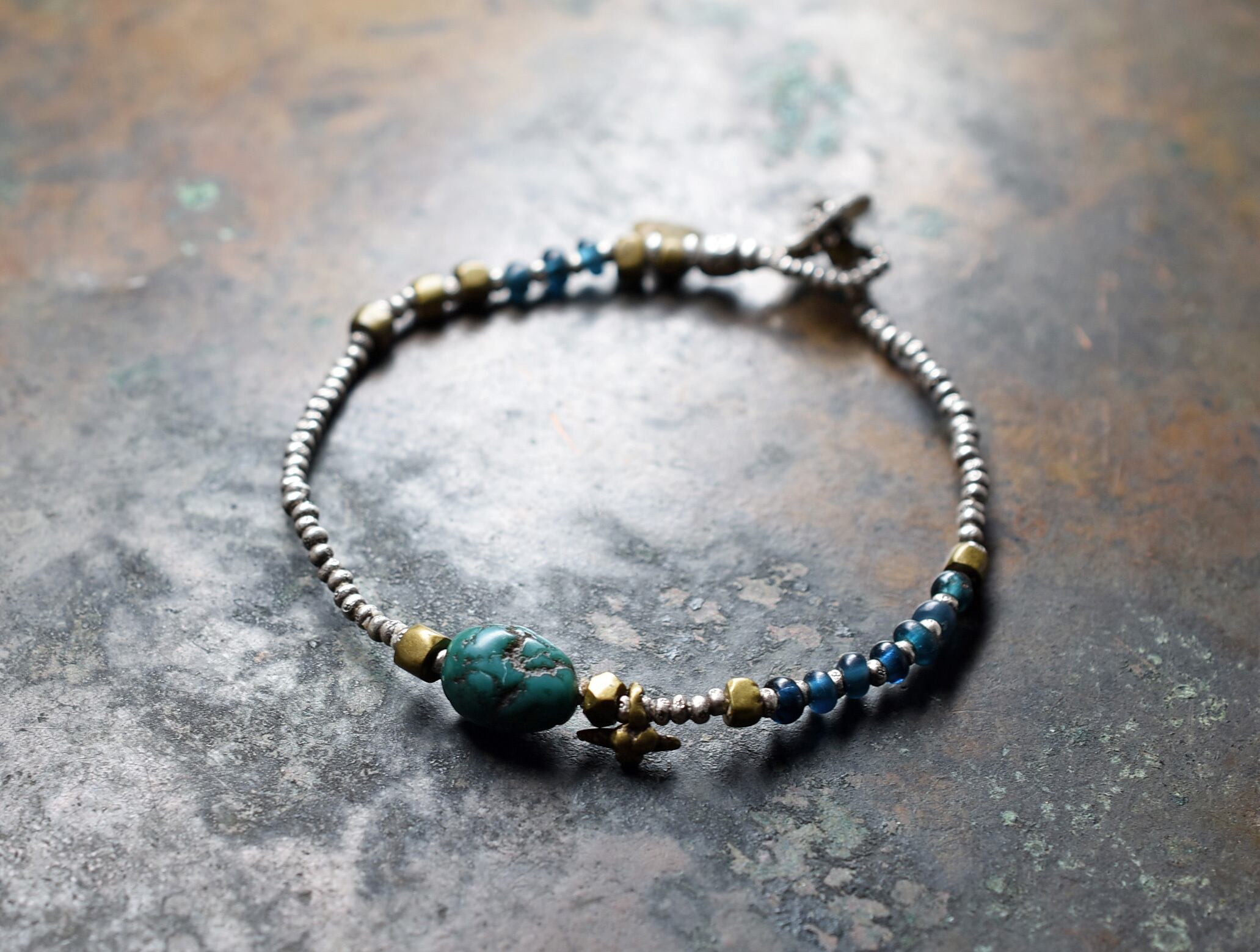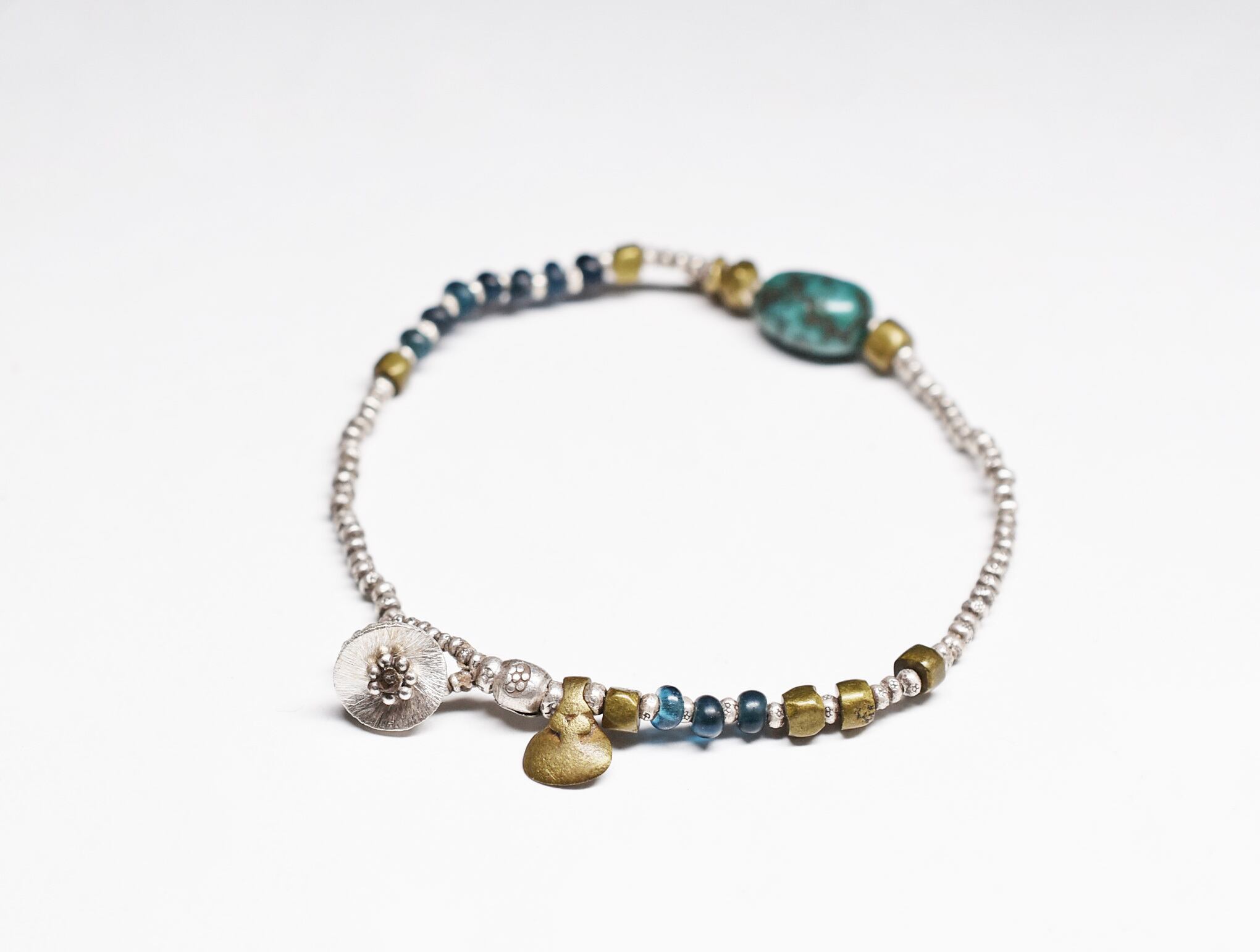 oldチベタンターコイズ、インディゴブルーのアンティークビーズ、oldオリッサブラスを、小さなカレンシルバーで繋いだブレスです。