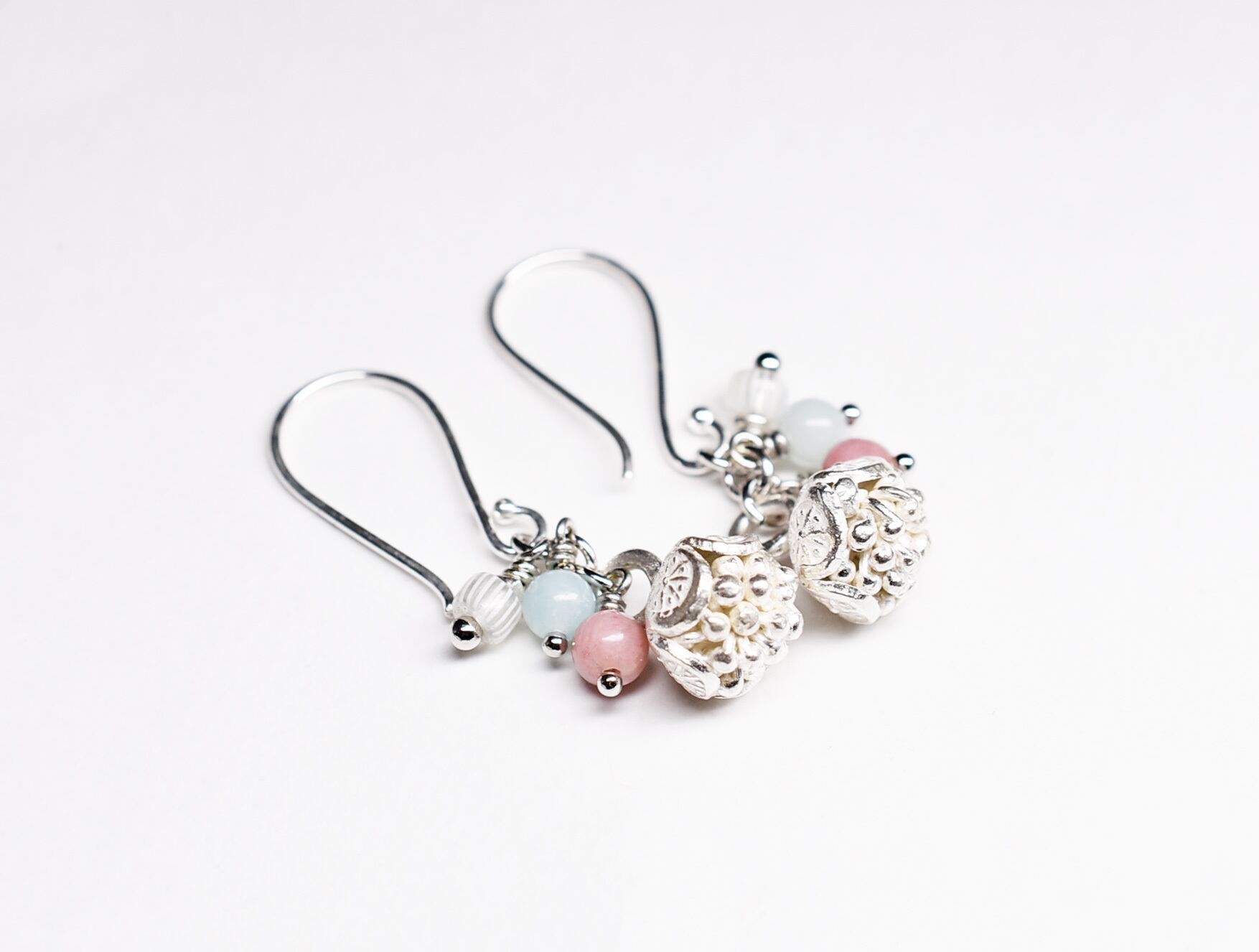 ちょっと小ぶりで天然石やアンティークビーズが実った可愛らしく華やかな雰囲気のピアスです。