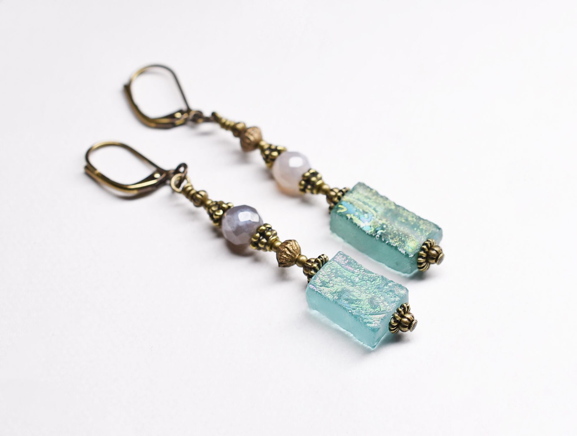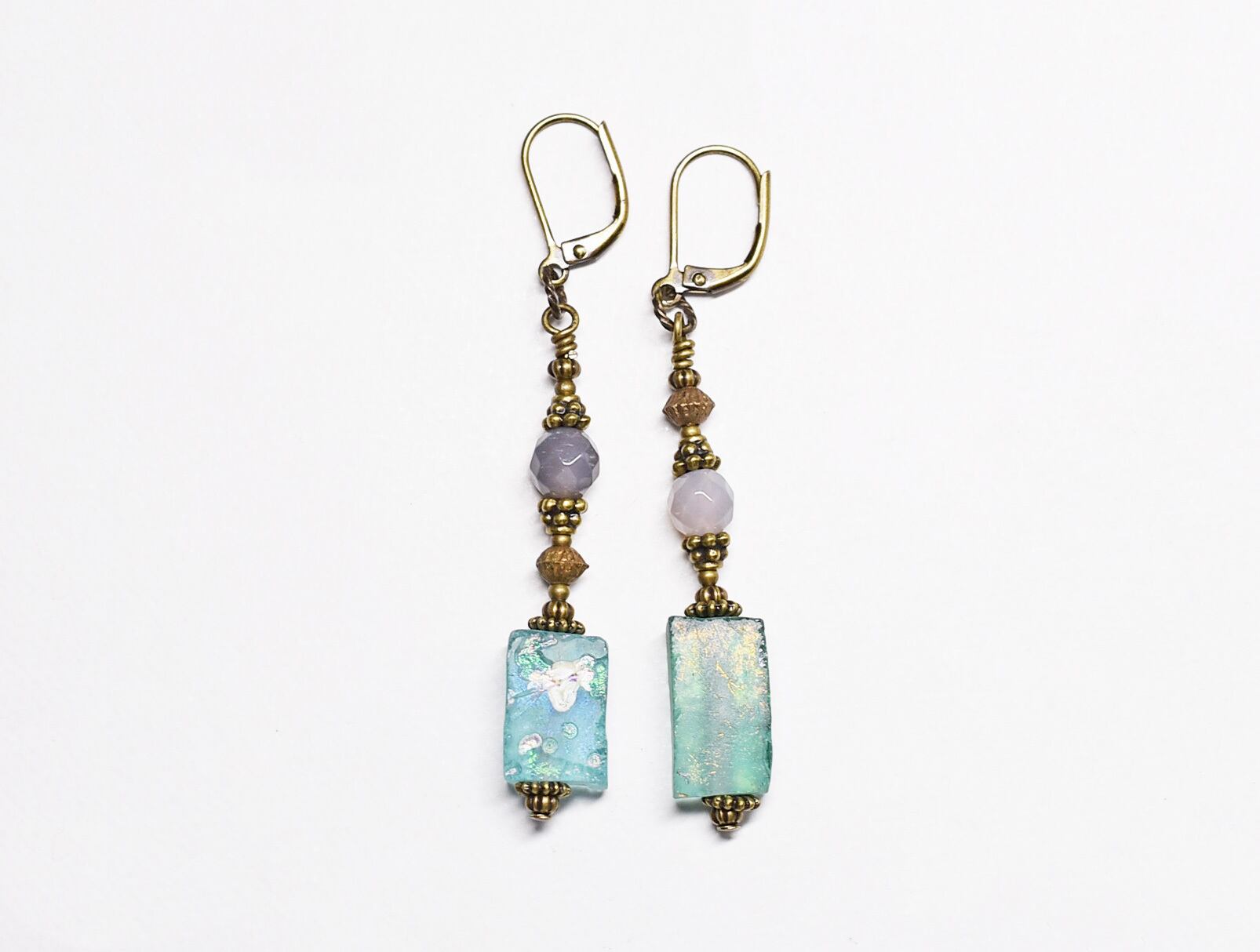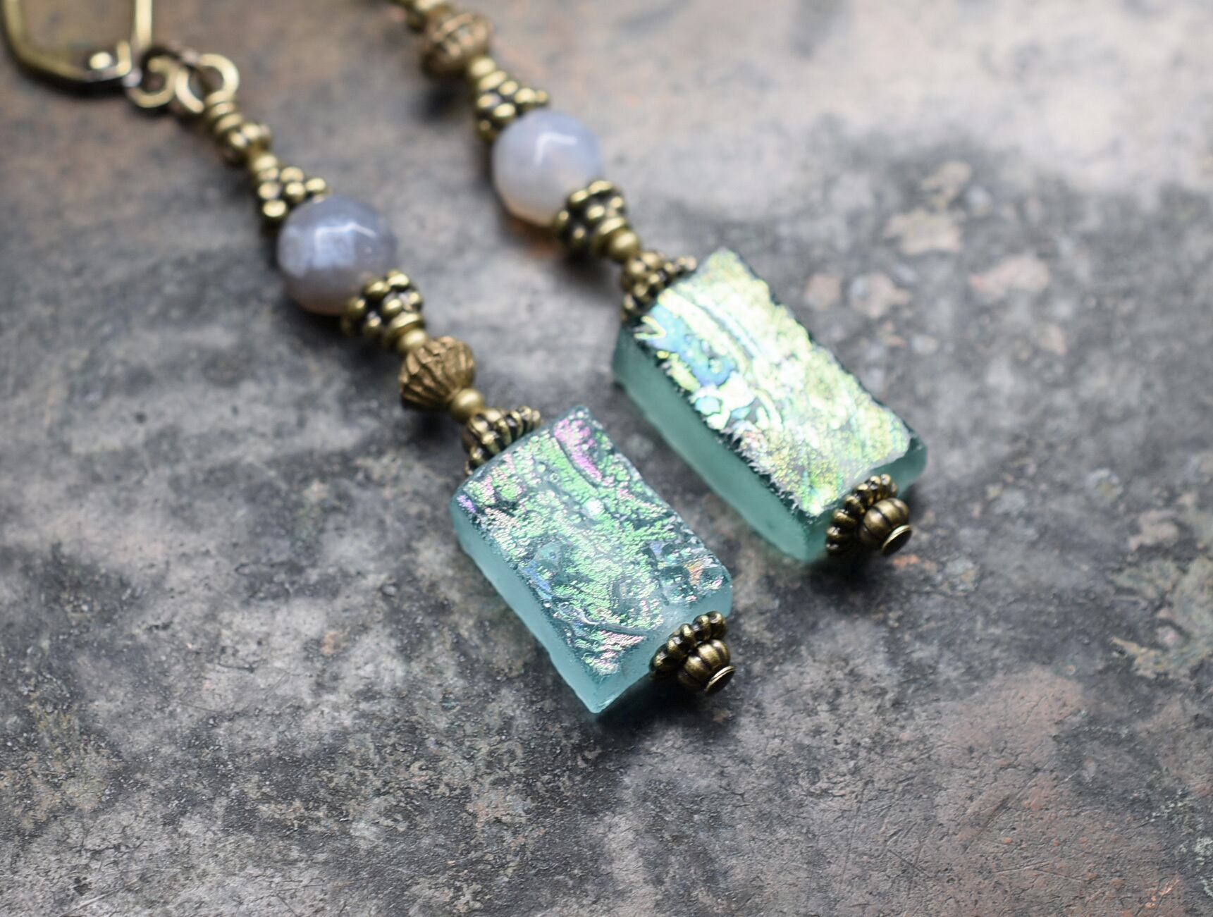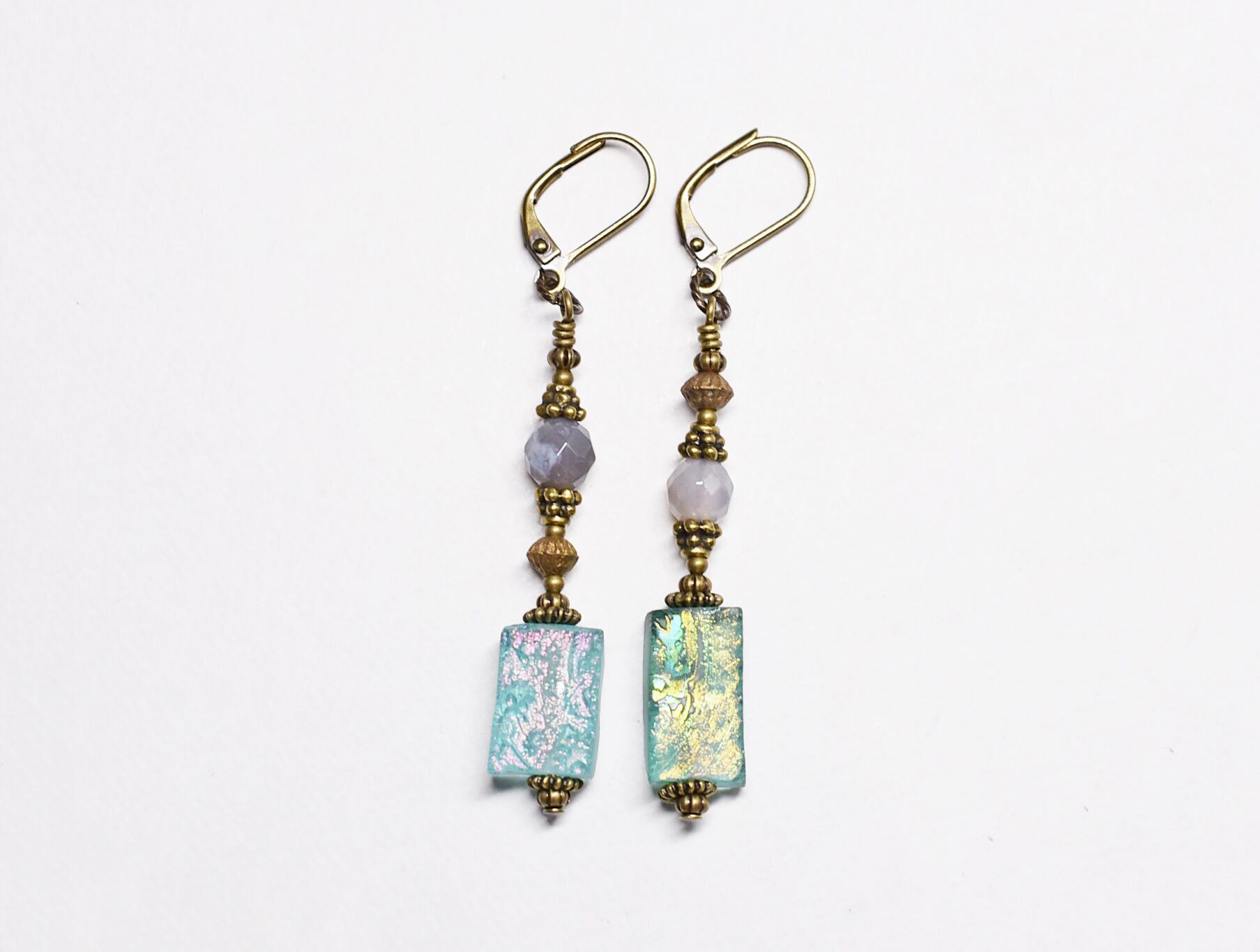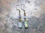 銀化ミントグリーン&ブルーローマングラスとインディアンアゲートのアンシメトリーピアス