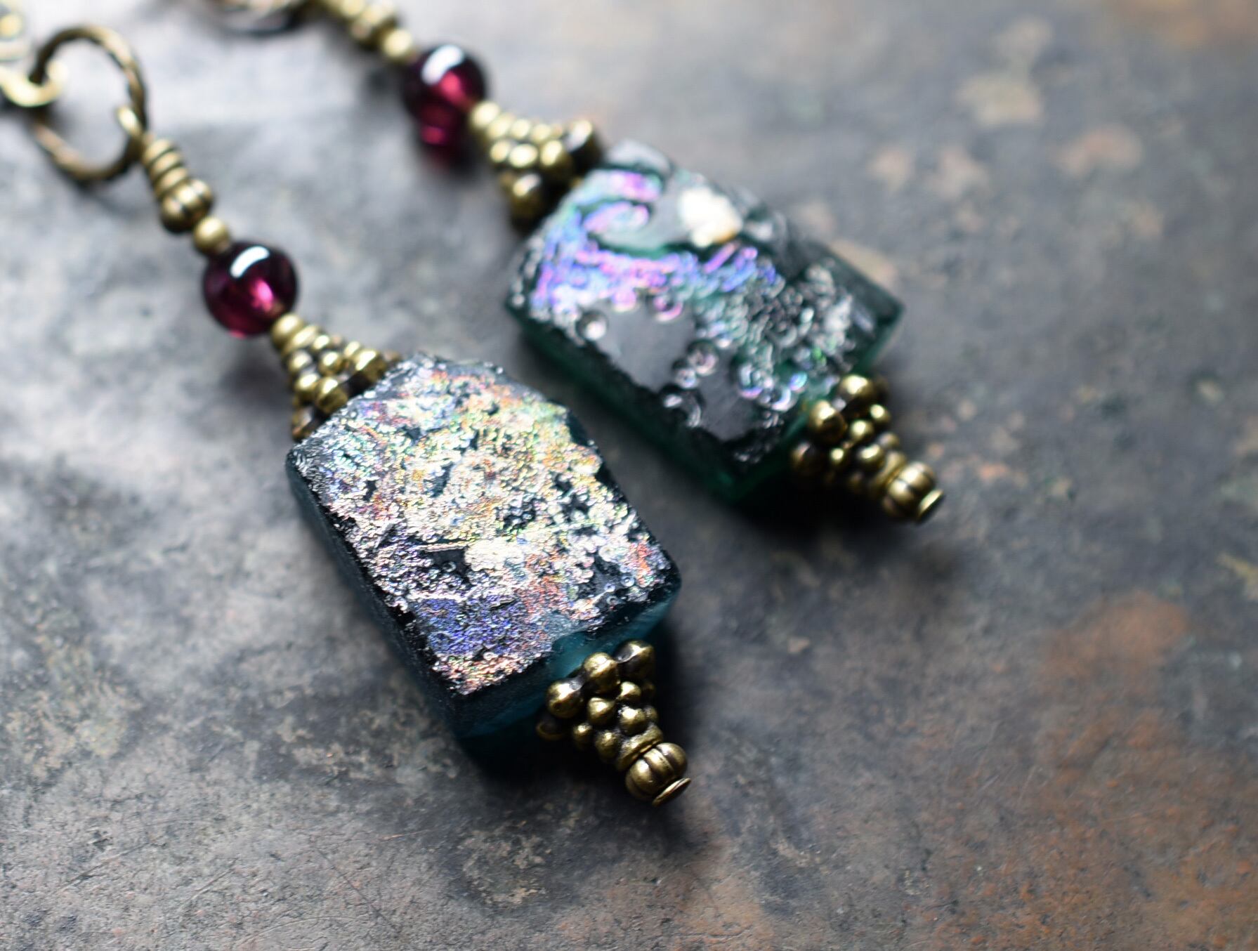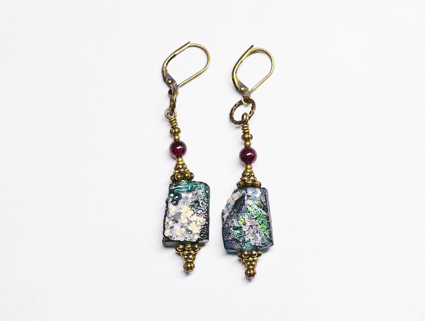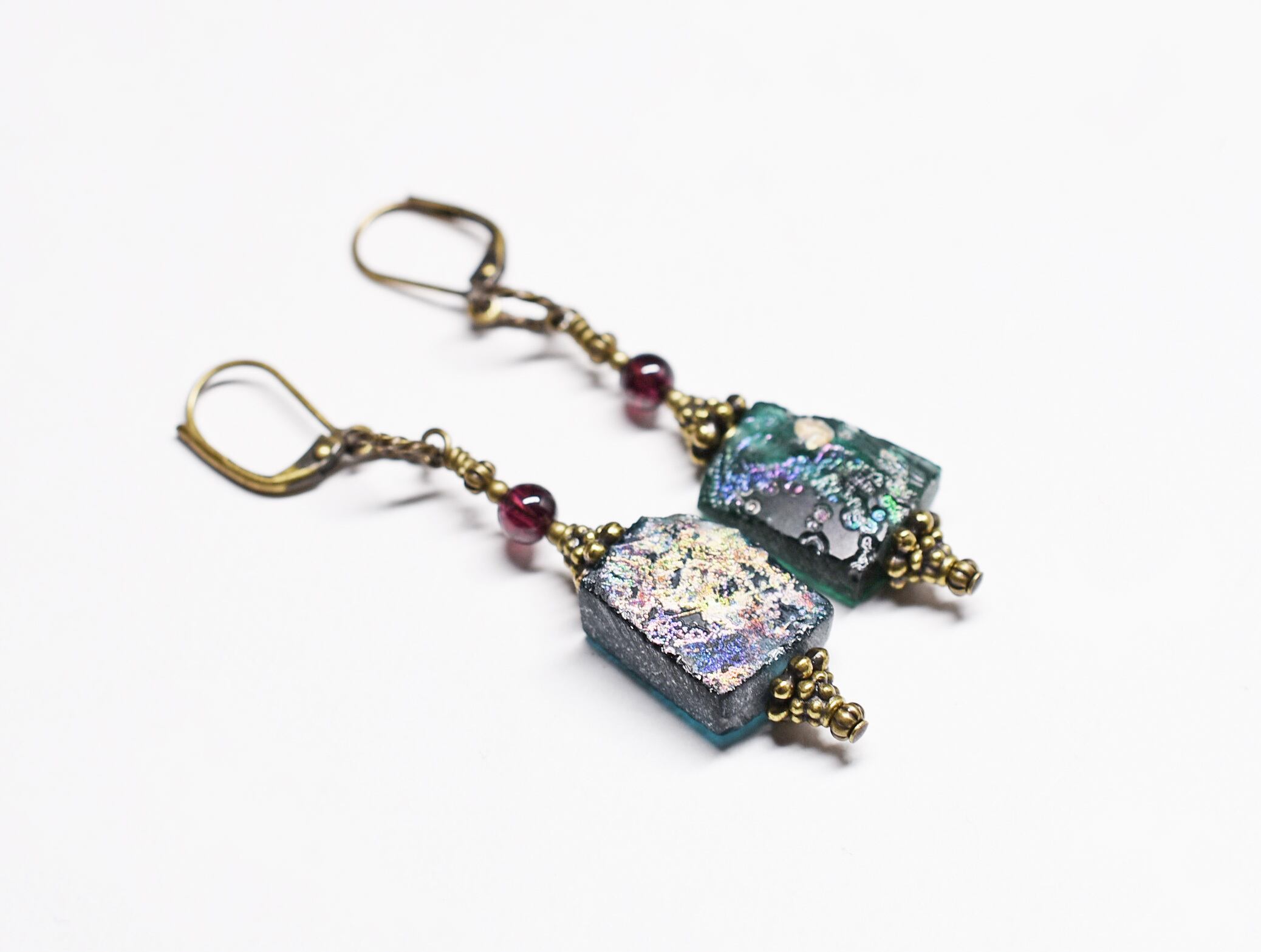 銀化ブルー&グリーンローマングラスとガーネットのピアス