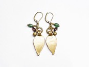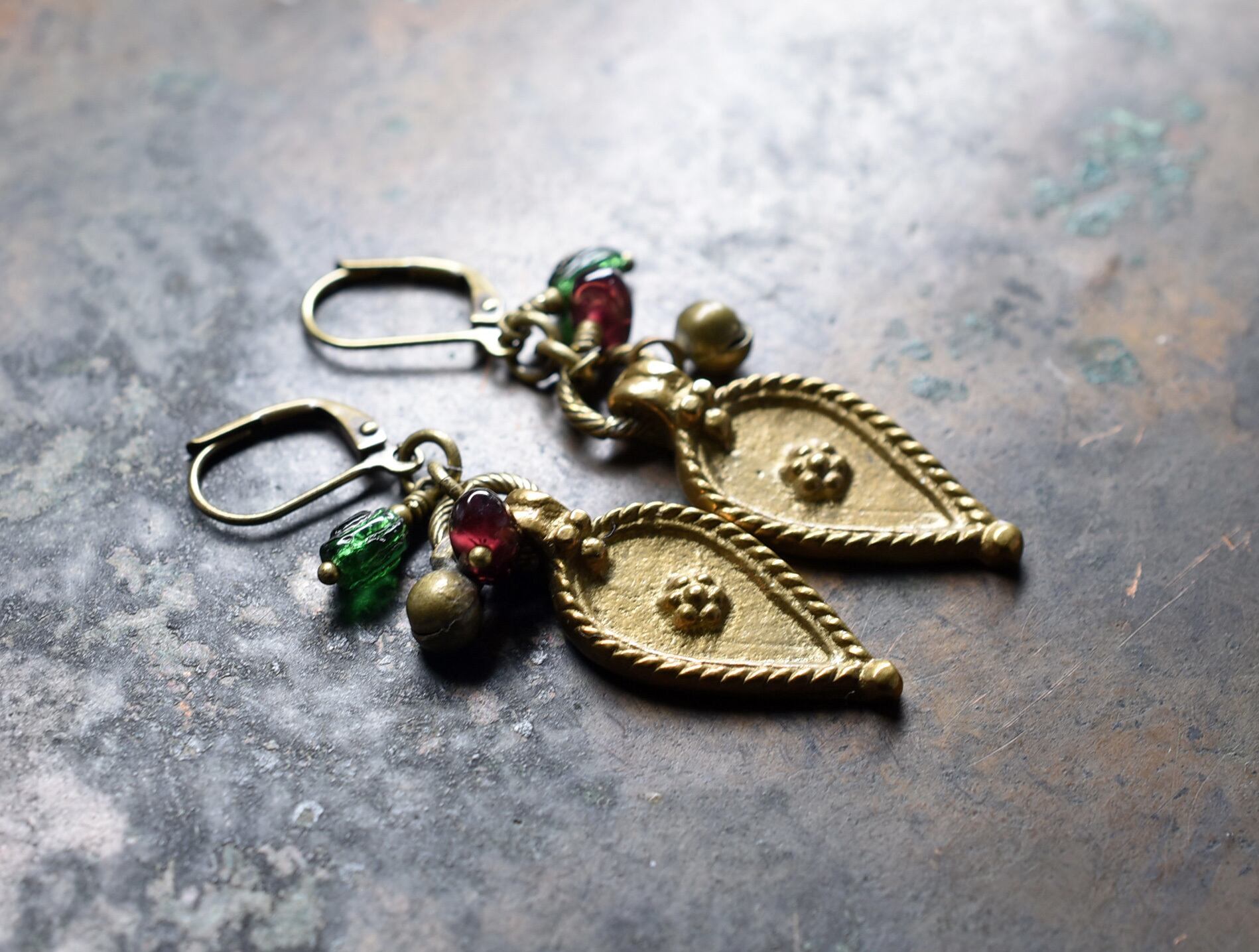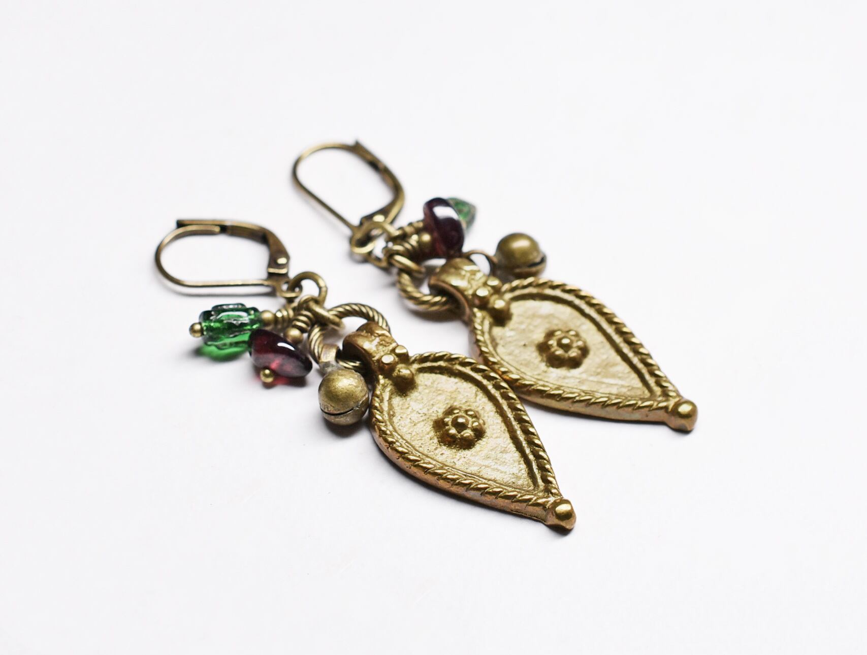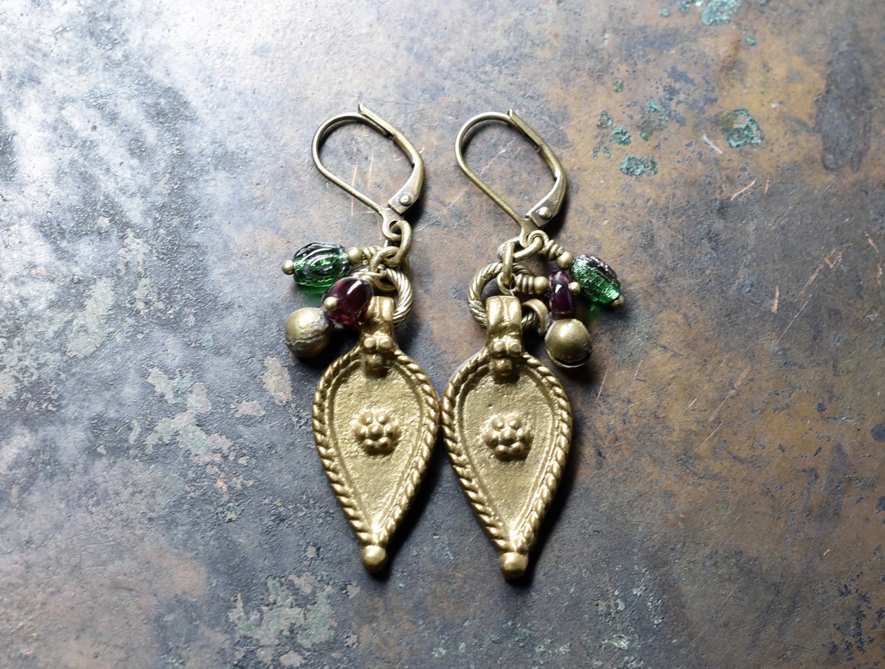 ブラスパーツと民族鈴、ガーネットとボヘミアアンティークビーズを繋いだピアスです。