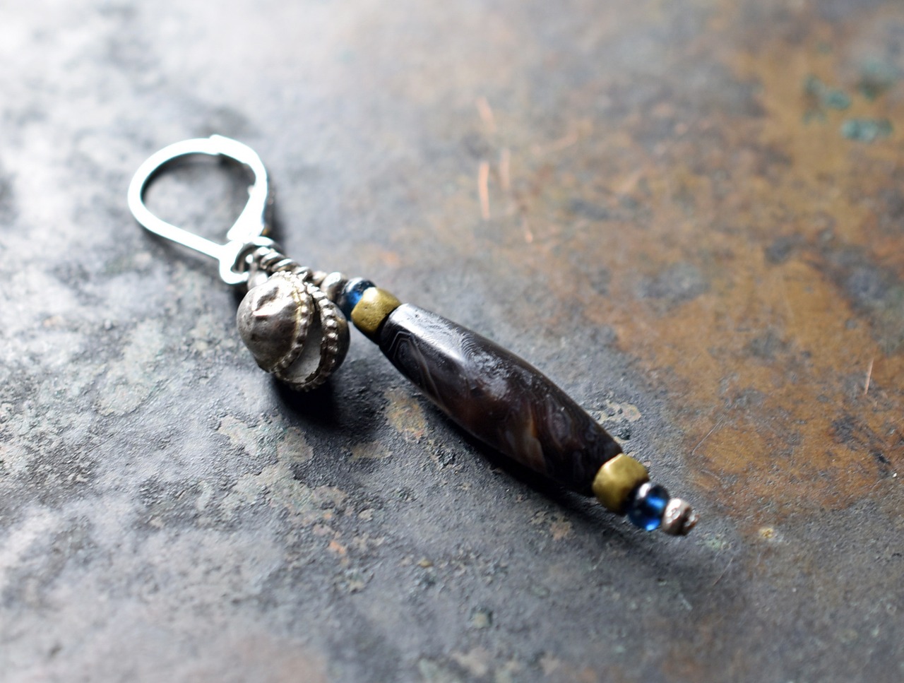古代瑪瑙、oldオリッサブラス、oldアフガンシルバーのベルを、インディゴブルーアンティークビーズ、小さなカレンシルバーで繋いだ片耳のピアスです。