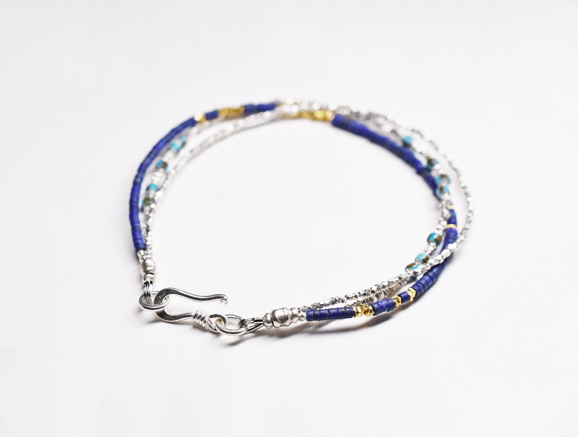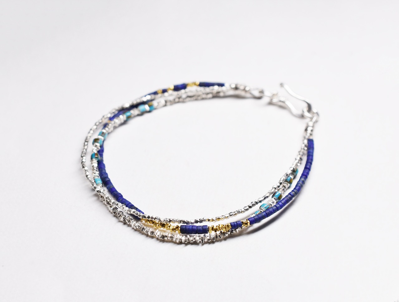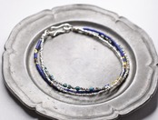 小さなラピスラズリと、小さなカレンシルバービーズを繋いだ3連のブレスです。