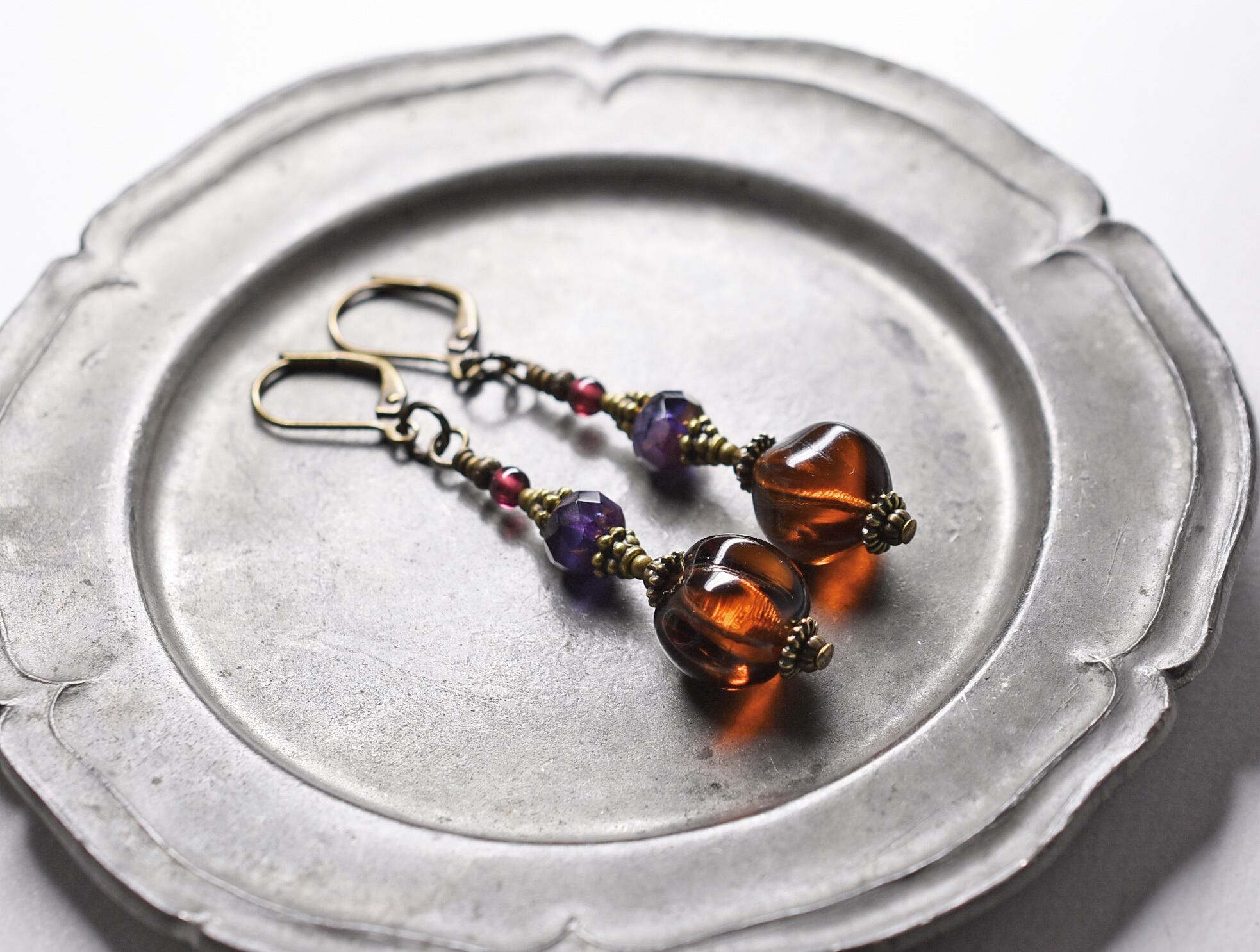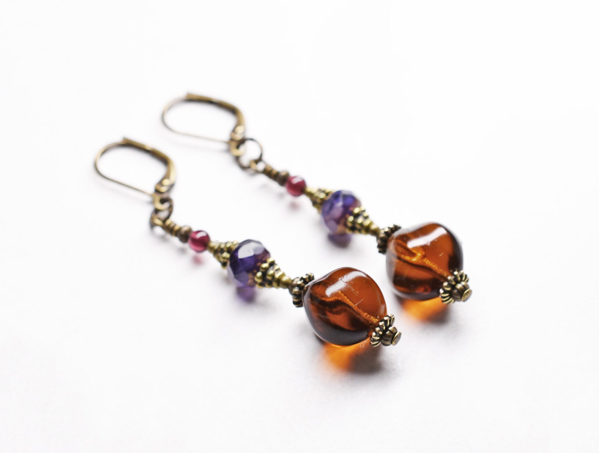 ブラウンドイツヴィンテージビーズとパープルチェコビーズ、ガーネットのピアス