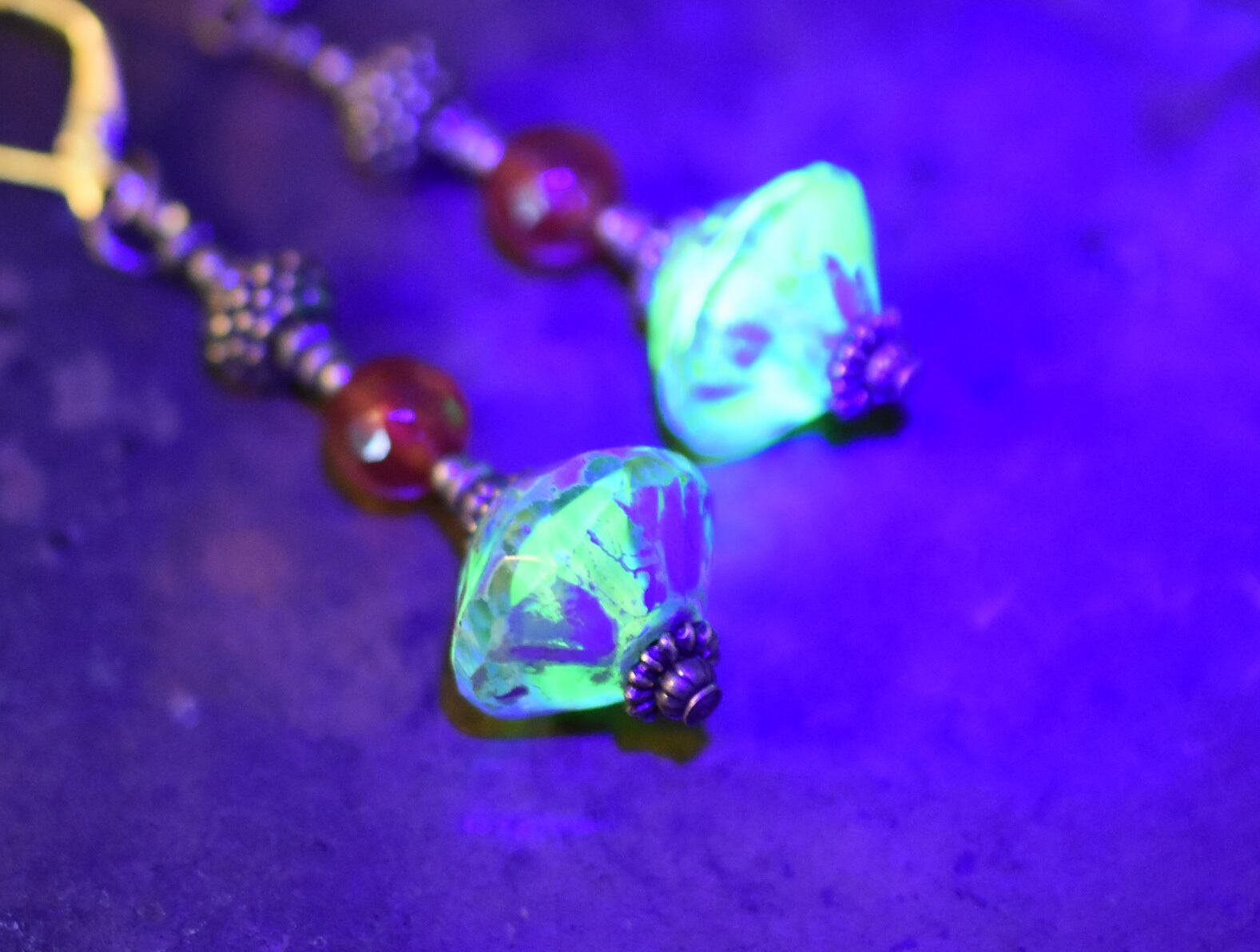 一番下の算盤型ビーズがウランガラスです。こちらは現行品ですが、細かなカットにアンティークのような
