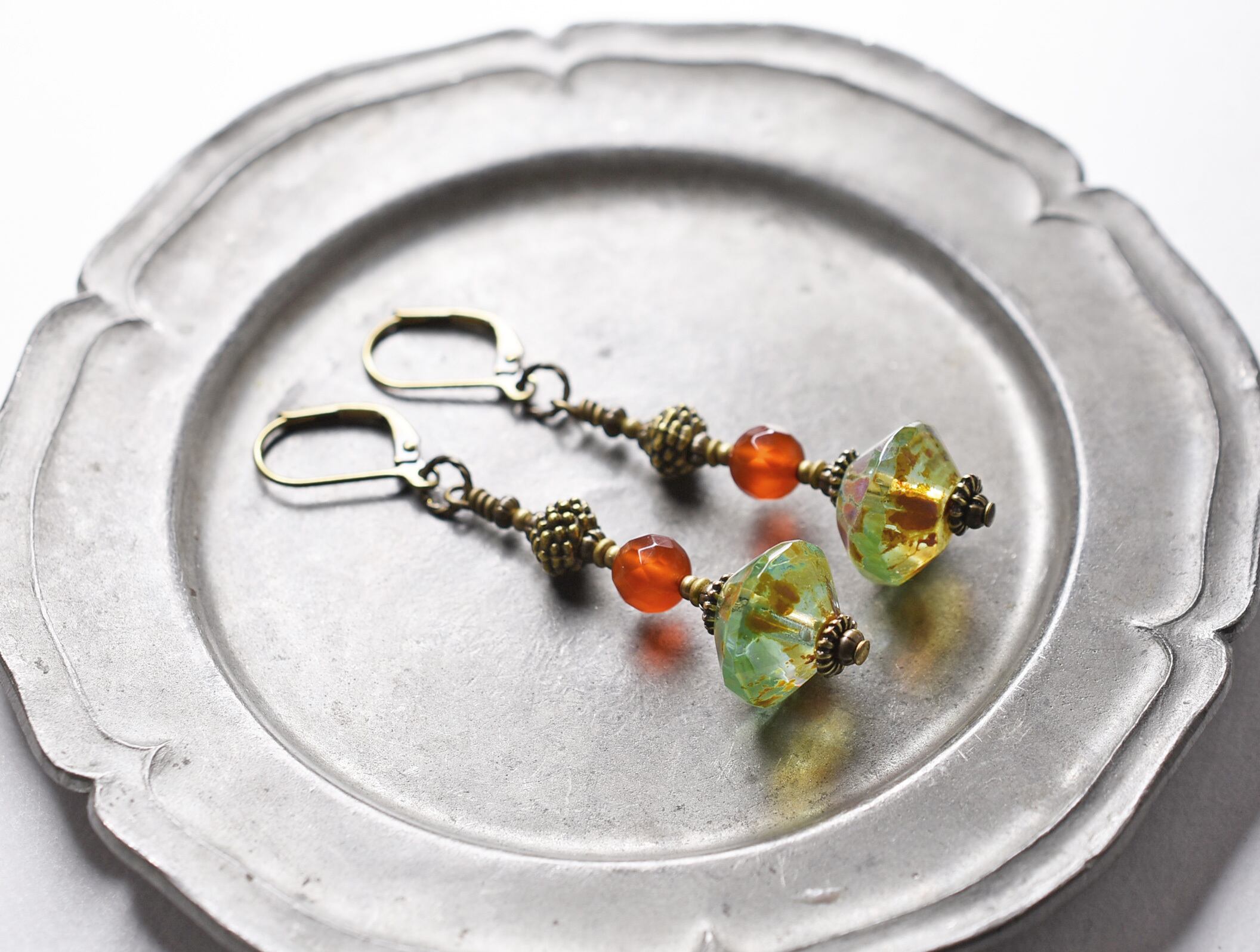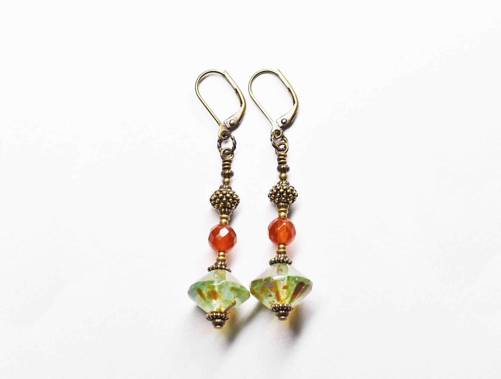 チェコ産のウランガラスと、カーネリアン、ブラスビーズを繋いだピアスです。