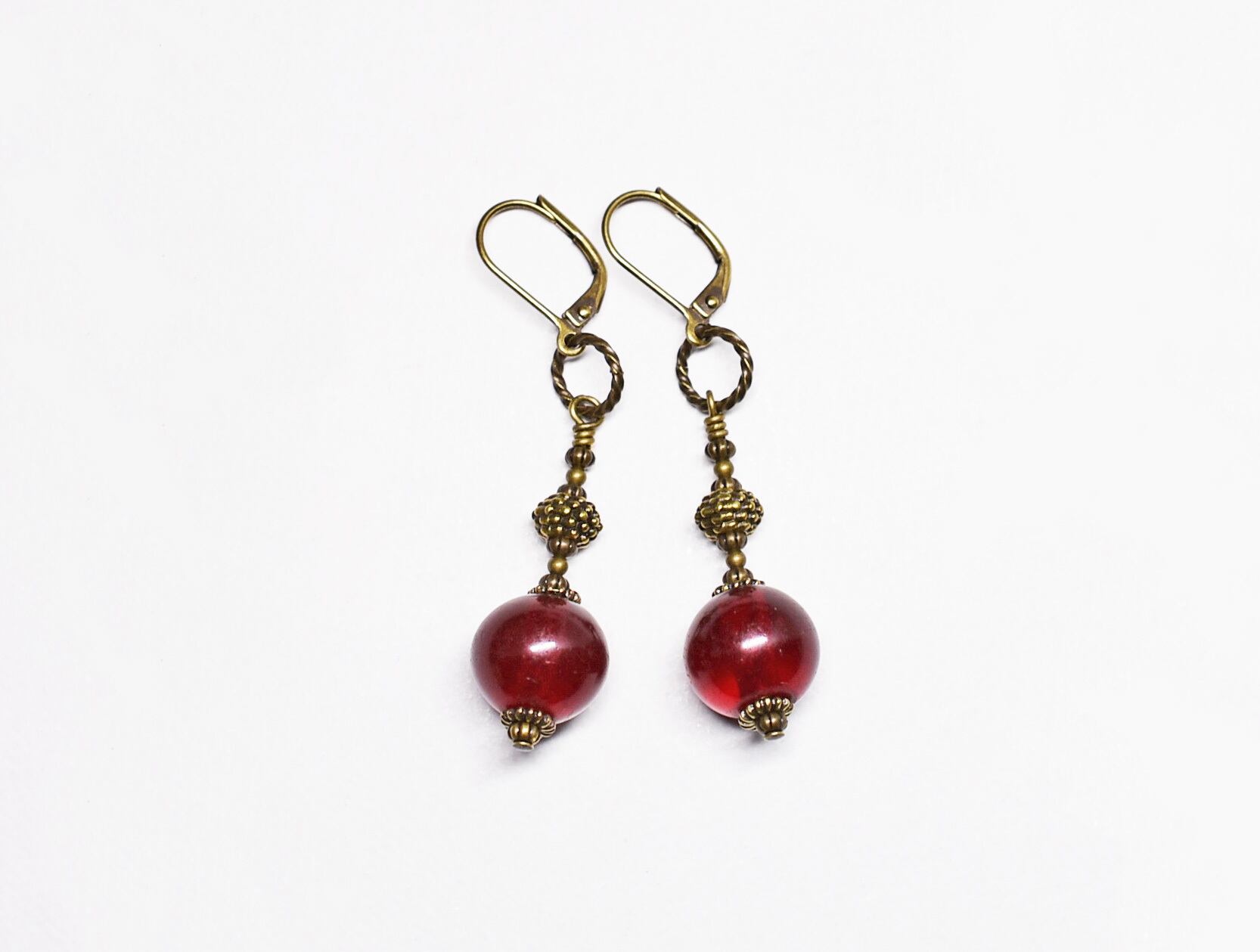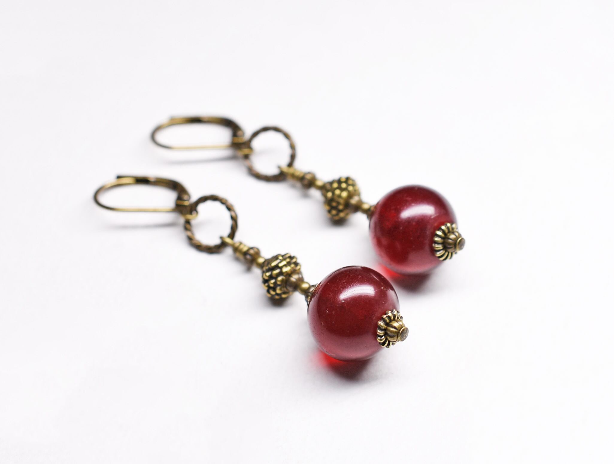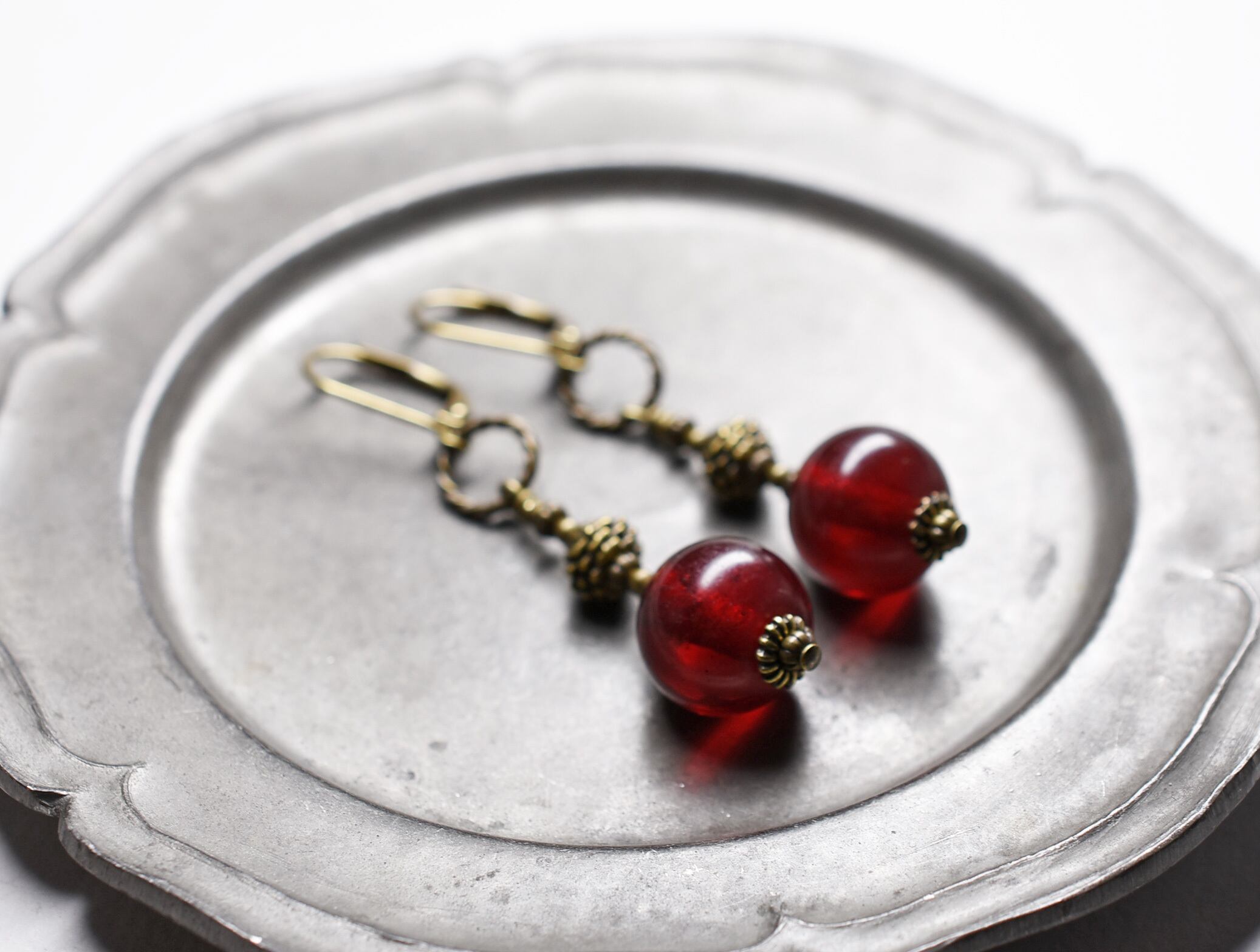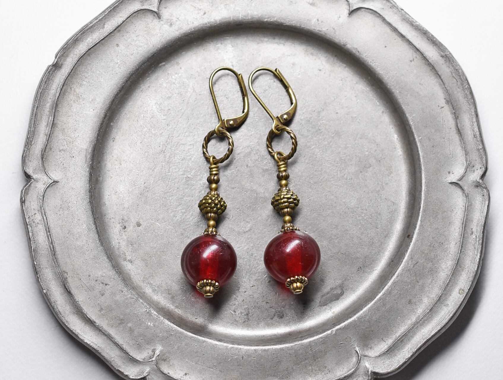 アンティークボヘミア紅玉ビーズと松ぼっくりブラスビーズのピアス