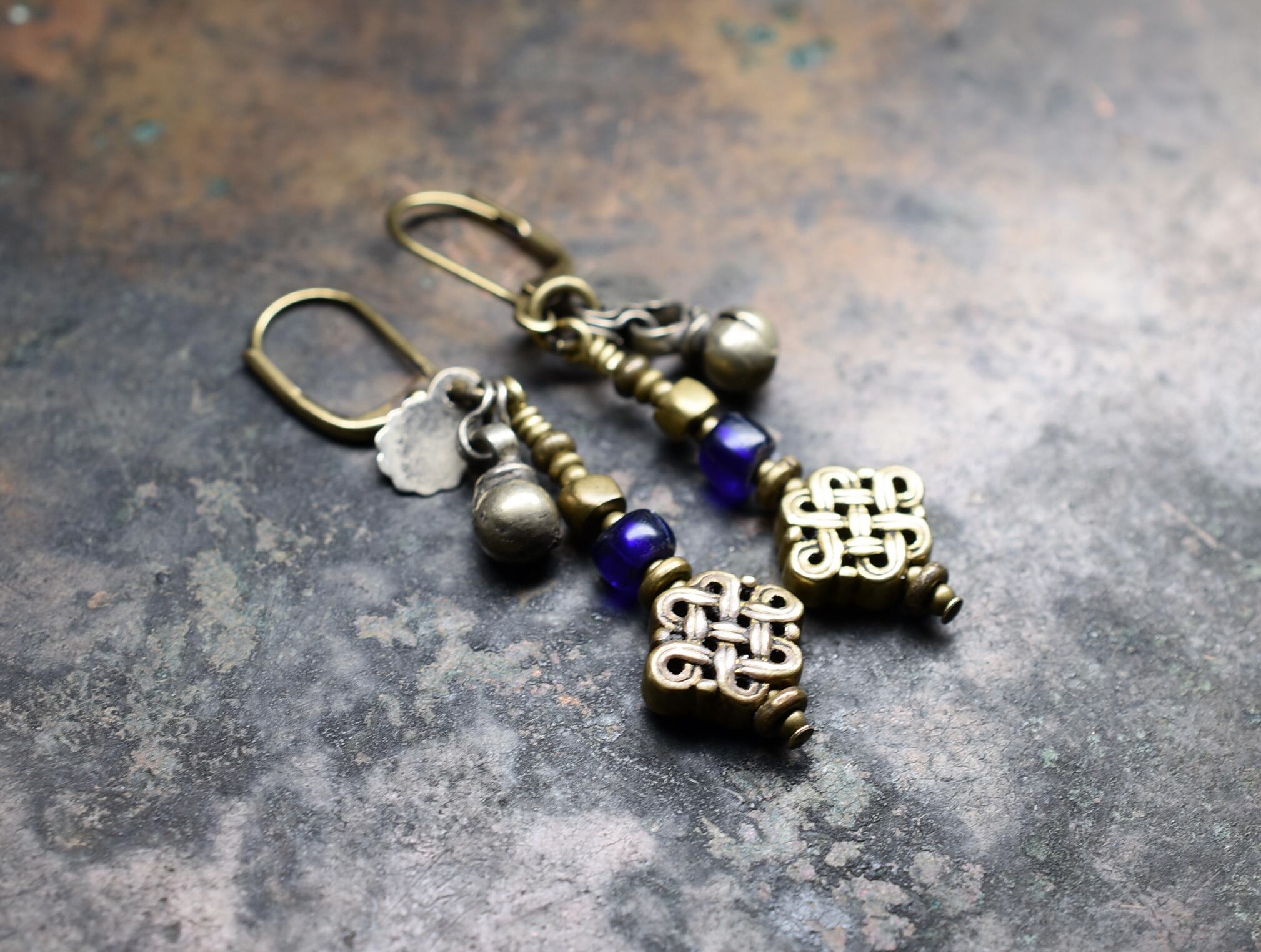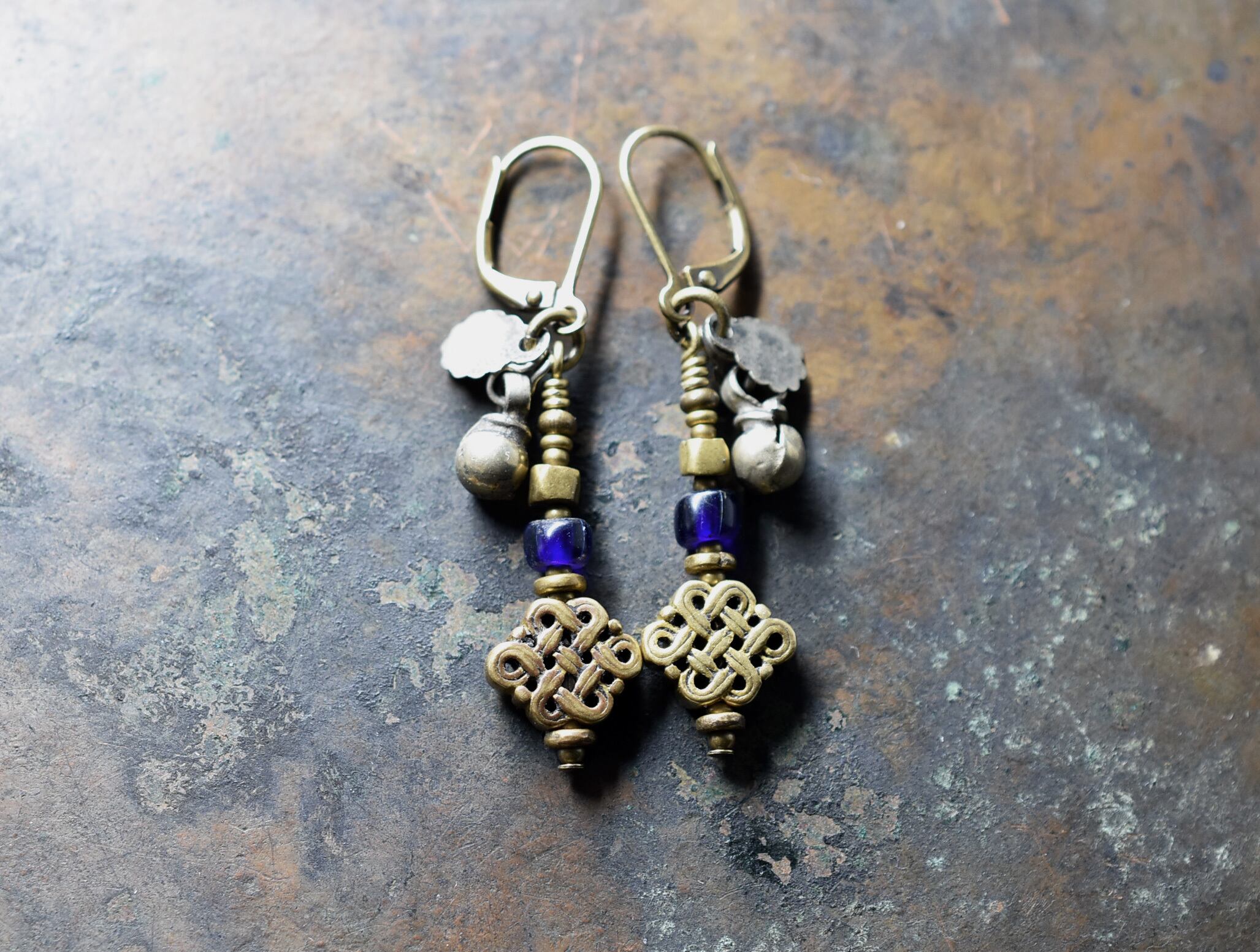 真鍮製のエンドレスノットと、瑠璃色のアンティークビーズ、民族の鈴と小さなプレートを繋いだピアスです。
