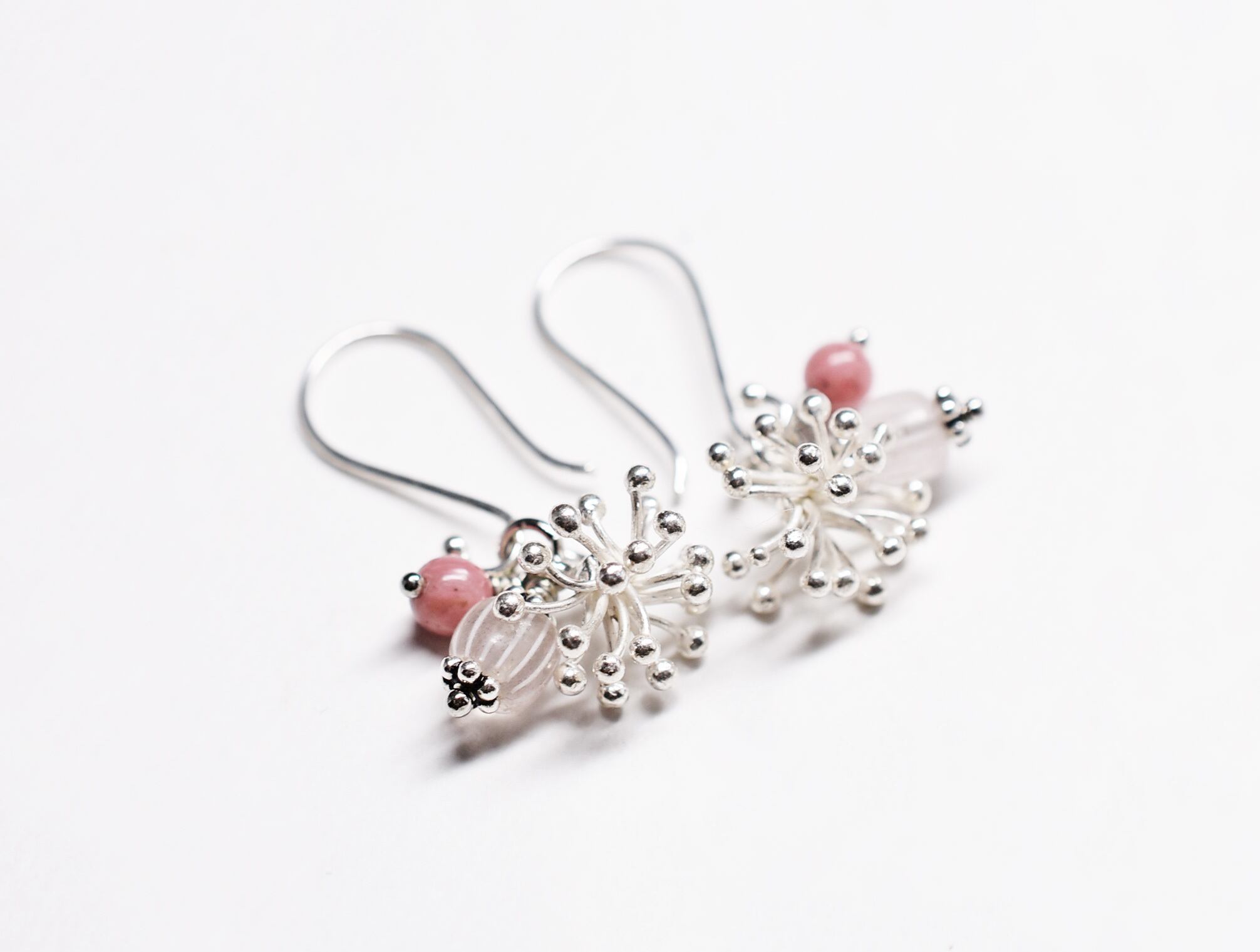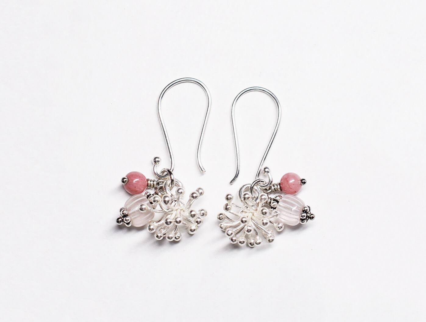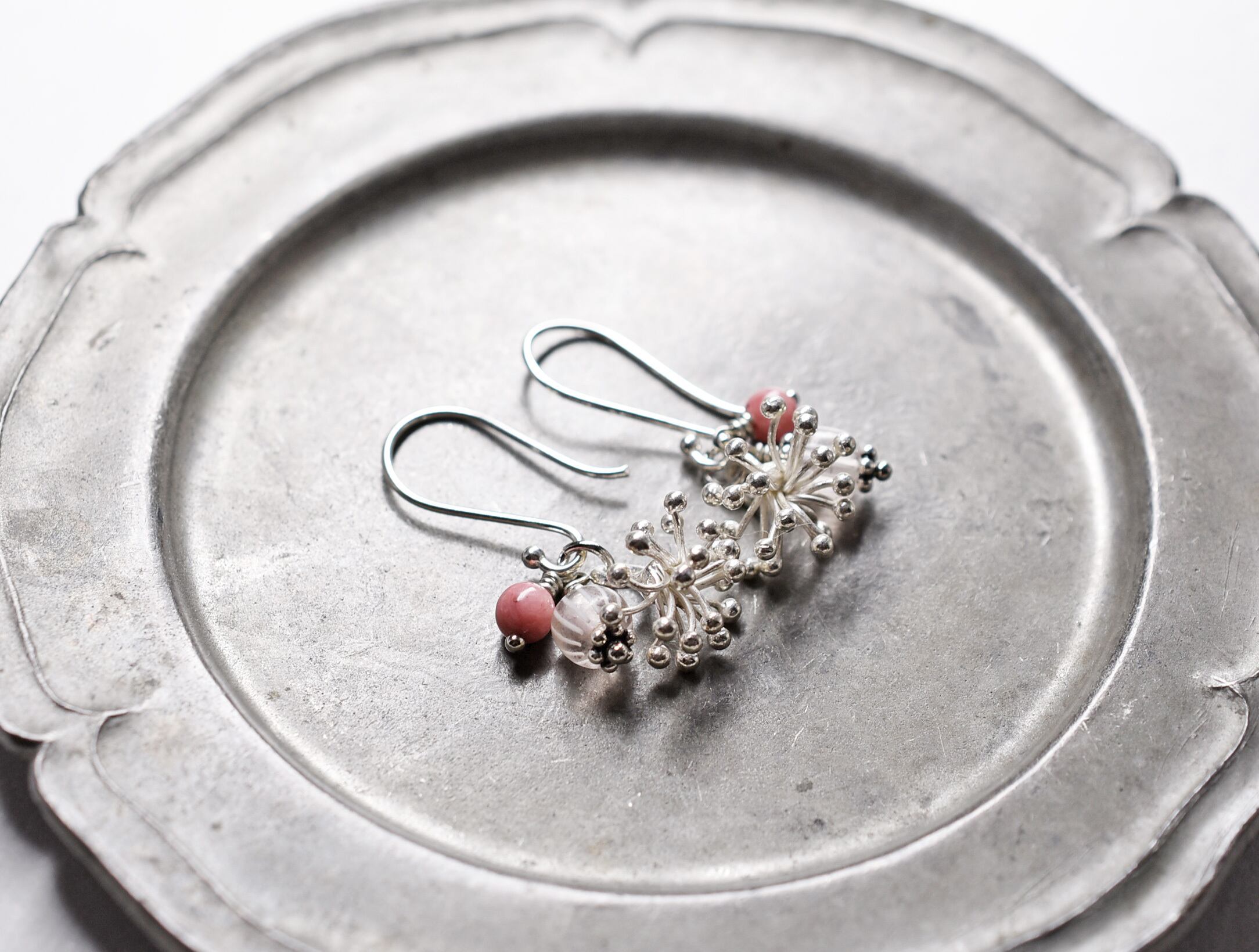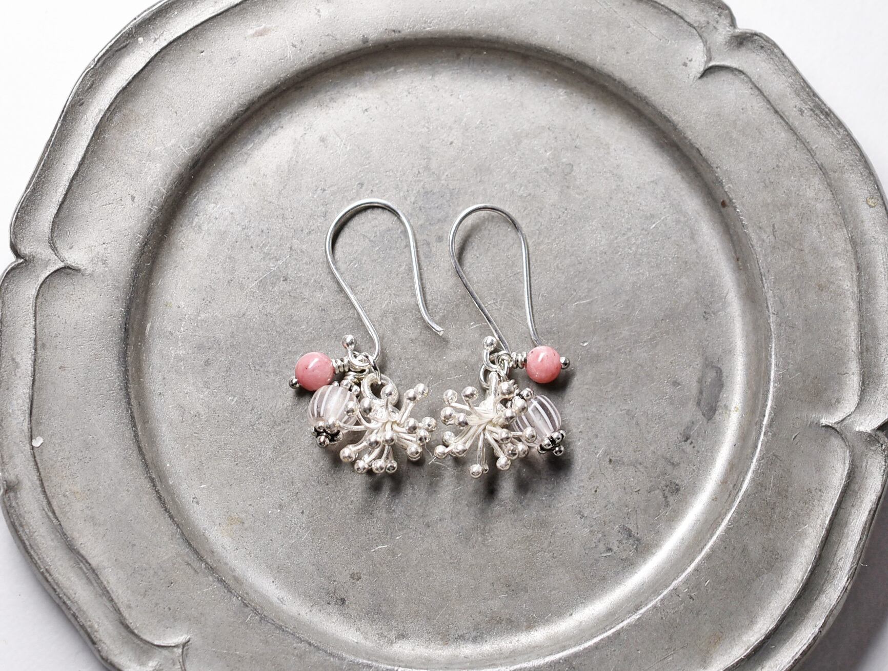 雪の☃️結晶のようなカレンシルバーとグーズベリー、ロードナイトを繋いだピアスです。