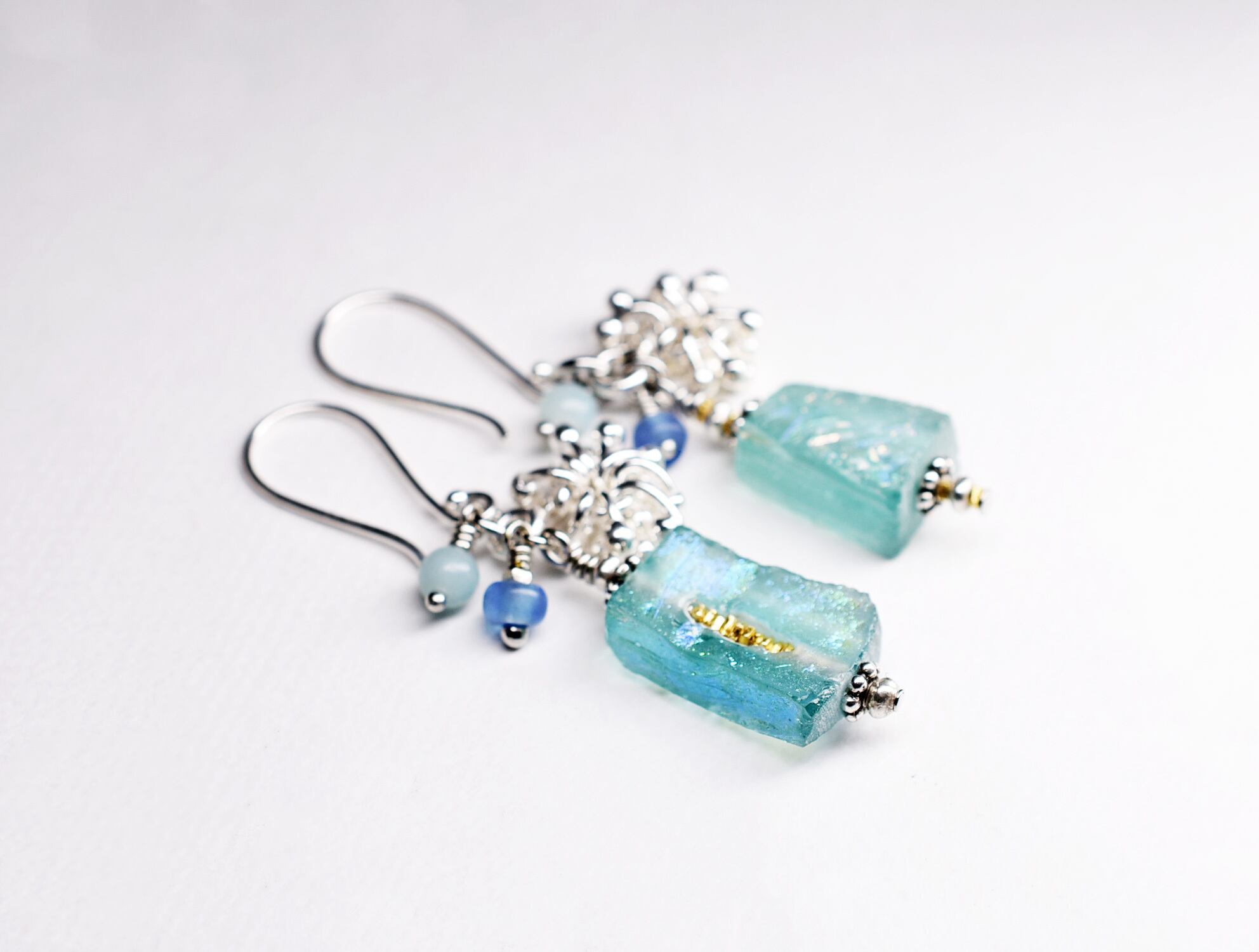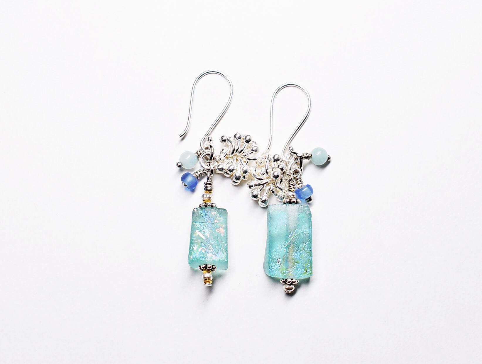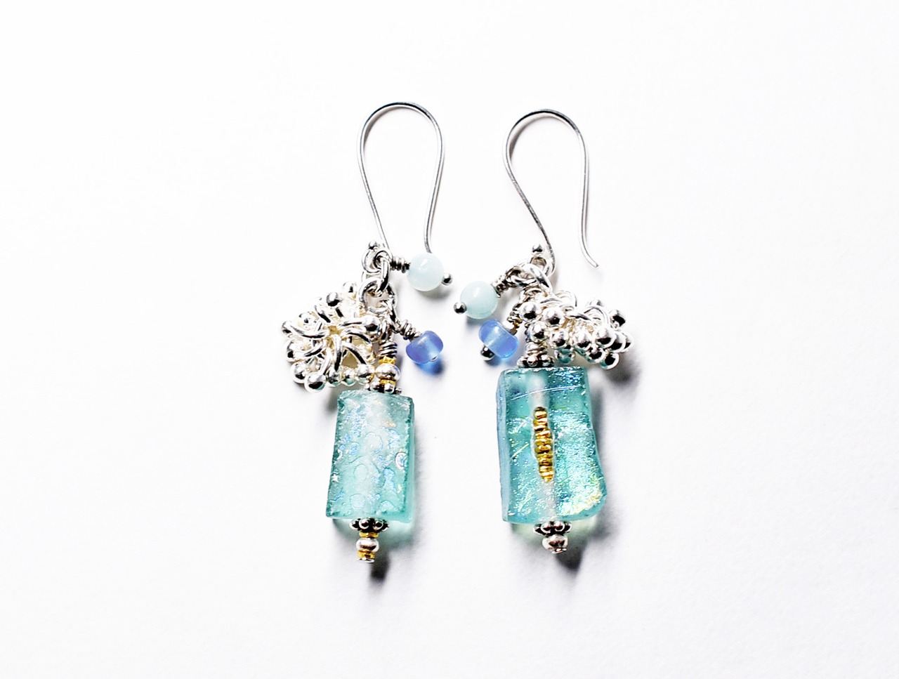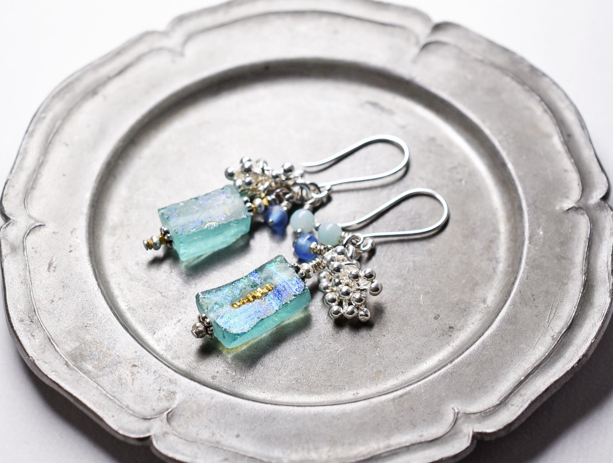 銀化ミントブルーローマングラスとしゃらりとしたカレンシルバーのピアス