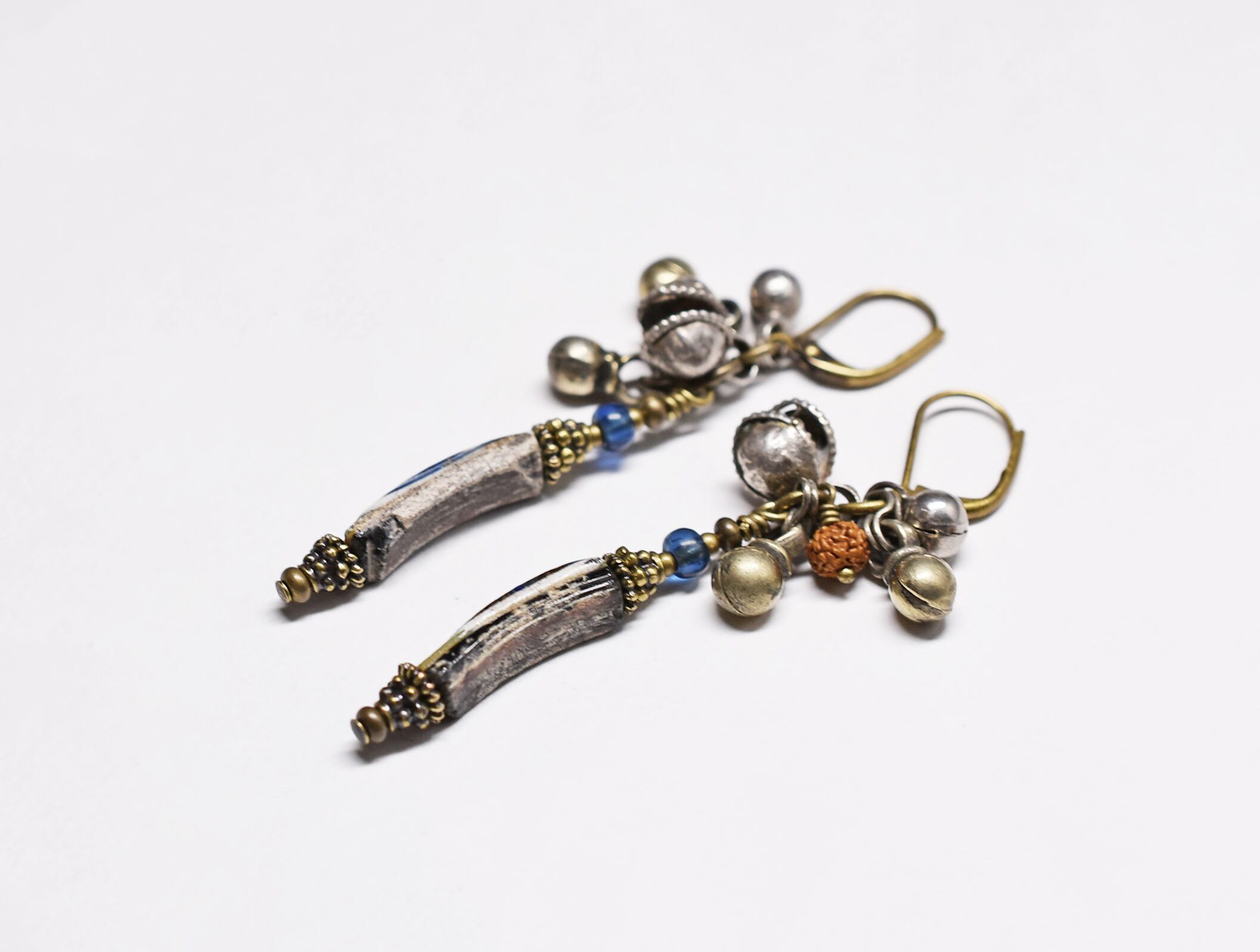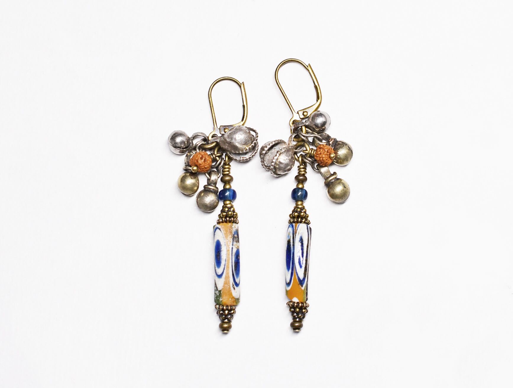 アイ(眼)が施されたローマングラスと、民族鈴、灰青色のアンティークビーズを繋いだピアスです。