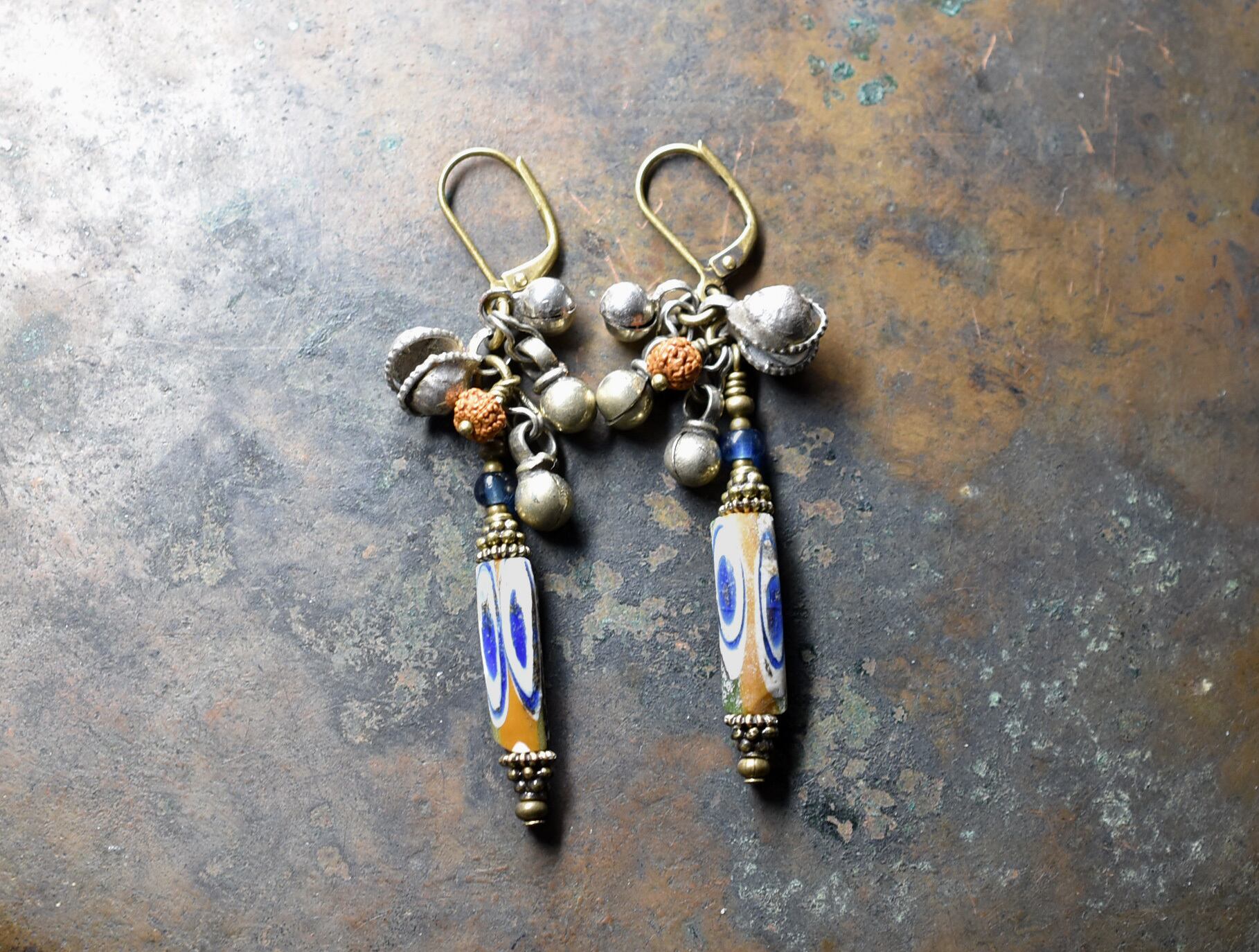ローマングラスアイビーズと鈴、小さなルドラクシャのピアス