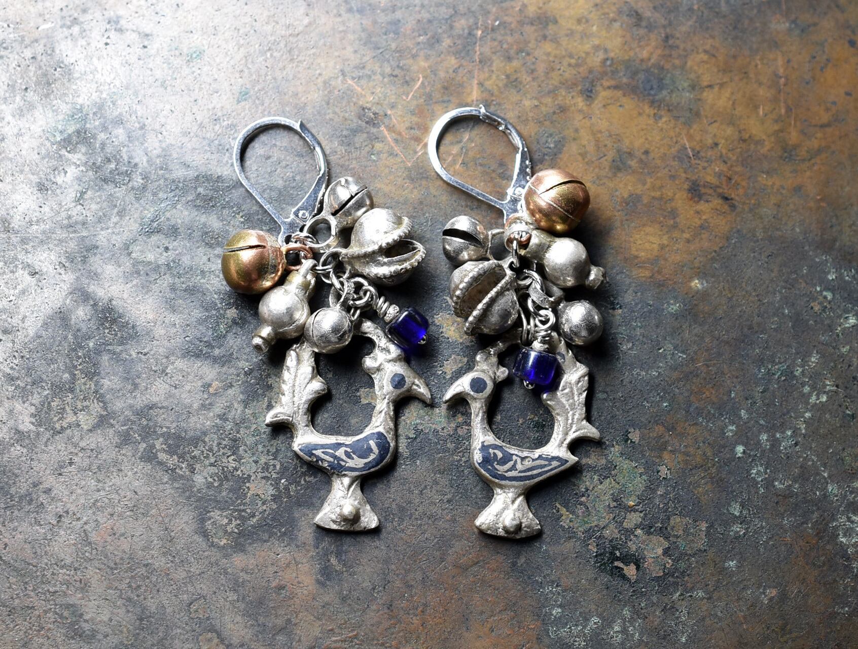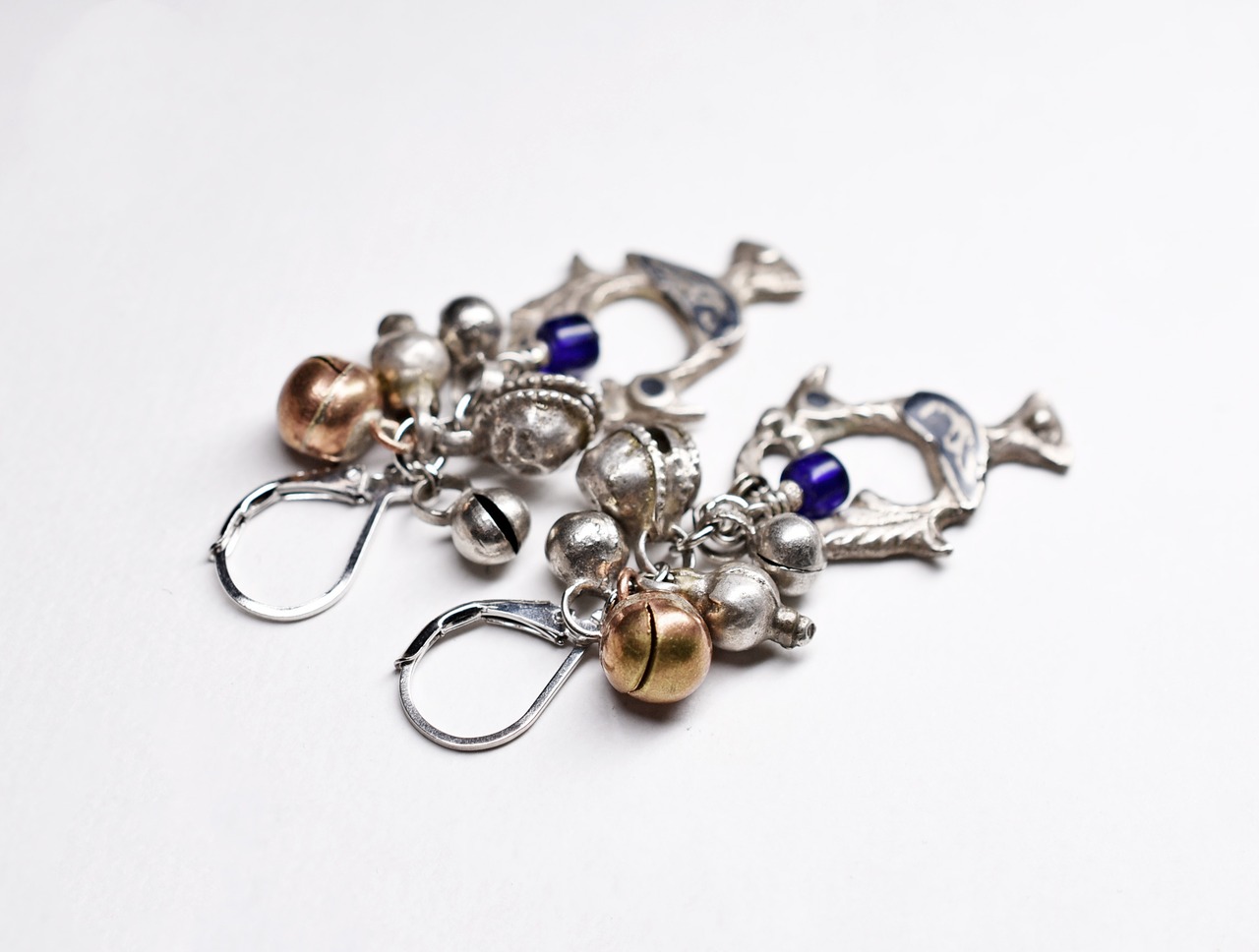 鳥型のアンティークパーツに、数種類の鈴、瑠璃色のアンティークビーズを繋いだピアスです。