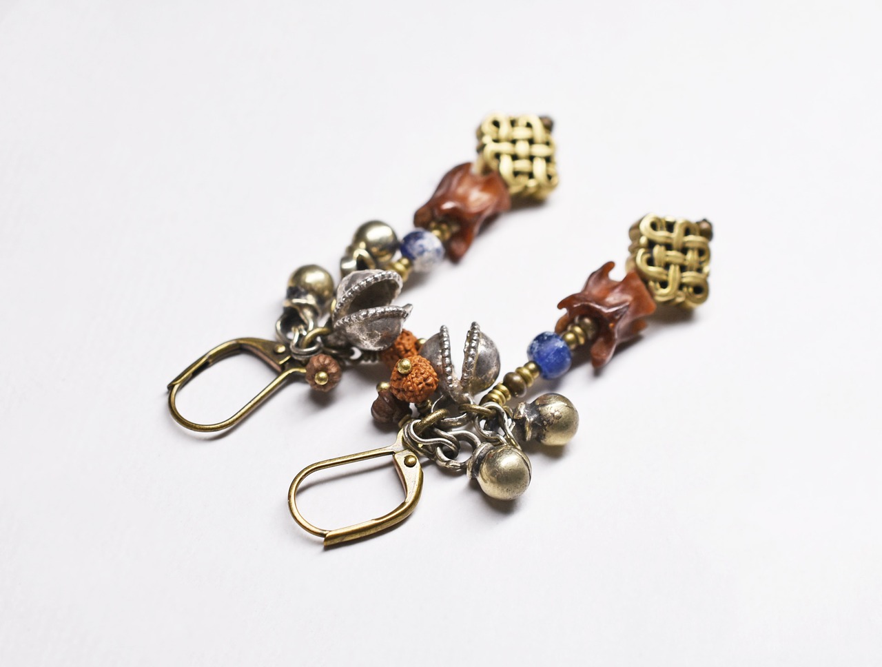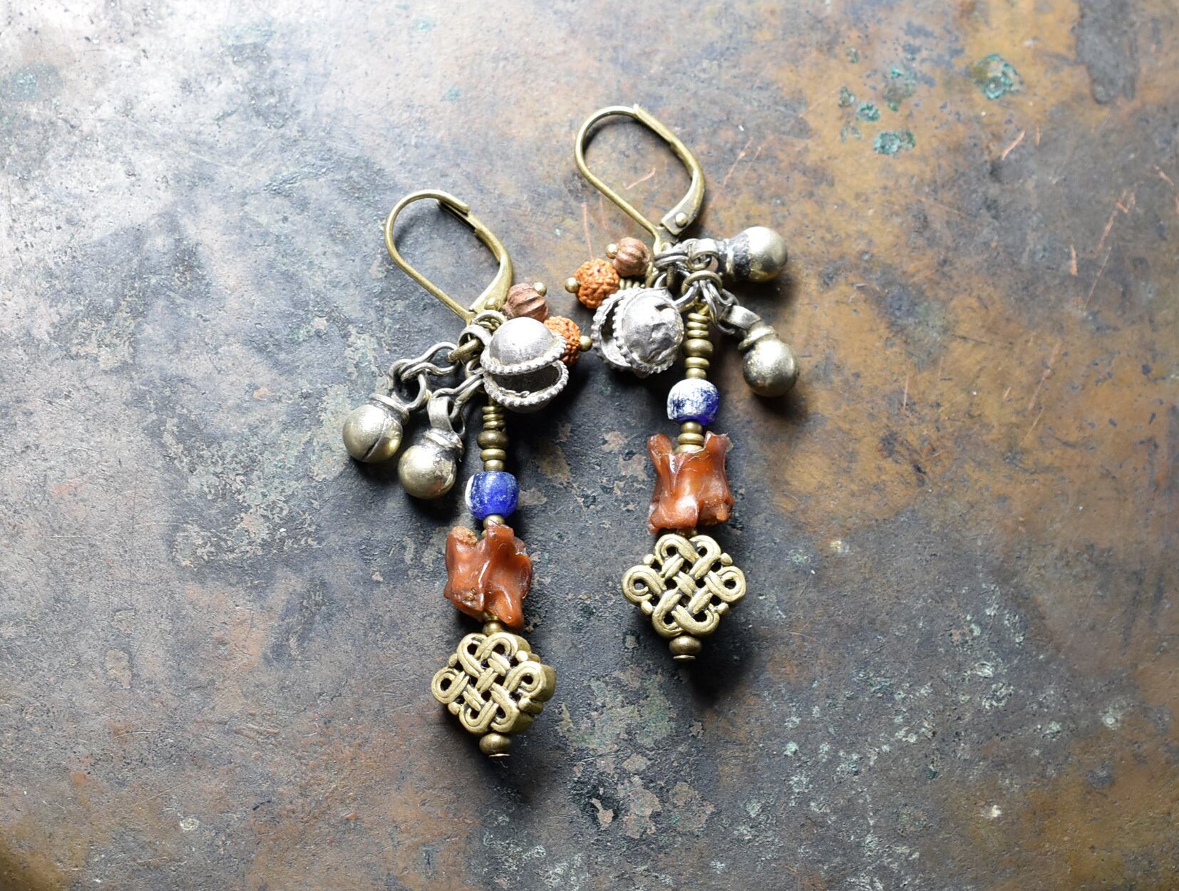 真鍮製のエンドレスノットと、蛇骨、発掘ビーズ、民族の鈴とルドラクシャ、木の実を繋いだピアスです。