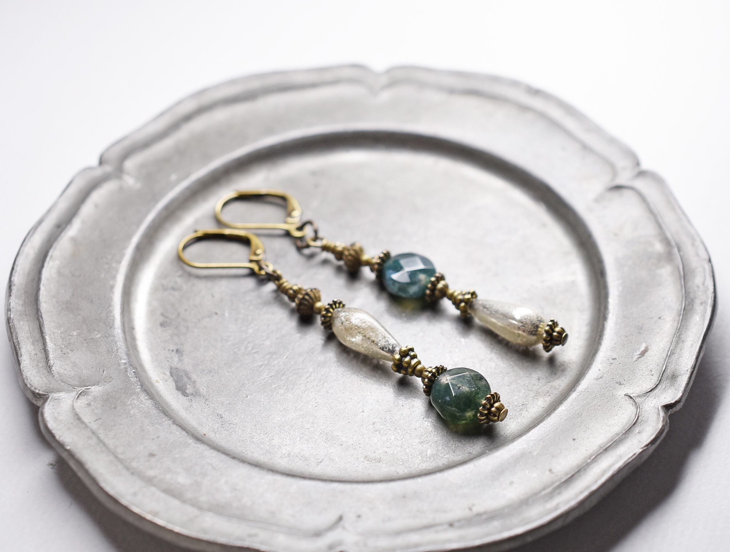 フランスアンティーク吹きガラスとインディアンアゲートのアンシメトリーピアス