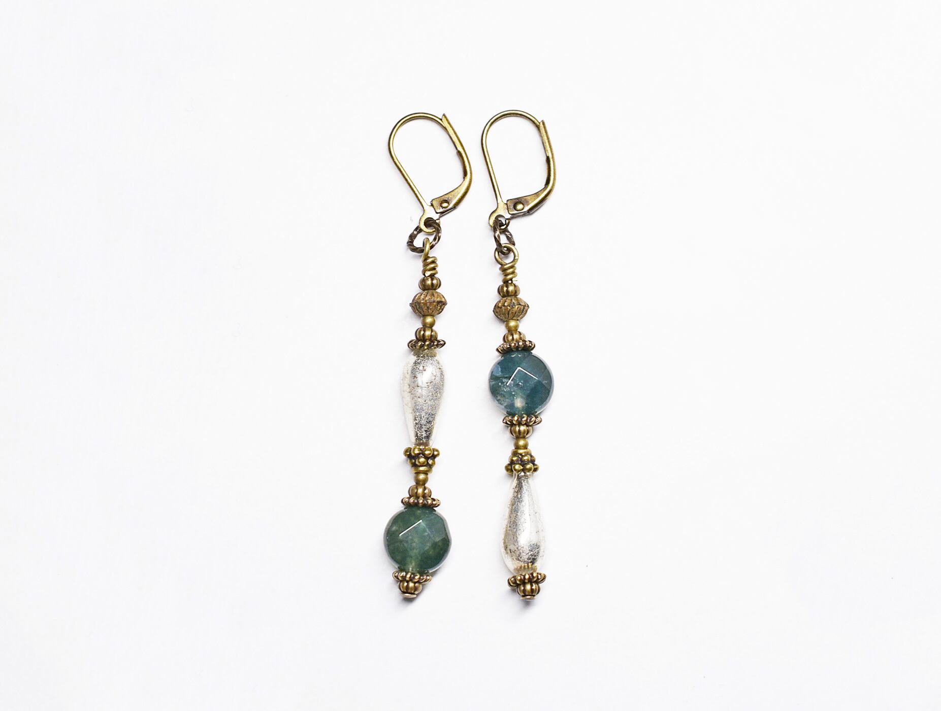フランス産の吹きガラスパーツと、インディアンアゲート、ブラスビーズを繋いだピアスです。