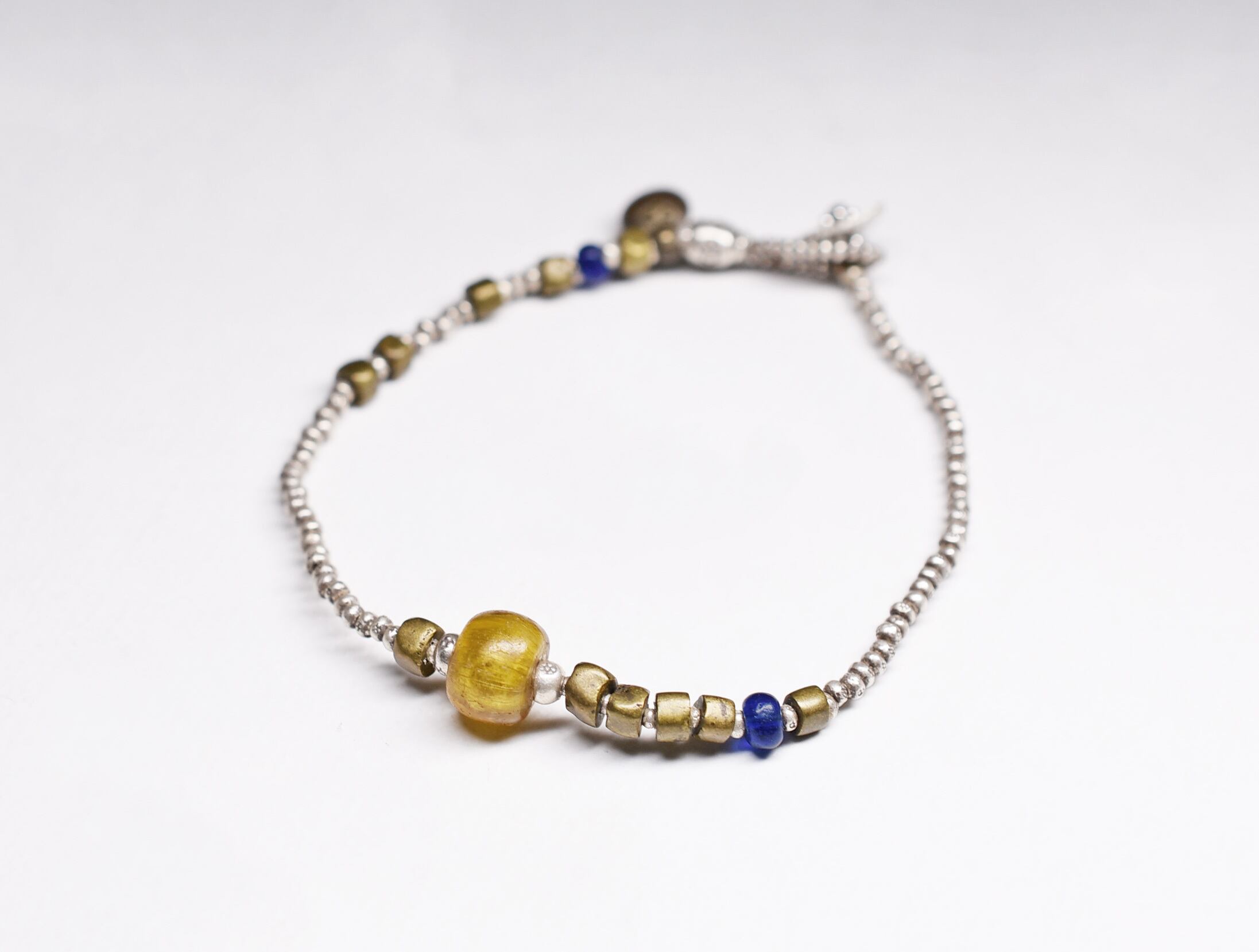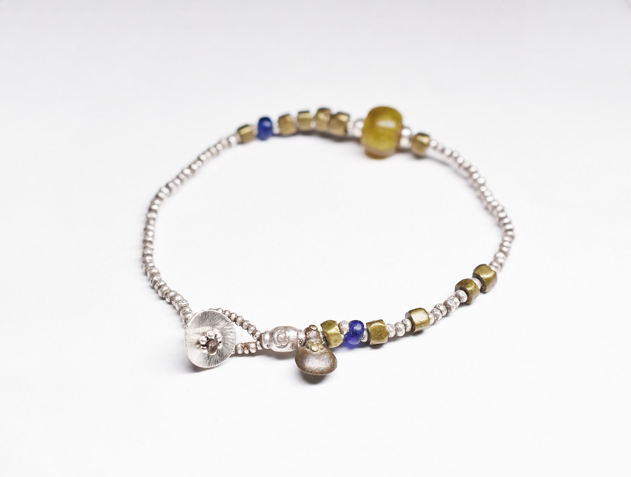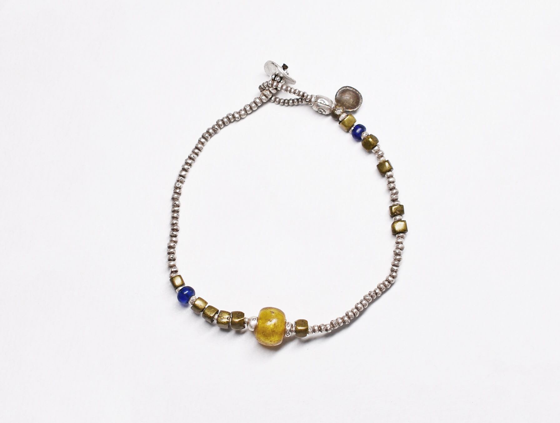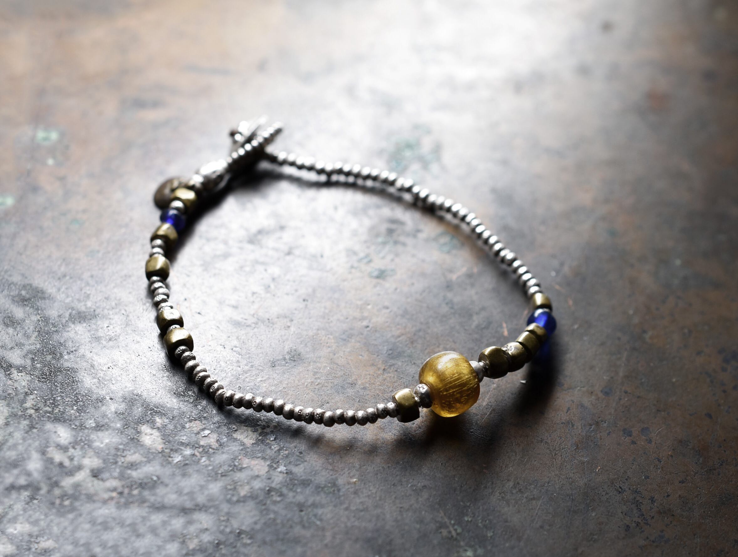 ゴールドサンドイッチとoldオリッサブラス、カレンシルバー、ブルーアンティークビーズを繋いだブレスです。