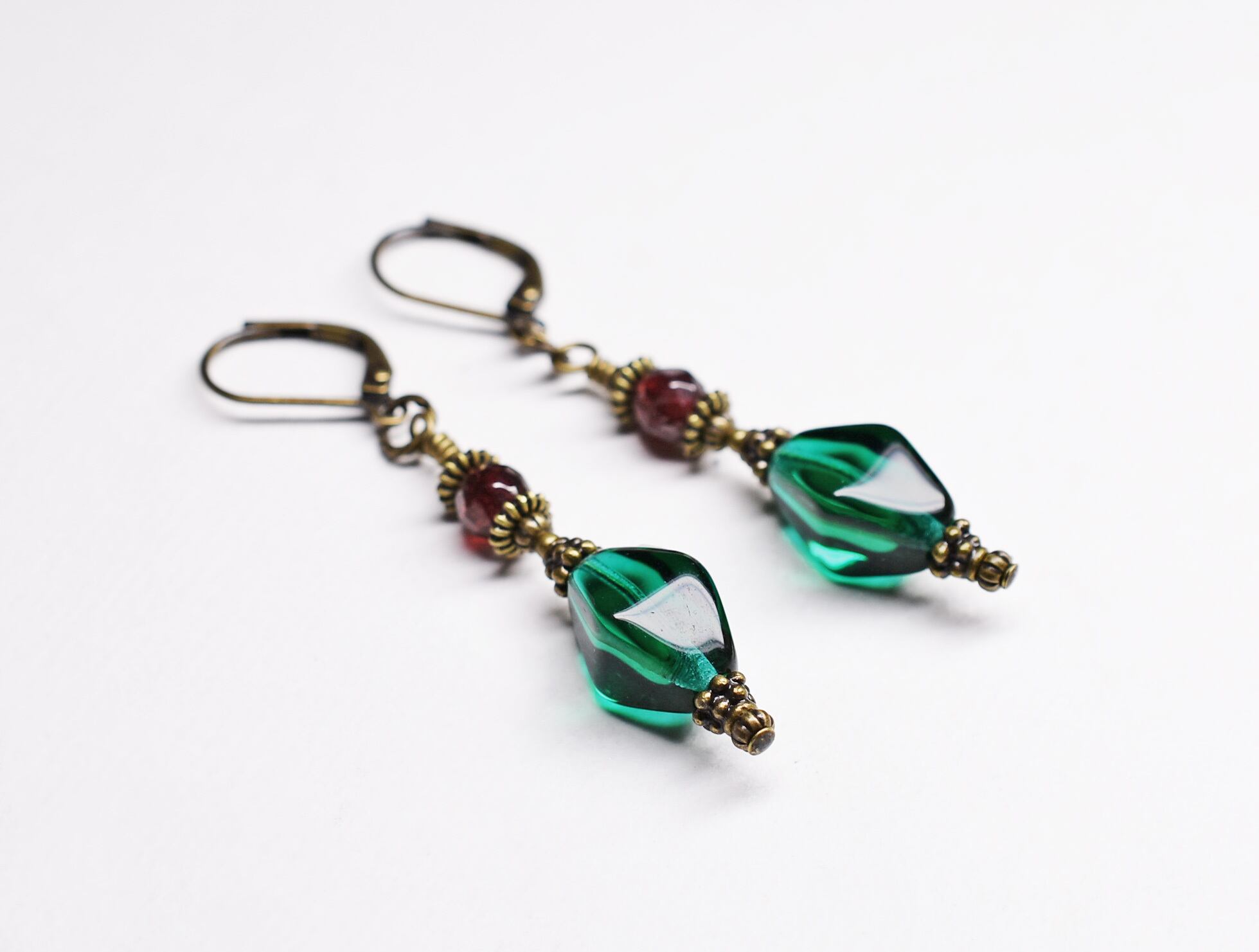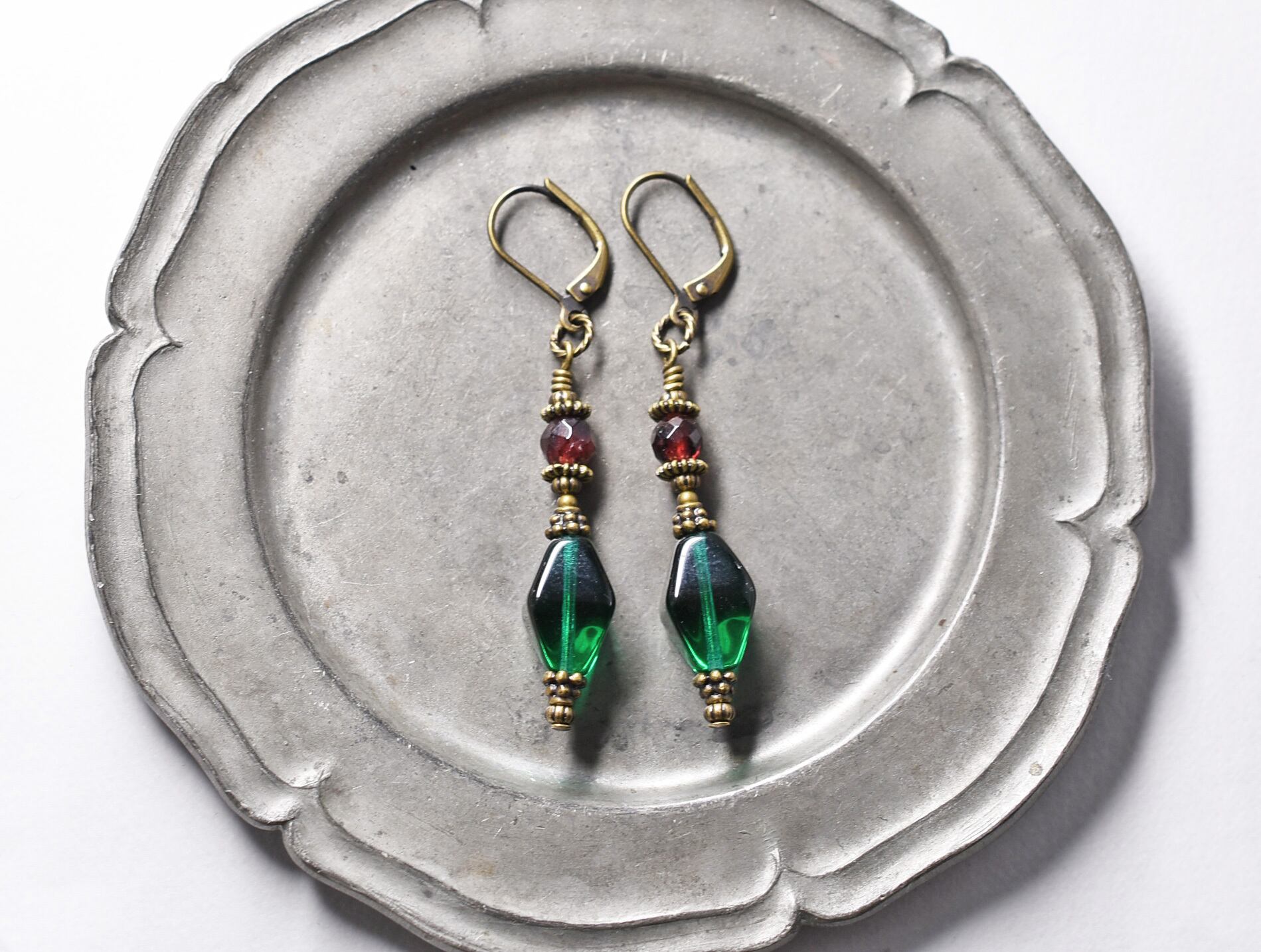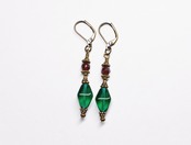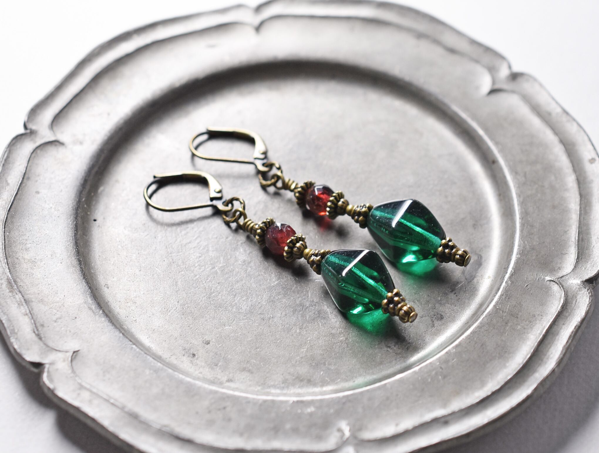グリーンチェコヴィンテージビーズとガーネットのピアス
