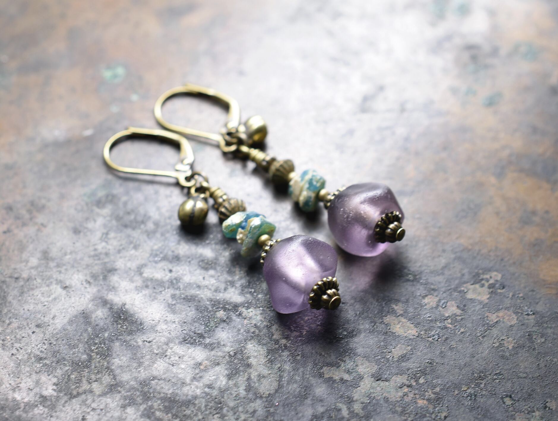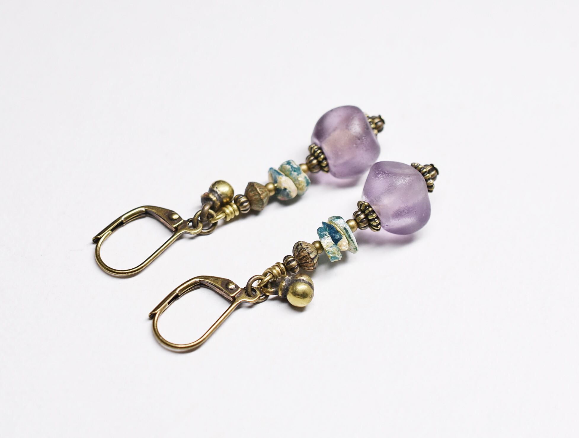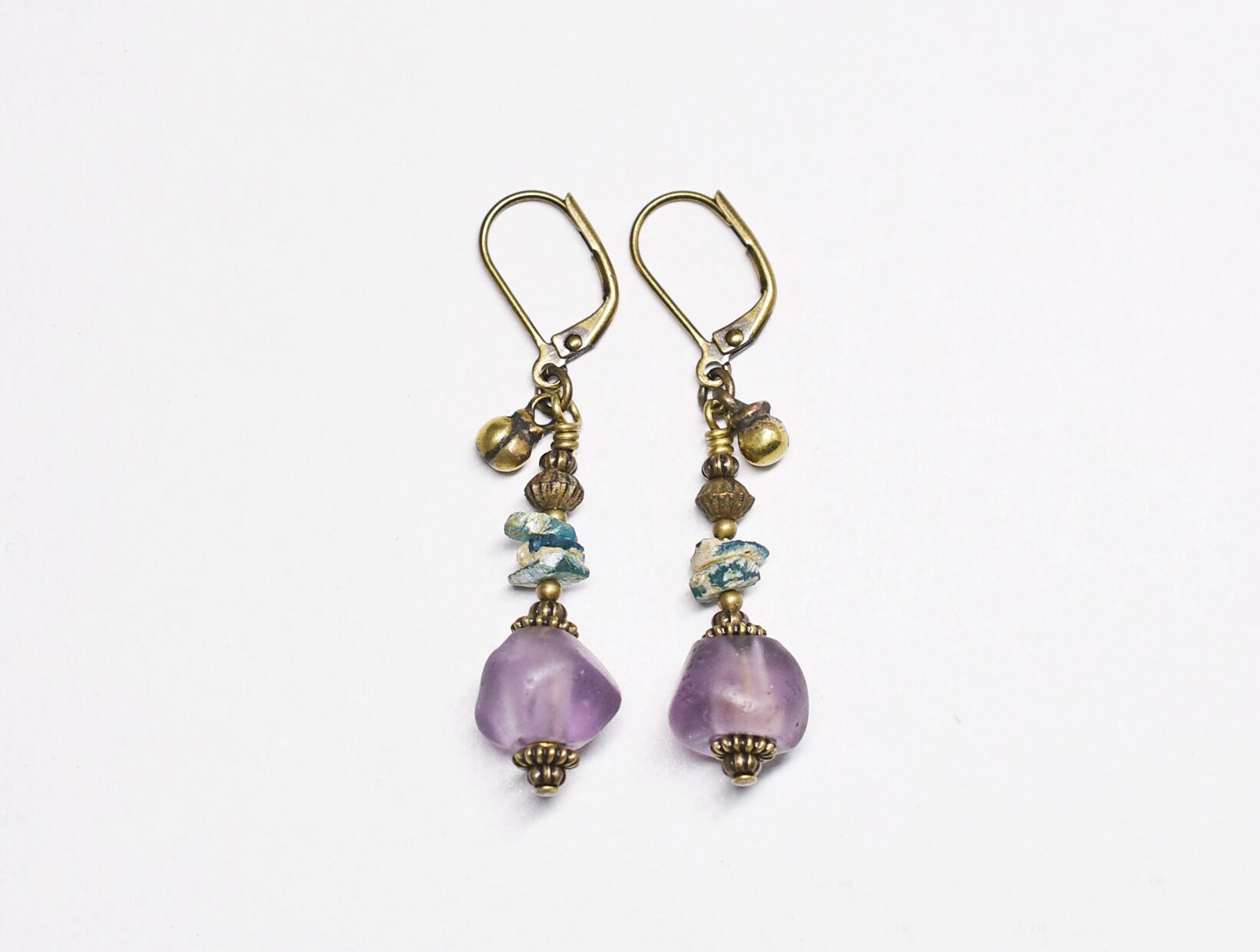 ドゴン族のすみれ色のビーズと、ローマングラス、ブラスビーズ、民族の鈴を繋いだアンシメトリーなピアスです。
