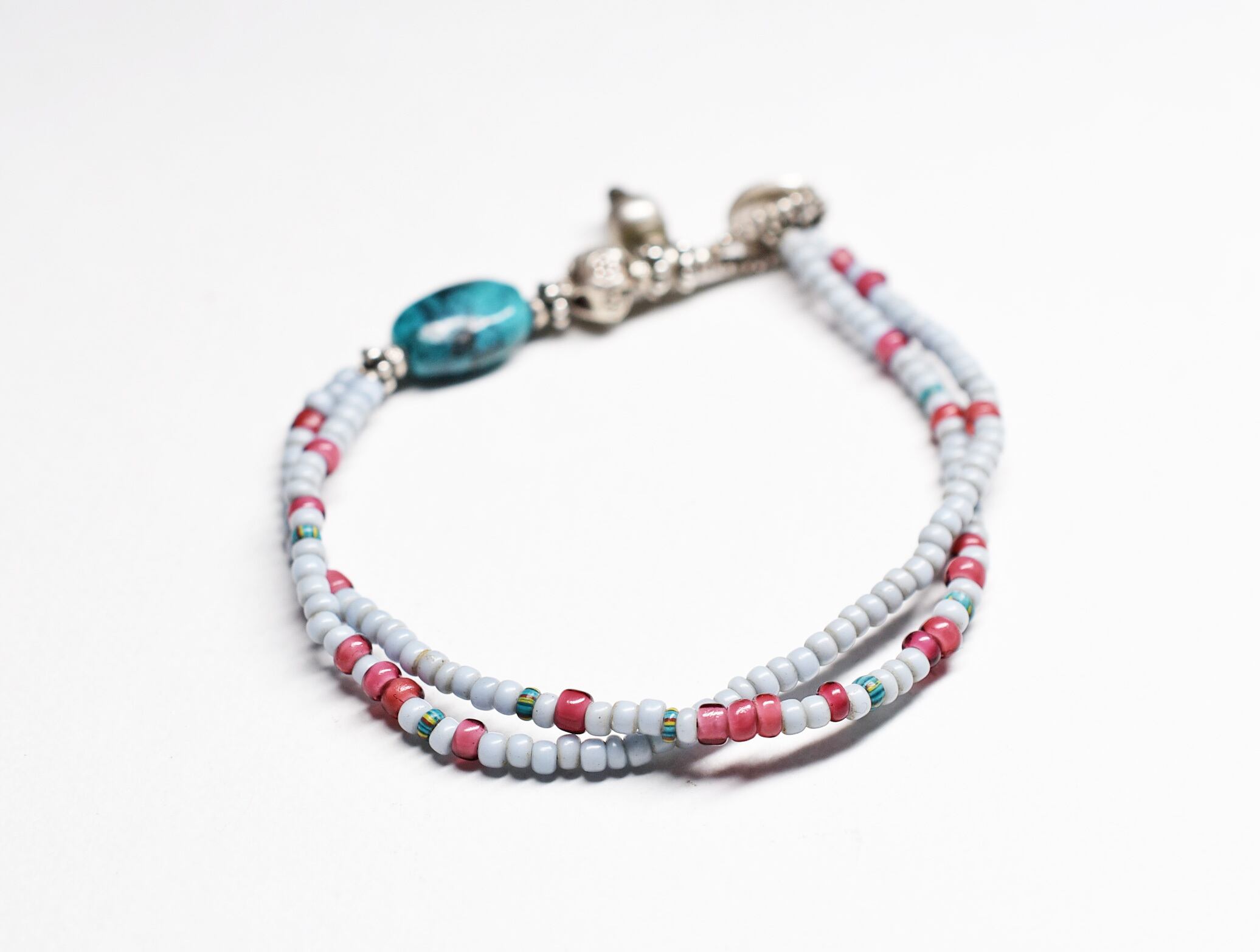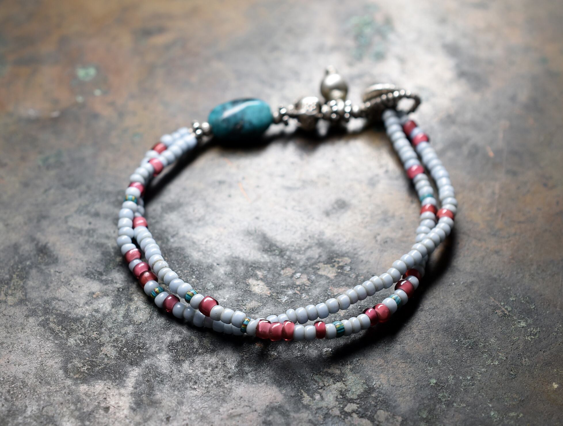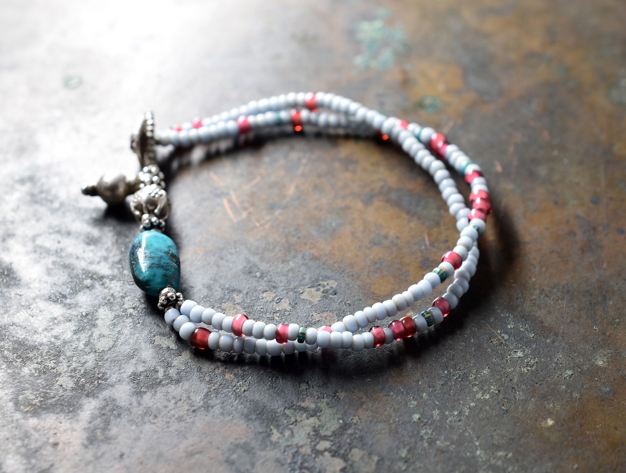 ベネチアシードビーズと金赤ホワイトハーツ、チベタンターコイズの2連ブレス