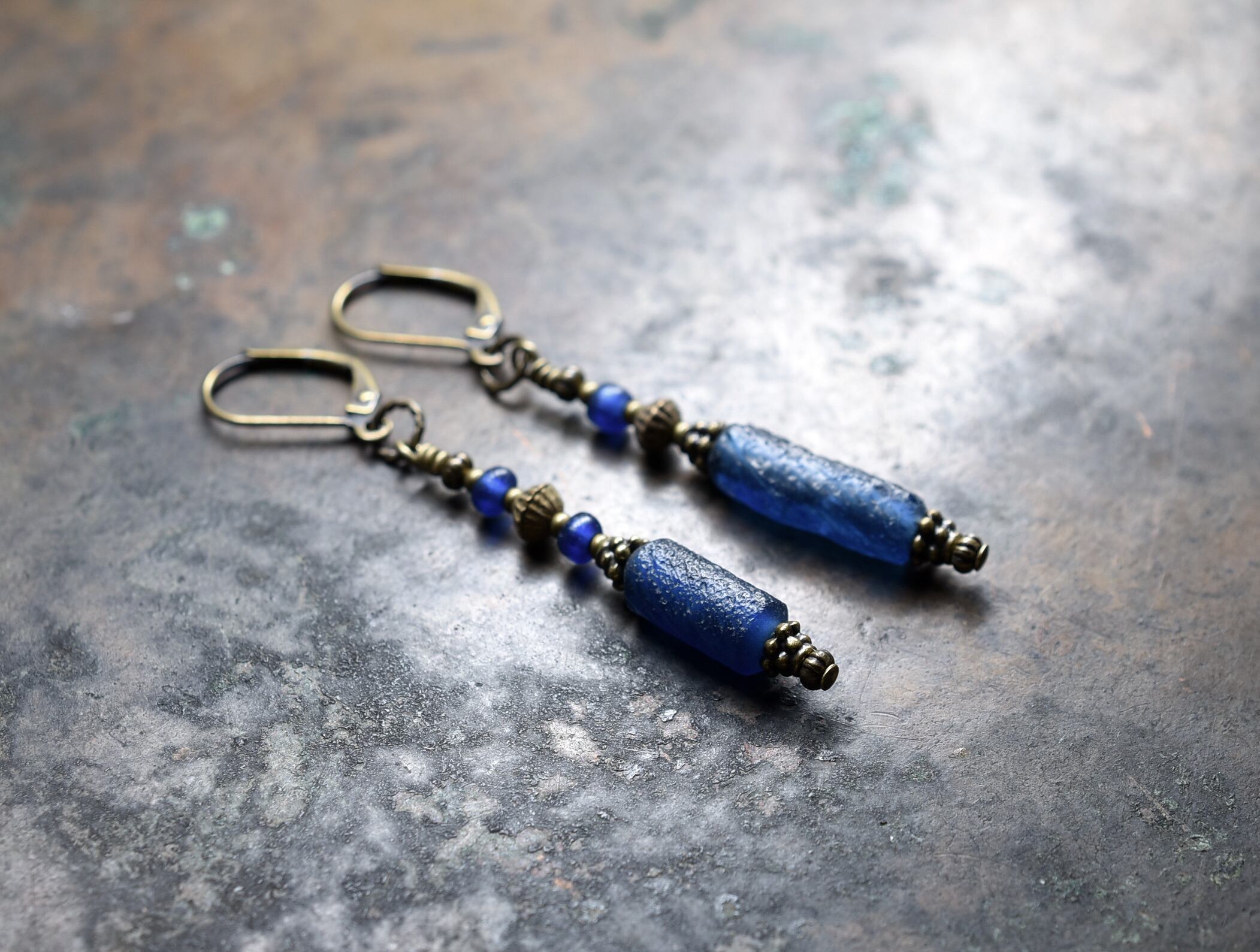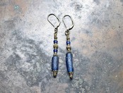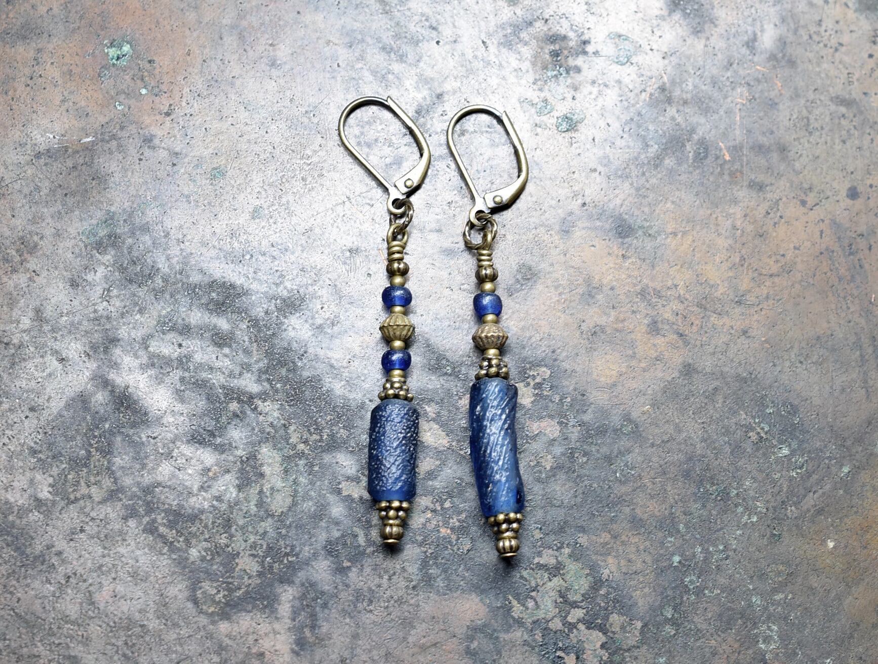 ブルーのローマングラスと、インドパシフィックビーズ、ブラスビーズを繋いだアンシメトリーなピアスです。