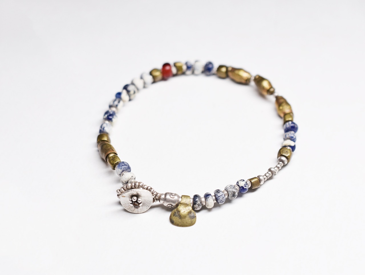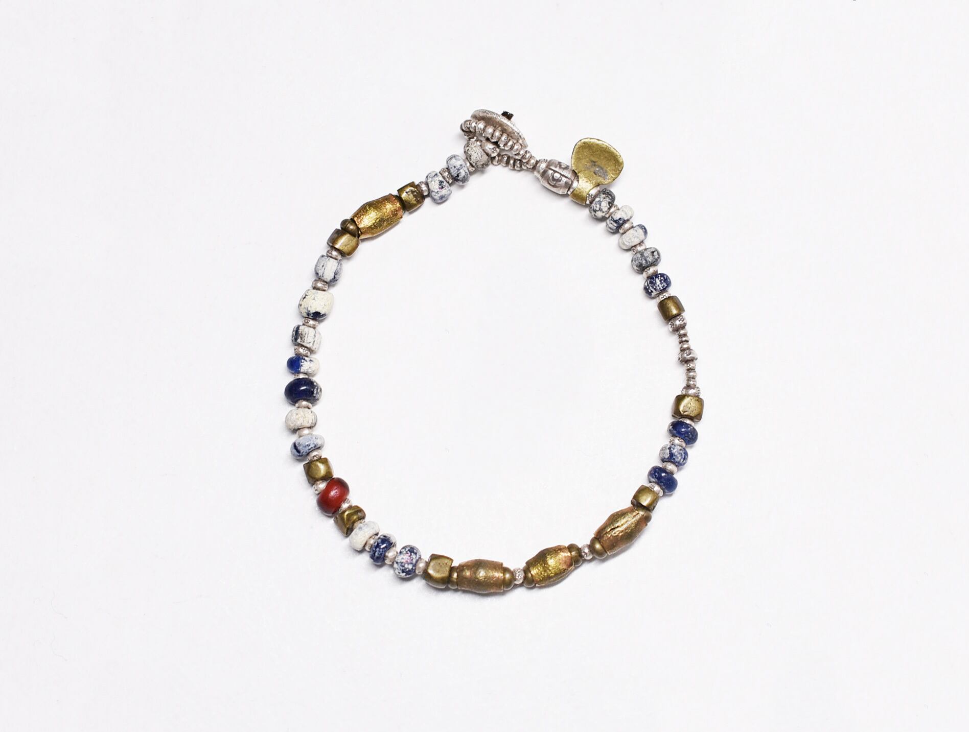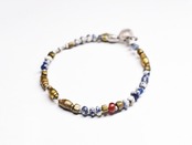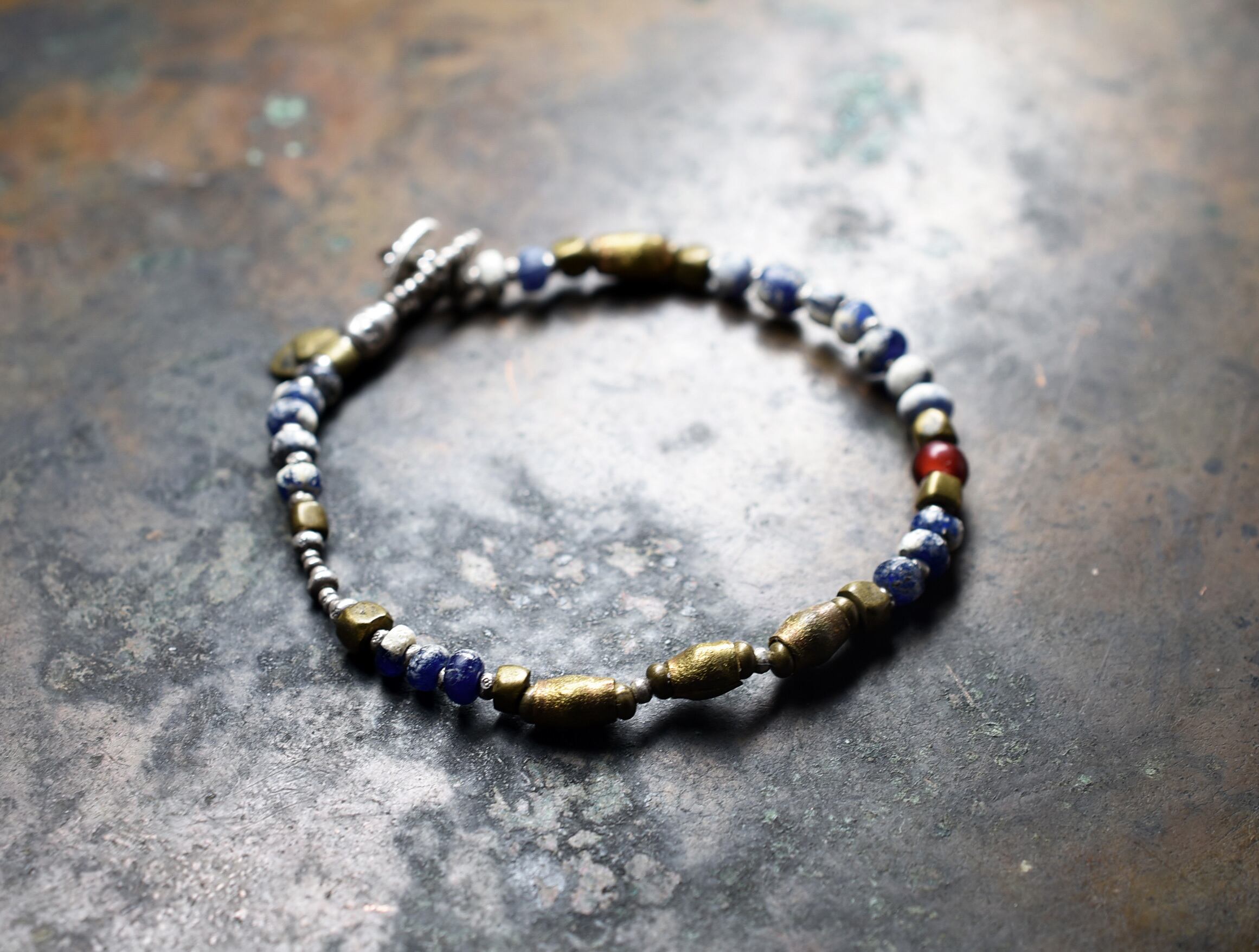 出土ビーズと、金赤ホワイトハーツ、アフリカンブラス、oldオリッサブラスなどを繋いだブレスです。