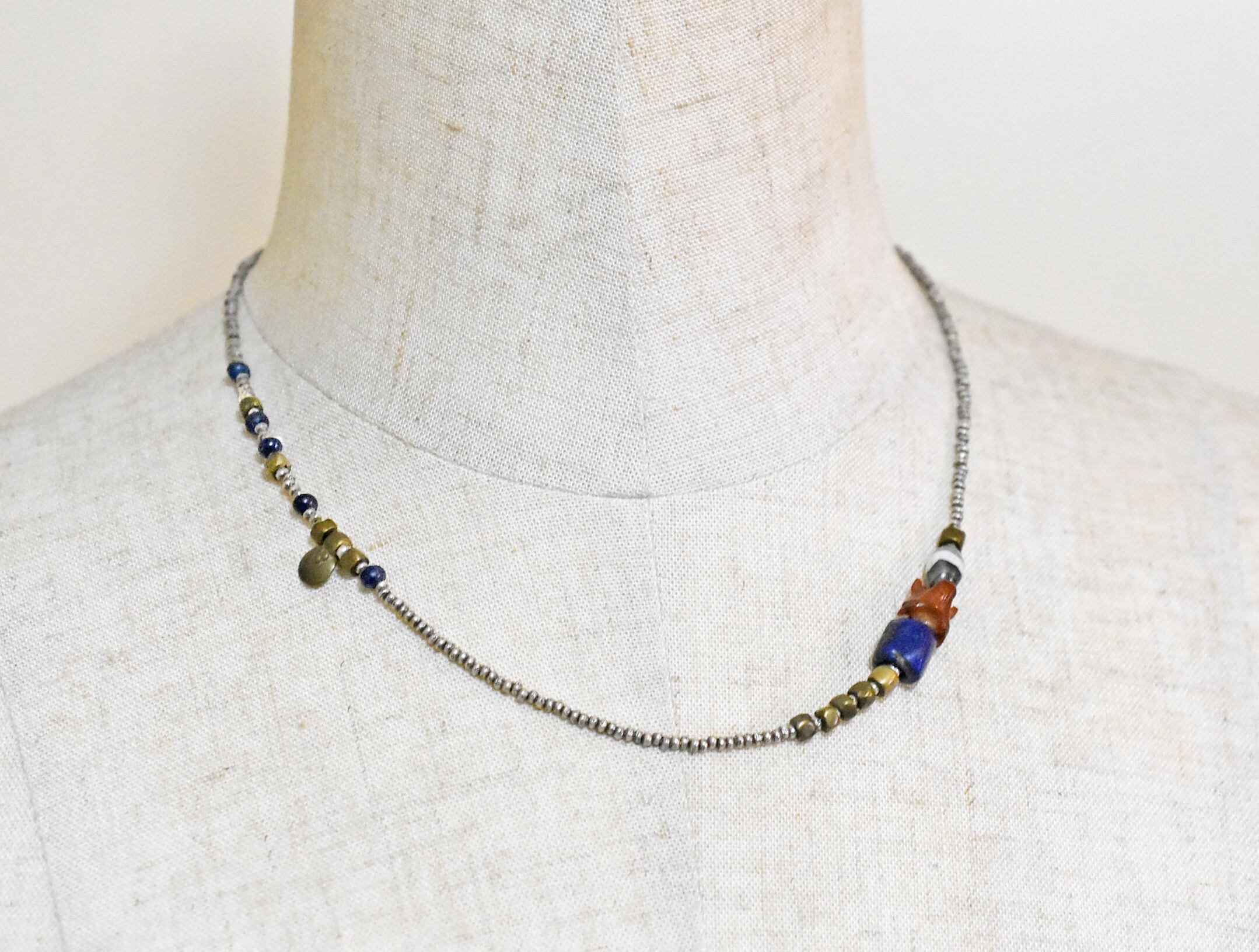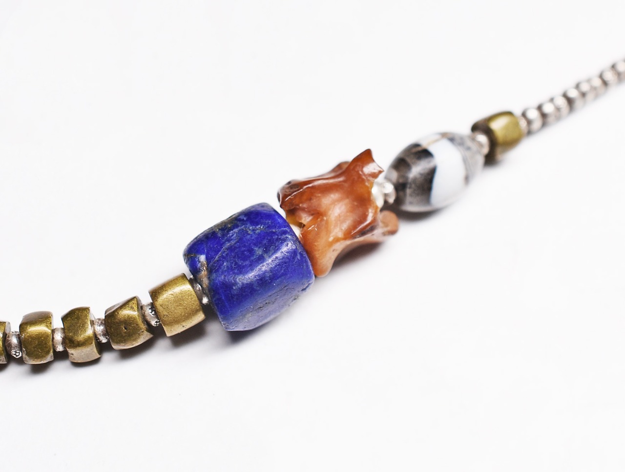 素材:古代ラピスラズリ、古代瑪瑙、蛇骨、ガラス、カレンシルバー、真鍮、ワイヤー