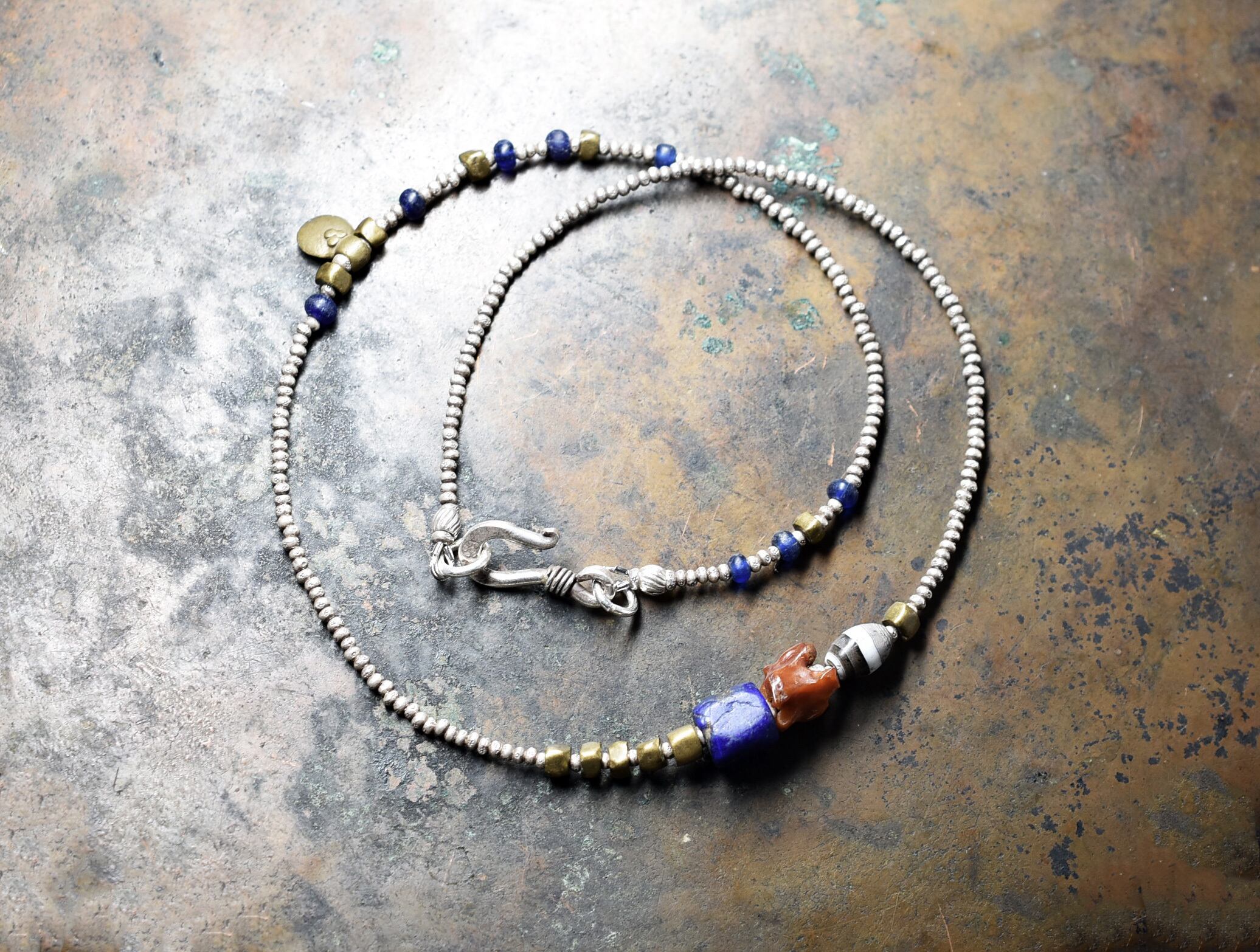 とても古いラピスラズリと瑪瑙、蛇骨、oldオリッサブラスなどを小さなカレンシルバービーズで繋いだネックレスです。