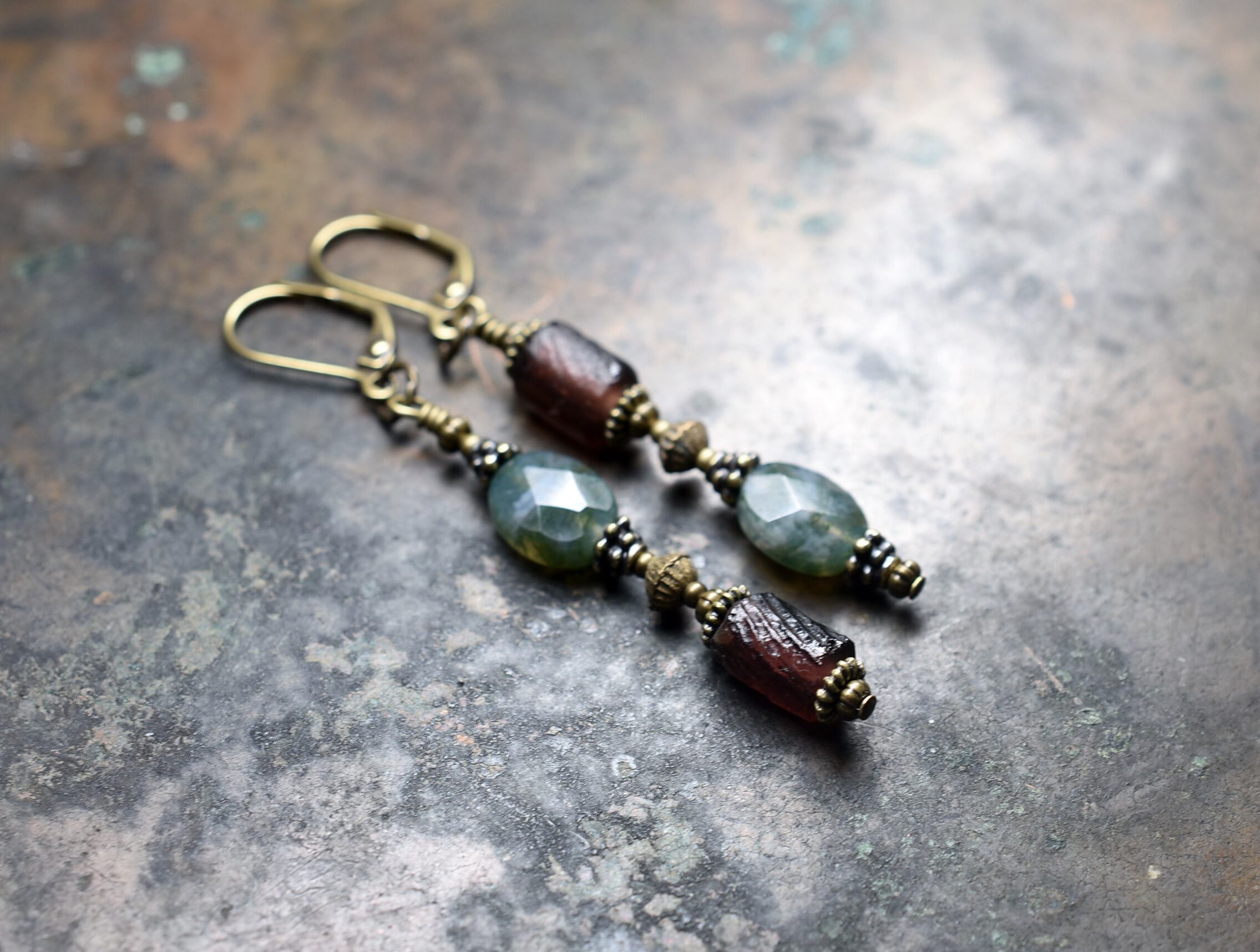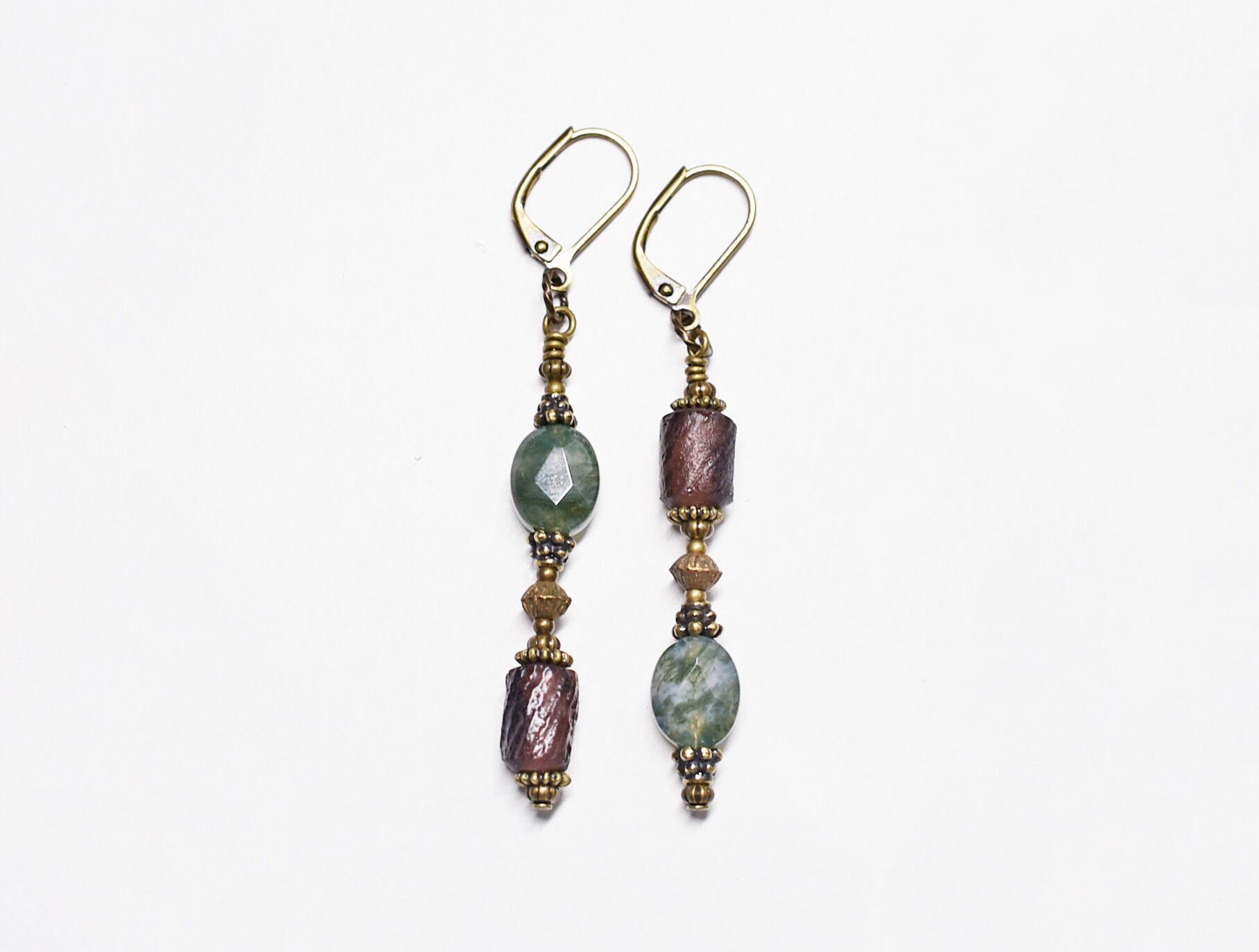 ローマングラスとインディアンアゲート、ブラスビーズのアンシメトリーピアス
