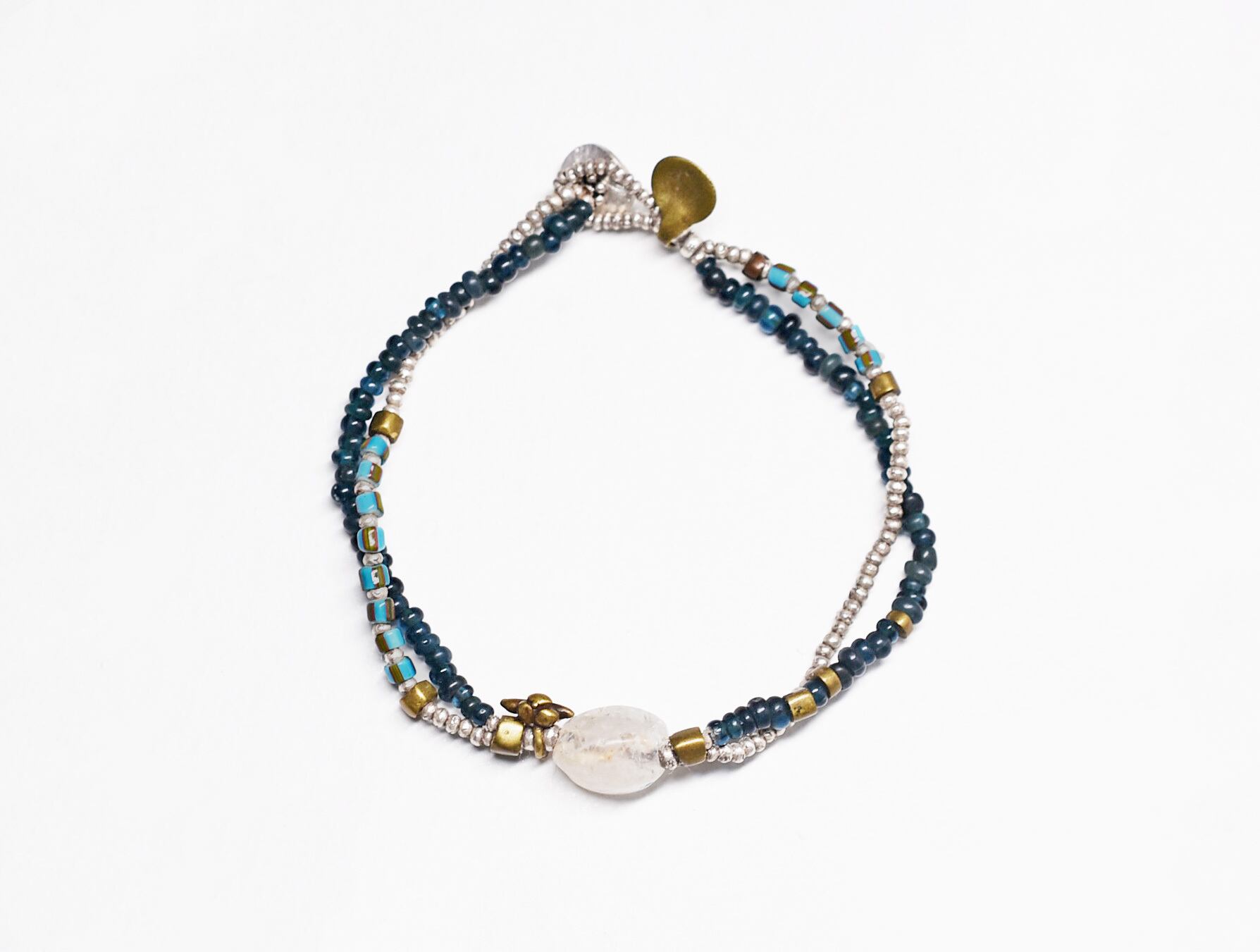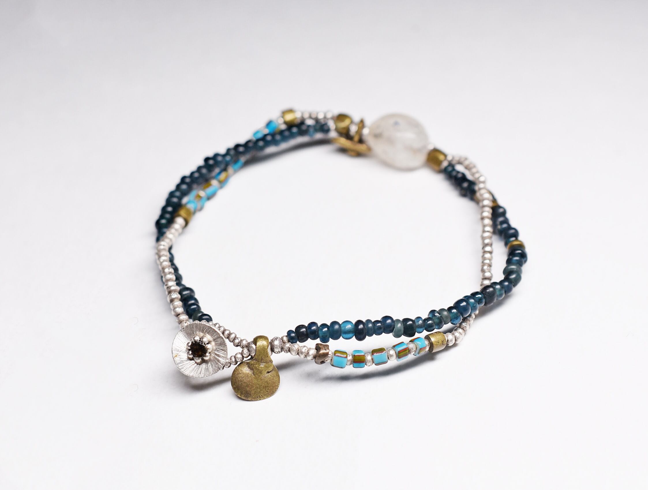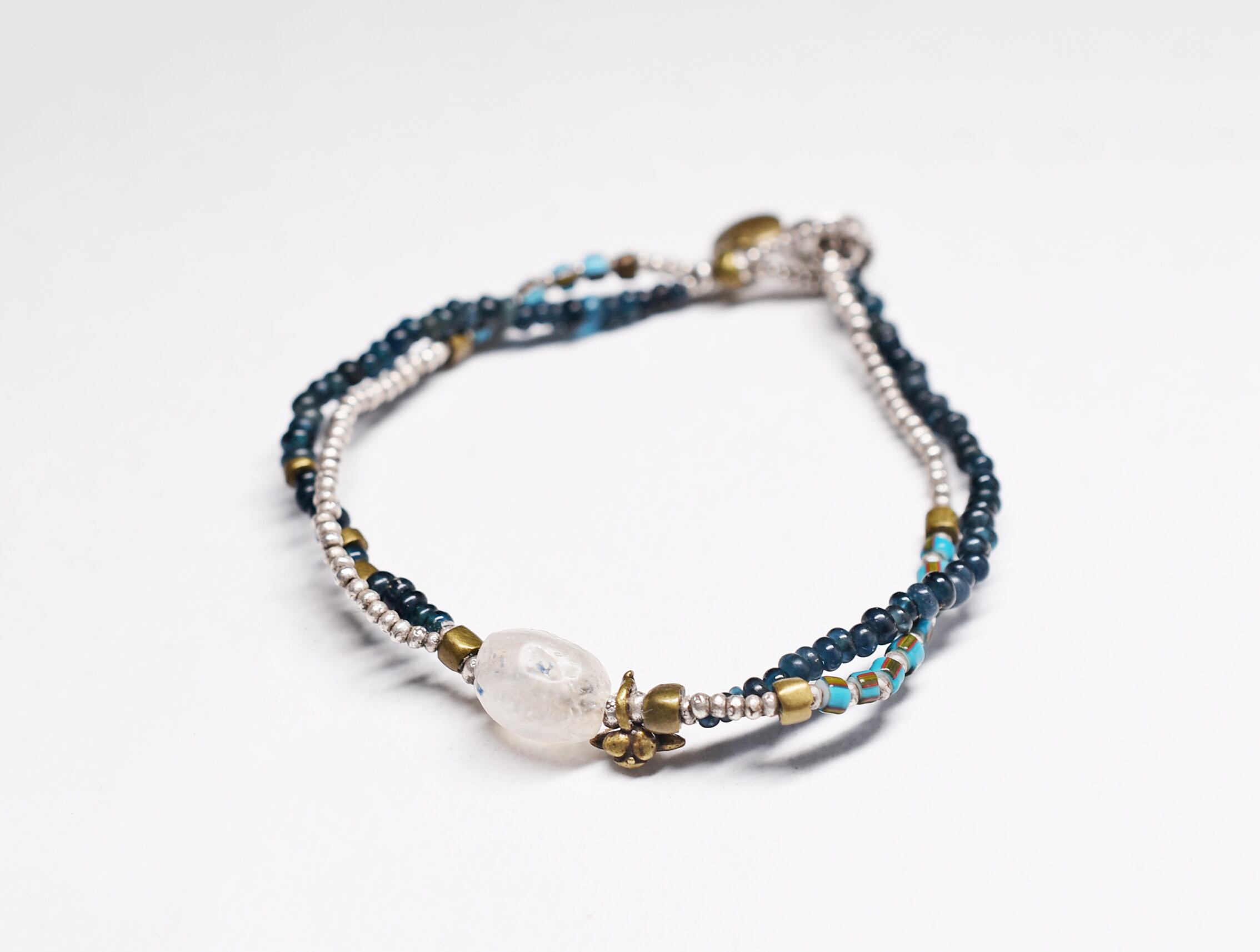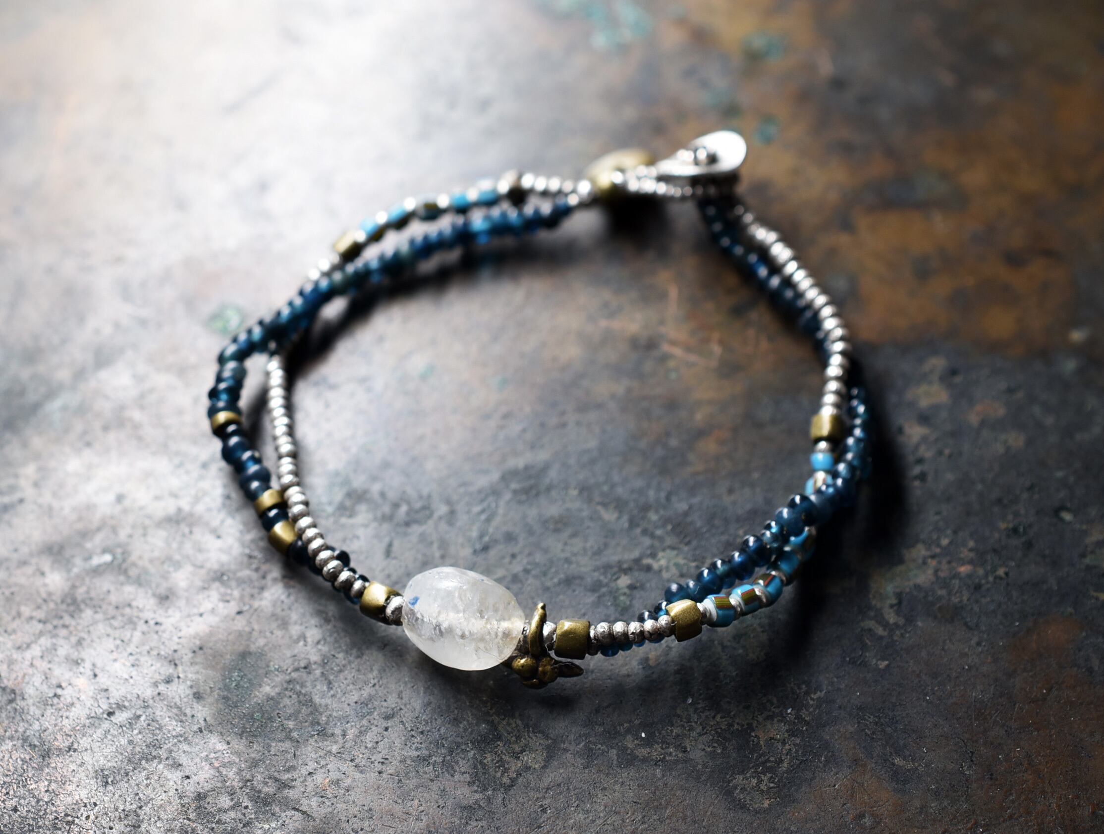 古代水晶と、ターコイズブルーのホワイトハーツとインディゴブルーのアンティークビーズ、小さなカレンシルバーなどを繋いだ2連ブレスです。