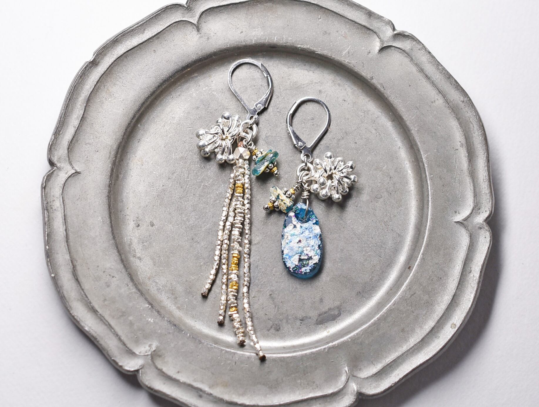 煌めくローマングラスとしゃらりとしたカレンシルバーのアンシメトリーピアス