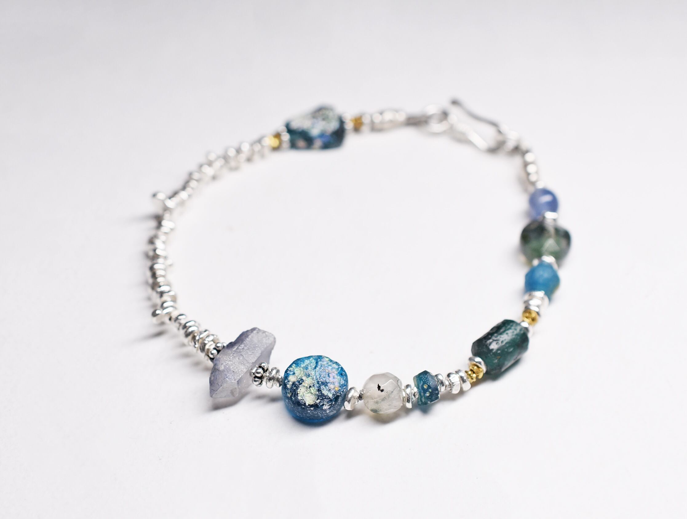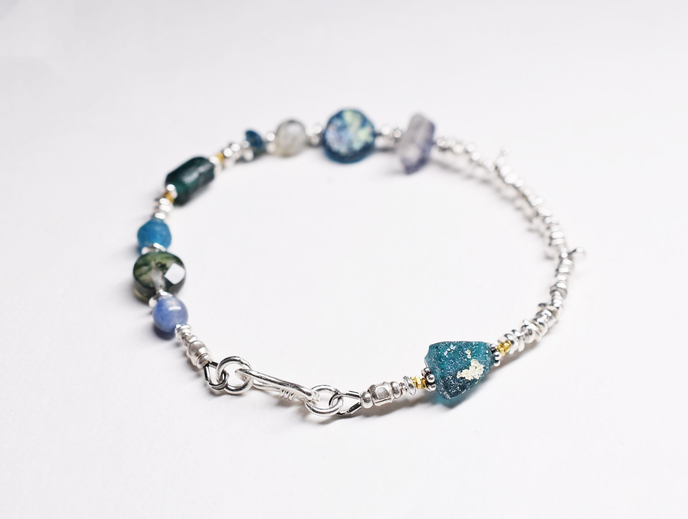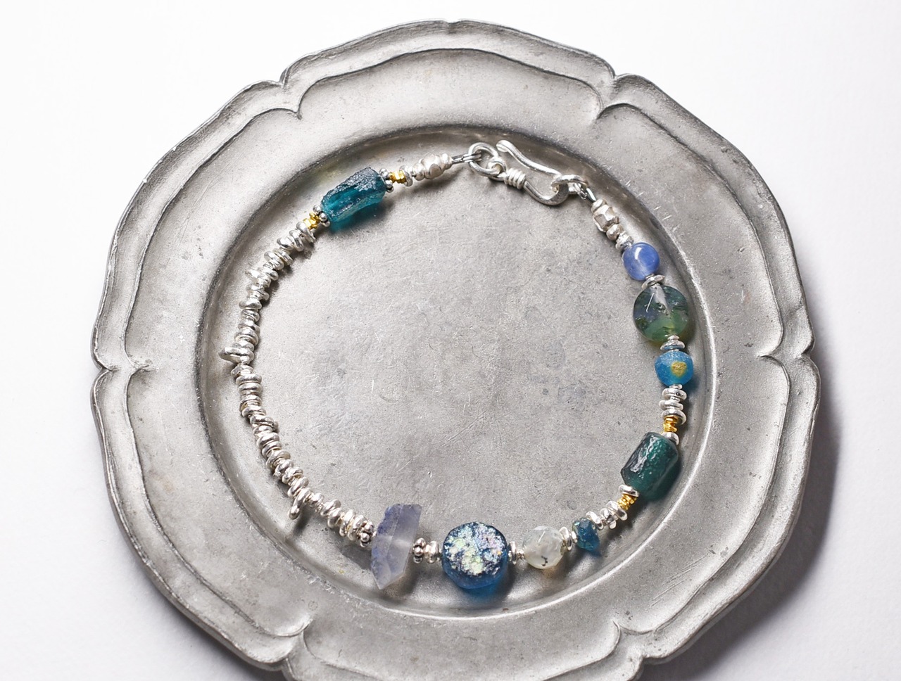 退廃的な雰囲気のローマングラスや天然石と、カレンシルバーの輝きとのコントラストに目を奪われるブレスです。