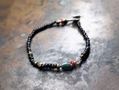 漆黒のビーズをメインに、oldチベタンターコイズ、古代瑪瑙、血赤色のホワイトハーツ、oldオリッサブラスなどを繋いだブレスです。