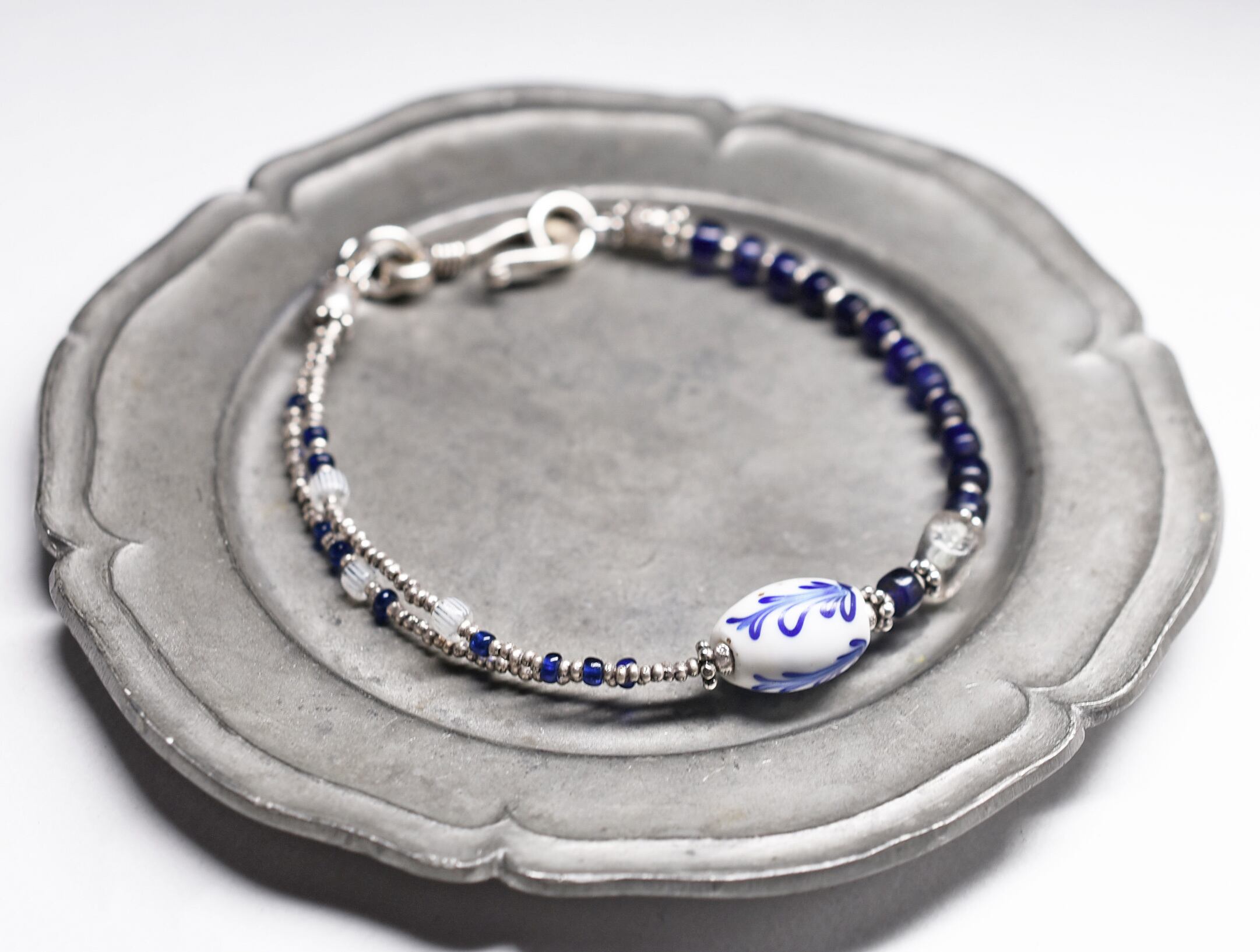 ダッチデルフトと、瑠璃色のアンティークビーズ、小さなカレンシルバービーズなどを繋いだブレスです。